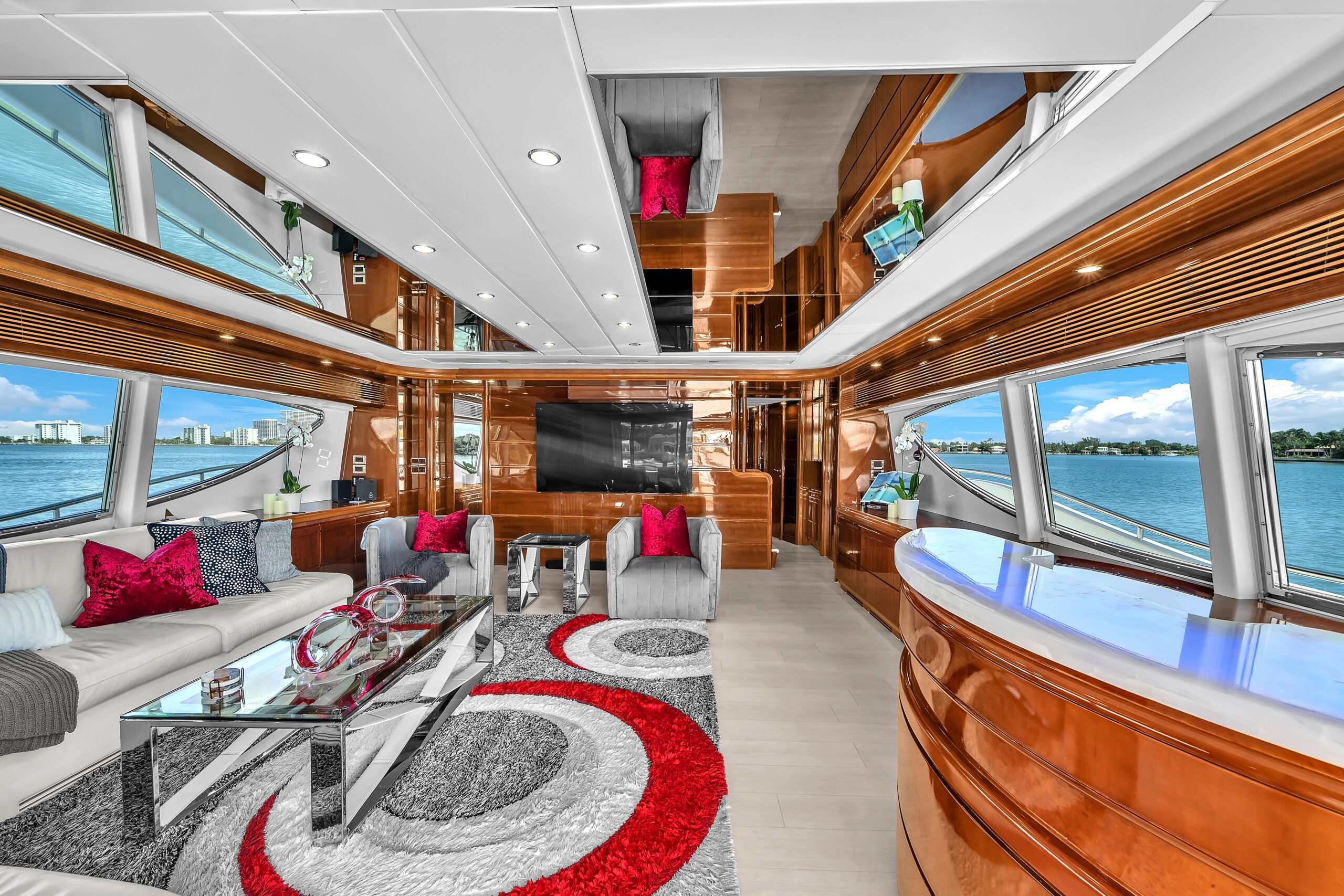 - Полноценный мокрый бар по правому борту с подсветкой столешницы