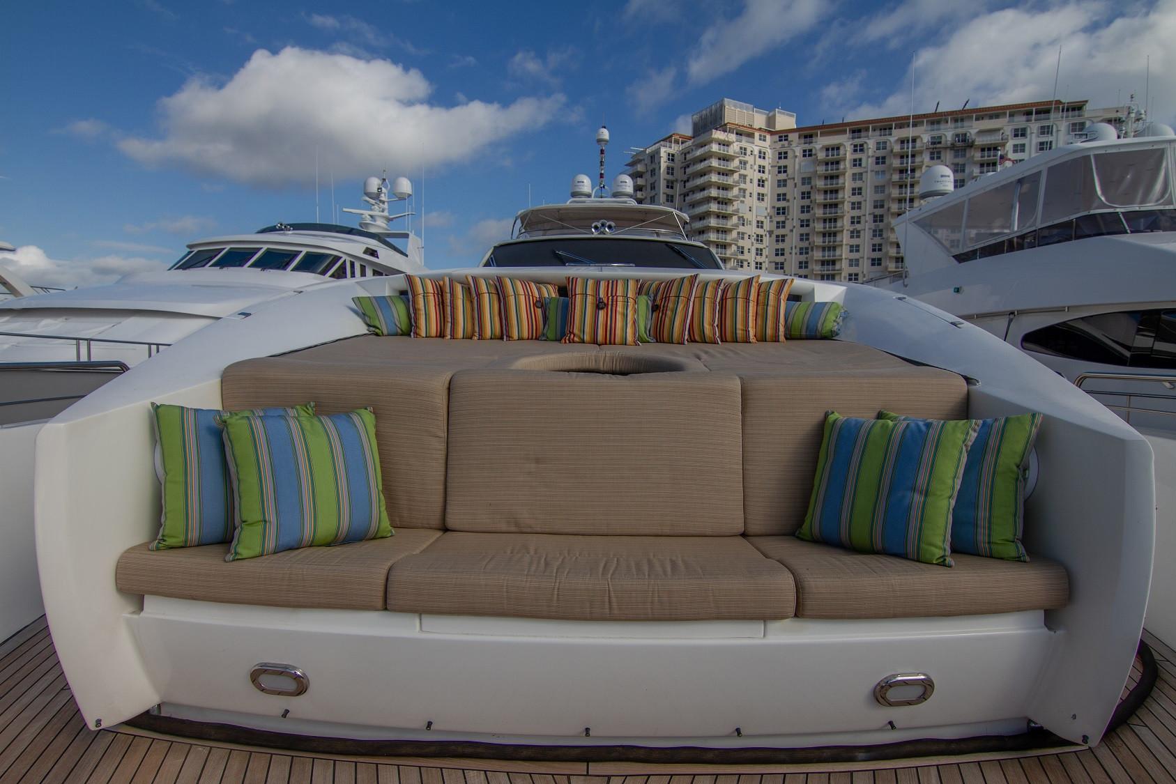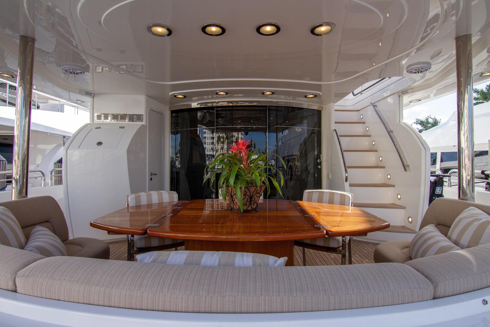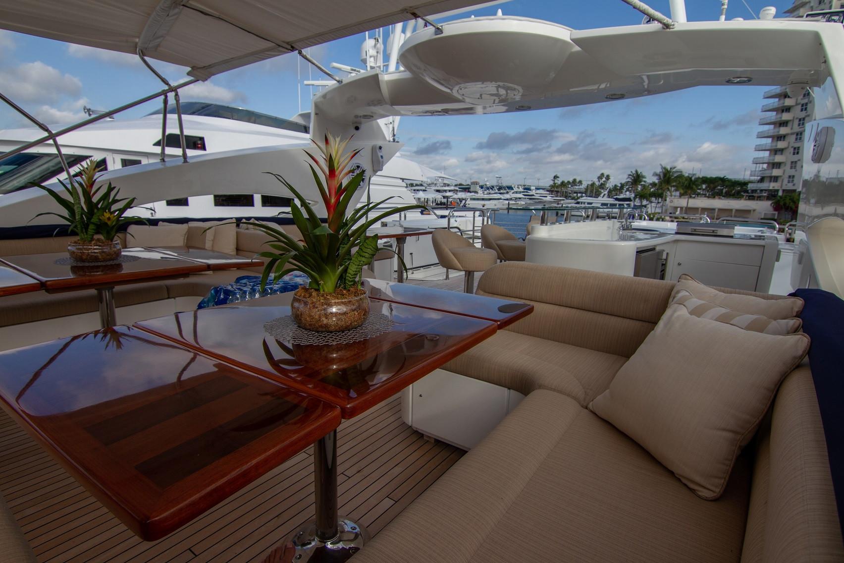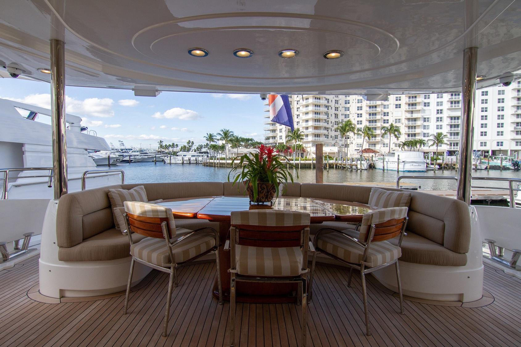 Верхняя палуба и пост управления включают гриль из нержавеющей стали, льдогенератор, холодильник, барную стойку и самое большое SPA-джакузи среди яхт класса 105 футов. Артикулирующий кран по правому борту поднимает гидроцикл на верхнюю палубу для переходов.