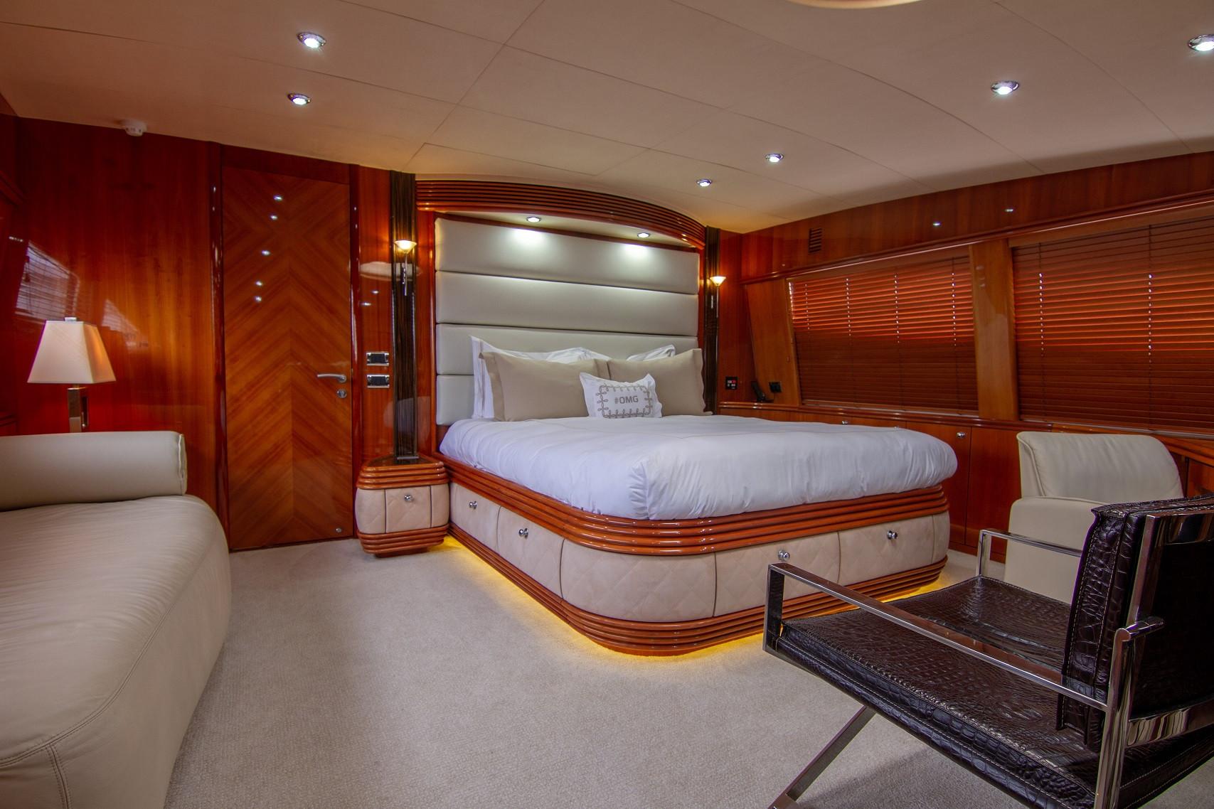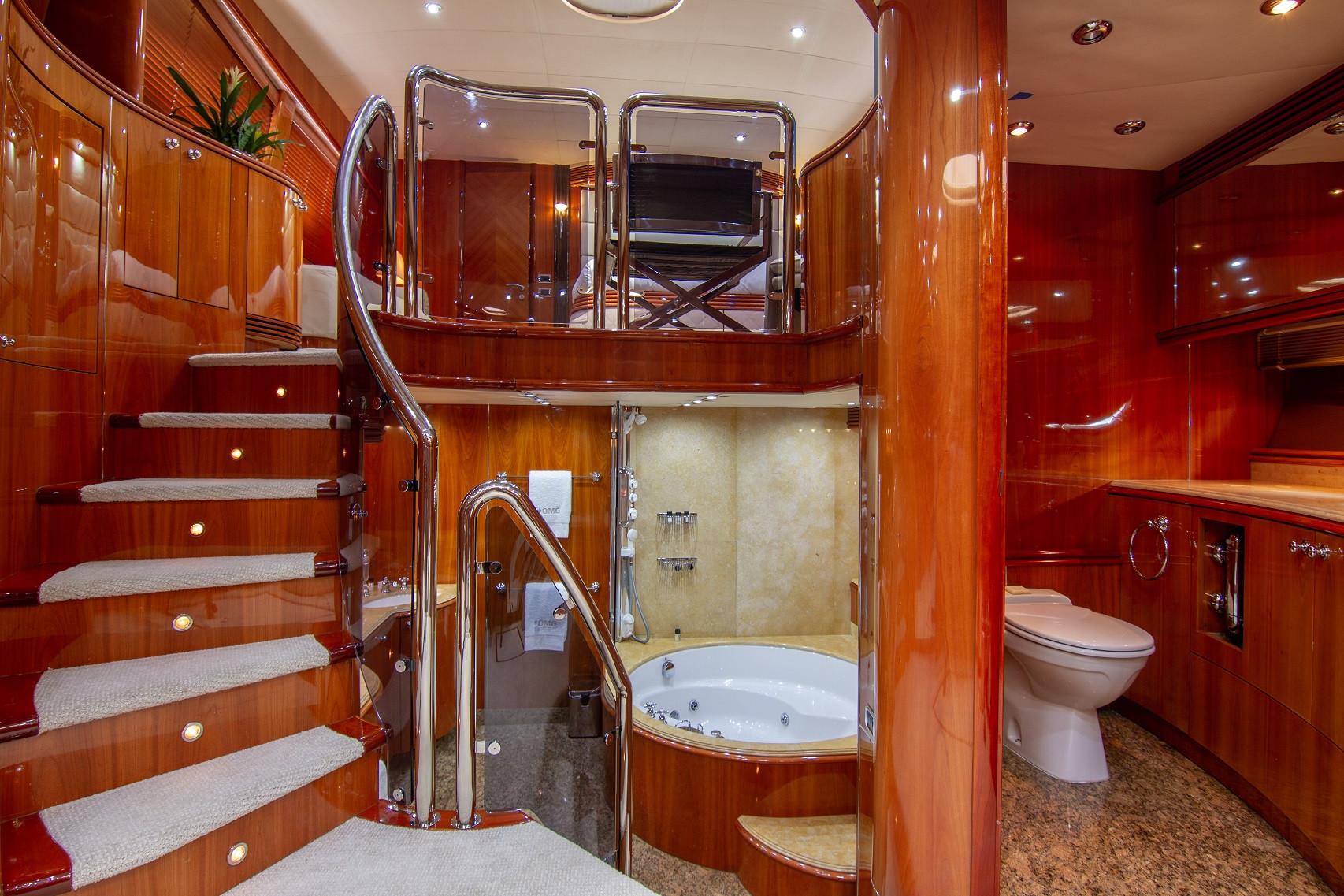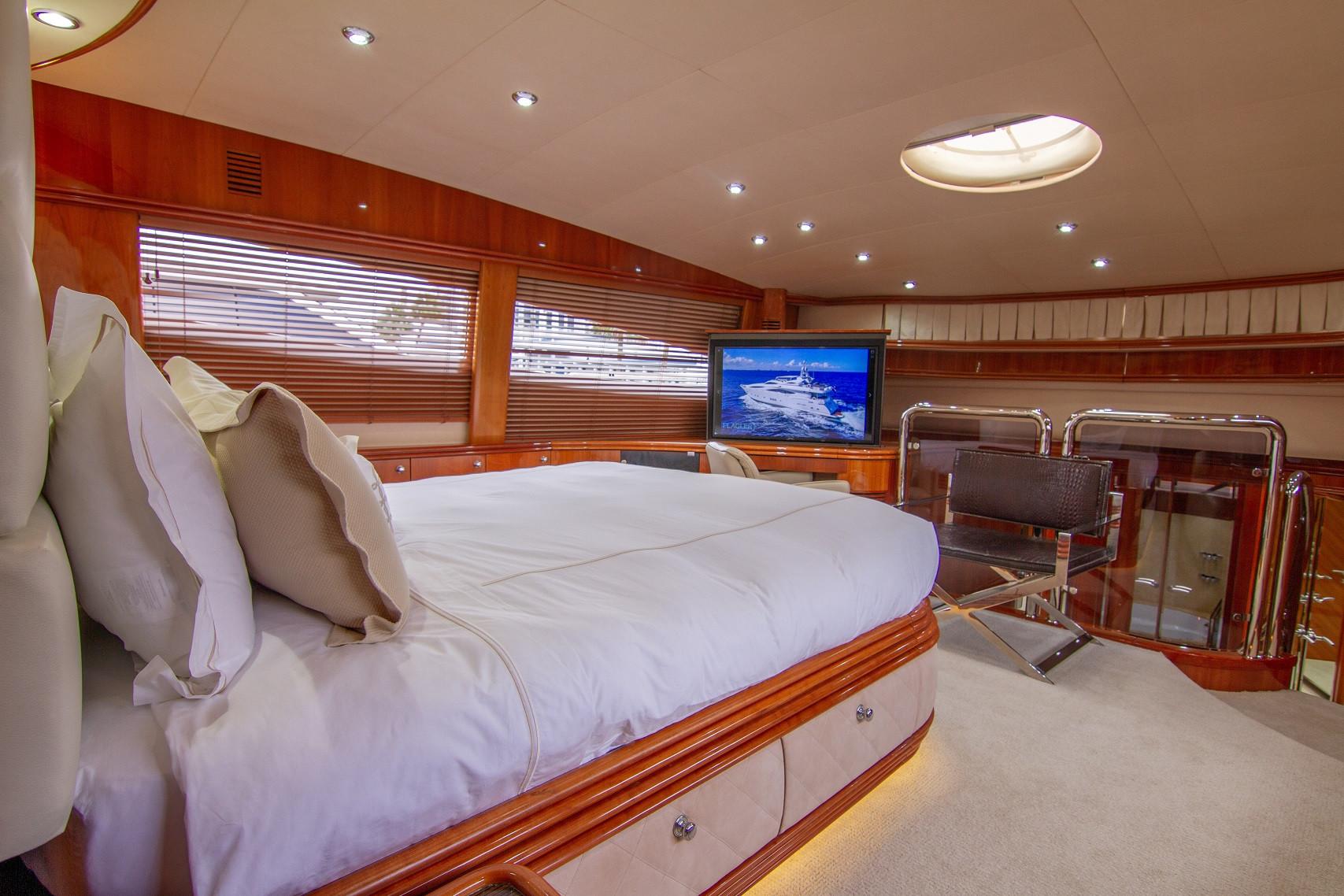 Полноширинная мастер-каюта расположена на главной палубе и оснащена центральной кроватью king-size, мебелью из клёна и выдвижным HD-телевизором. Лестница ведёт вниз в гардеробную зону с обширными местами хранения и роскошный мастер-санузел с большой джакузи, душевой и отдельной туалетной зоной с биде.