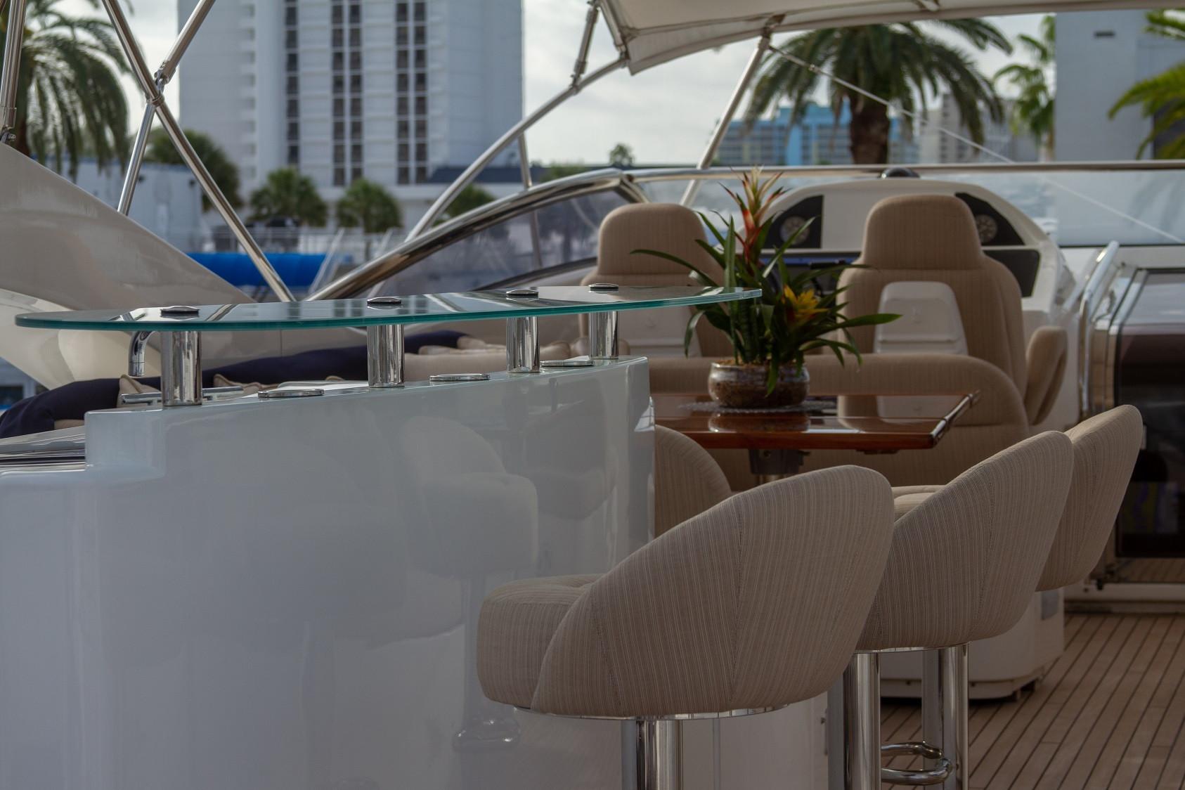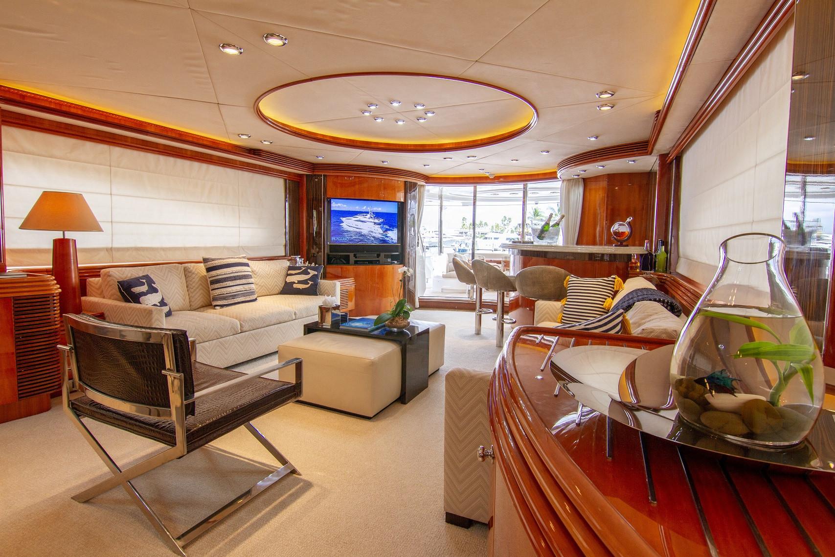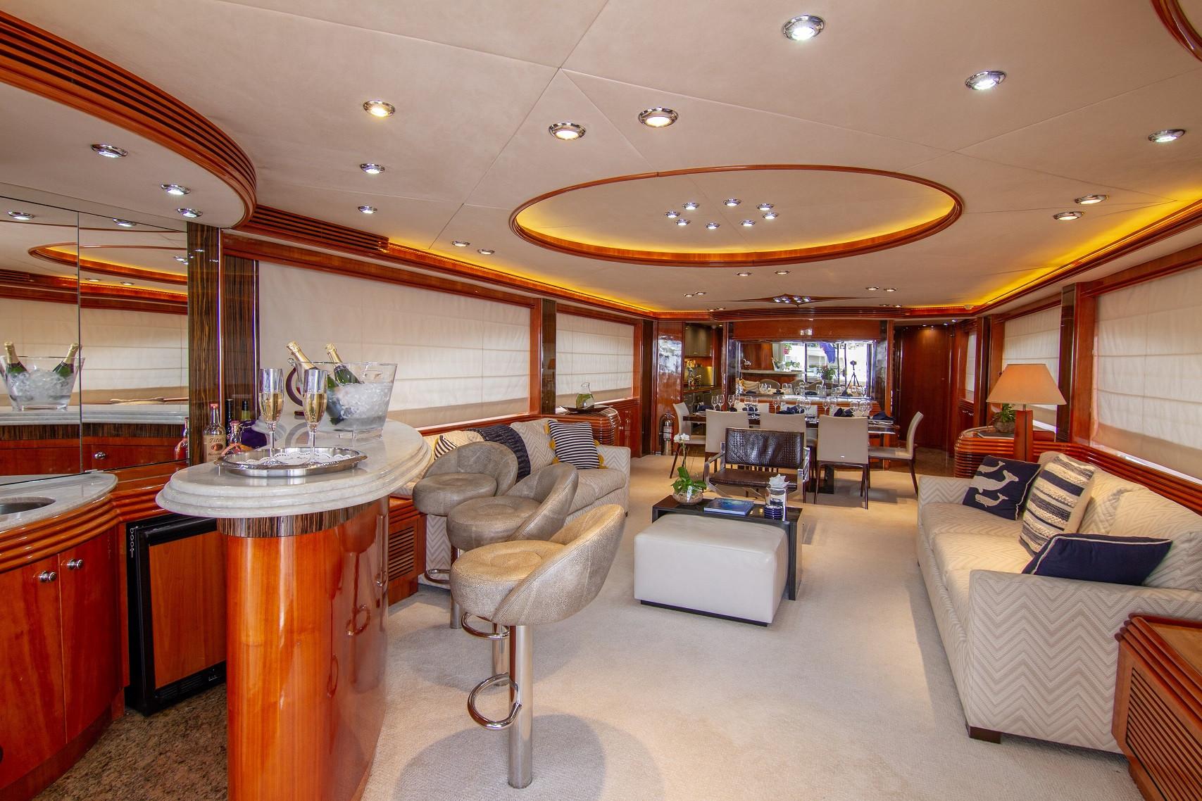 Через большие раздвижные стеклянные двери вы попадаете в просторный салон с современным интерьером, обновлённым в ходе масштабного рефита. Здесь предусмотрены удобные зоны отдыха, бар для коктейлей и обеденный стол на восемь персон. Просмотр фильмов или спортивных событий обеспечивается HD-телевизором, а звук — аудиосистемой Control4 мощностью 6000 Вт с управлением через iPad или смартфон.