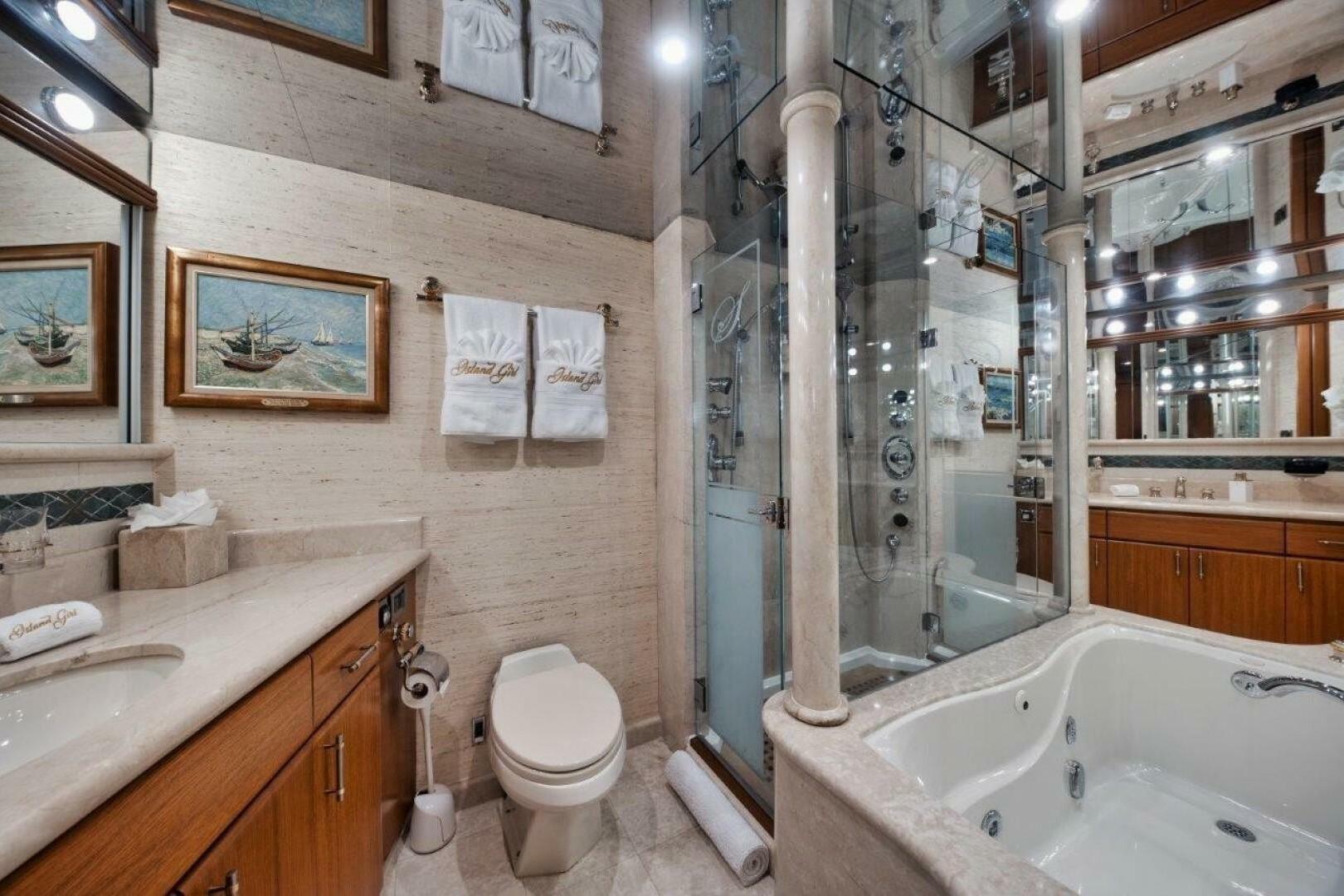 Для комфортного хода Island Girl оснащена двумя двигателями MTU 12V2000 мощностью по 1 850 л.с. каждый, прошедшими полный капитальный ремонт на 6 000 моточасах. Для повышения устойчивости установлены стабилизаторы Naiad, а два опреснителя Aqua Whisper обеспечивают автономность в море. Генераторы Northern Lights мощностью 50 кВт и 65 кВт гарантируют надёжное электроснабжение, поддерживая работу всех бортовых систем.