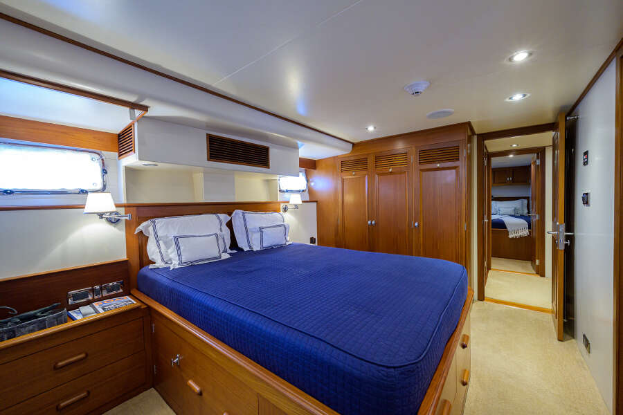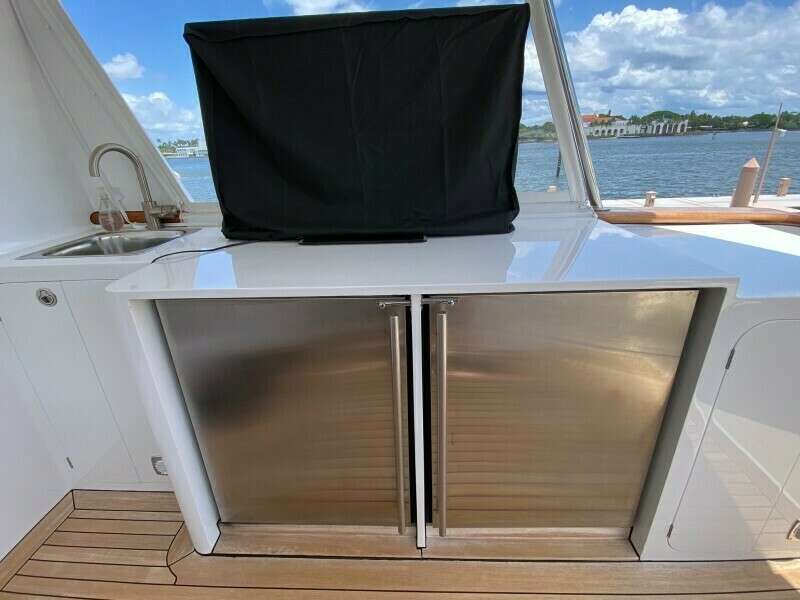 Войдите в закрытую рулевую рубку, где климат-контроль обеспечивает комфорт при управлении. Мостик, напоминающий решения на крупных судах, предлагает отличную обзорность, логичную компоновку электроники и роскошные кресла Stidd для капитана и гостей. Дневной санузел, большой телевизор, штурманский стол и мягкая зона отдыха располагают к расслаблению внутри, а дверь ведёт на просторную кормовую площадку мостика (aft bridge deck) для отдыха на свежем воздухе. Далее — зона для обедов/развлечений под открытым небом со столом, сиденьями и удобствами: ТВ, мойка и холодильное хранение.
