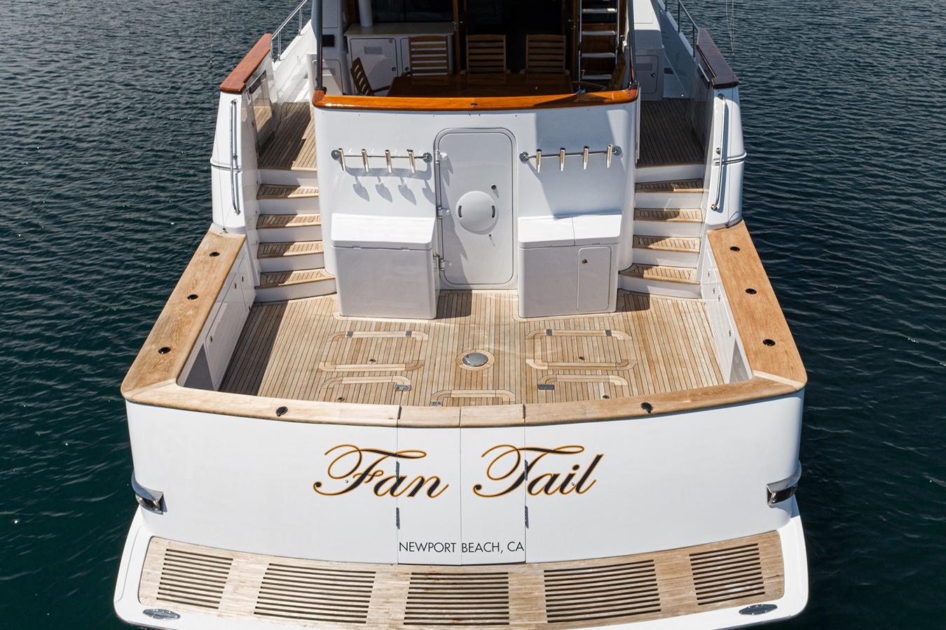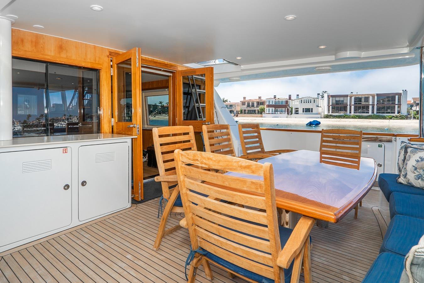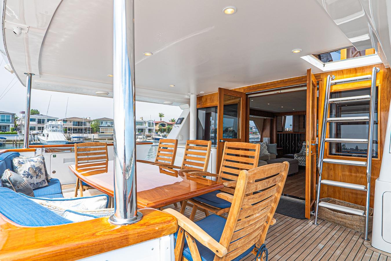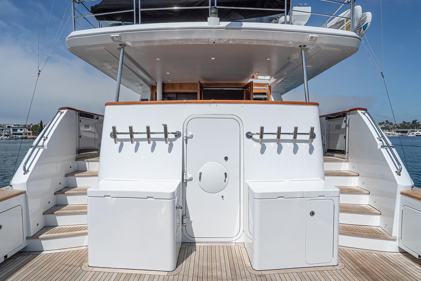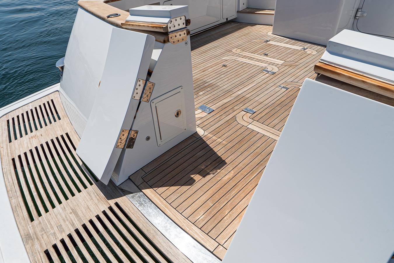 Кормовая палуба: Просторная зона с большим встроенным диваном в корме, тиковым обеденным столом и стульями. По левому борту в носовой части расположен встроенный мокрый бар с мойкой и холодильником. Над баром установлен телевизор. По правому борту находится лестница с выходом на флайбридж. Вход в салон через двойные лакированные тиковые двери. Посты управления закрыты люками и расположены по левому и правому бортам в носовой части. Зона хорошо защищена навесом флайбриджа.