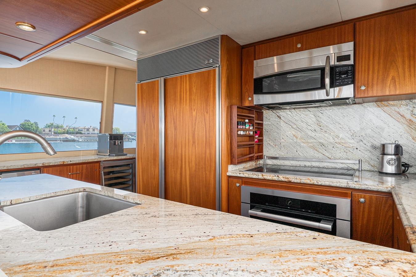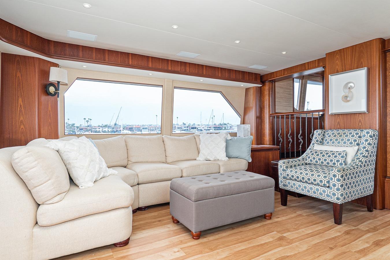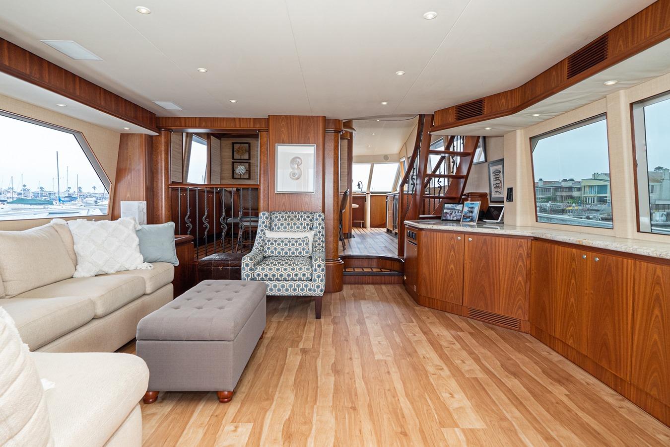 Интерьер: Просторный салон с большими окнами и множеством мест хранения. В кормовой части по левому борту расположен большой диван с журнальным столиком. Напротив, по правому борту, установлен телевизор на подъёмном электроприводе, мультимедийное оборудование размещено в шкафах ниже. В носовой части салона по левому борту находится формальная обеденная зона со столом и посадочными местами на 6 человек. По обеим сторонам салона и обеденной зоны предусмотрены вместительные встроенные шкафы. По правому борту расположен проход с холодильными ящиками, ледогенератором и винным шкафом. Камбуз находится по левому борту и оснащён холодильником/морозильником Sub-Zero и всей кухонной техникой. Камбуз открытого типа с большими окнами и дверью. В носовой части расположена вторая обеденная зона с барными стульями и гранитной столешницей.