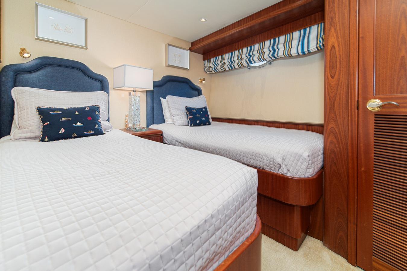 Гостевые каюты: Доступ осуществляется по лестнице по правому борту из зоны камбуза. В кормовой части расположена мастер-каюта на всю ширину корпуса с кроватью king-size по центру, большим количеством шкафов и ящиков, санузел с душем находится в носовой части по правому борту. В санузле мастер-каюты имеется ванна. Каюта по левому борту оснащена одиночными койками по левому и правому бортам. Санузел общий, доступен из коридора и может использоваться как дневной. VIP-каюта расположена в носовой части, с кроватью queen-size по центру, санузел с душем — в кормовой части по правому борту. Хорошие места хранения в шкафах и ящиках, телевизор установлен в кормовой части. Стиральная и сушильная машины размещены в гостевом коридоре по правому борту.