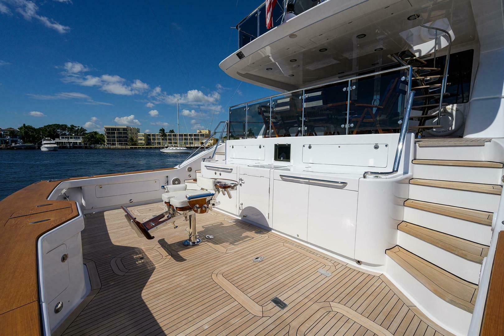 В корму из салона через сдвижную дверь с пневмоприводом — кормовая палуба. Палуба — тик; большой тиковый стол на двойных хромированных стойках с инкрустациями, шесть тиковых стульев с подушками и чехлами. В потолке по левому борту — откидной телевизор. В носовой части по левому борту — большой двухсекционный кастомный холодильник/морозильник Frigibar. По правому борту — изогнутая лестница из нержавейки и тика на кормовую часть флайбриджа. По обоим бортам — калитки для посадки, а также тик-ступени с поручнями из нержавейки вниз в кокпит.