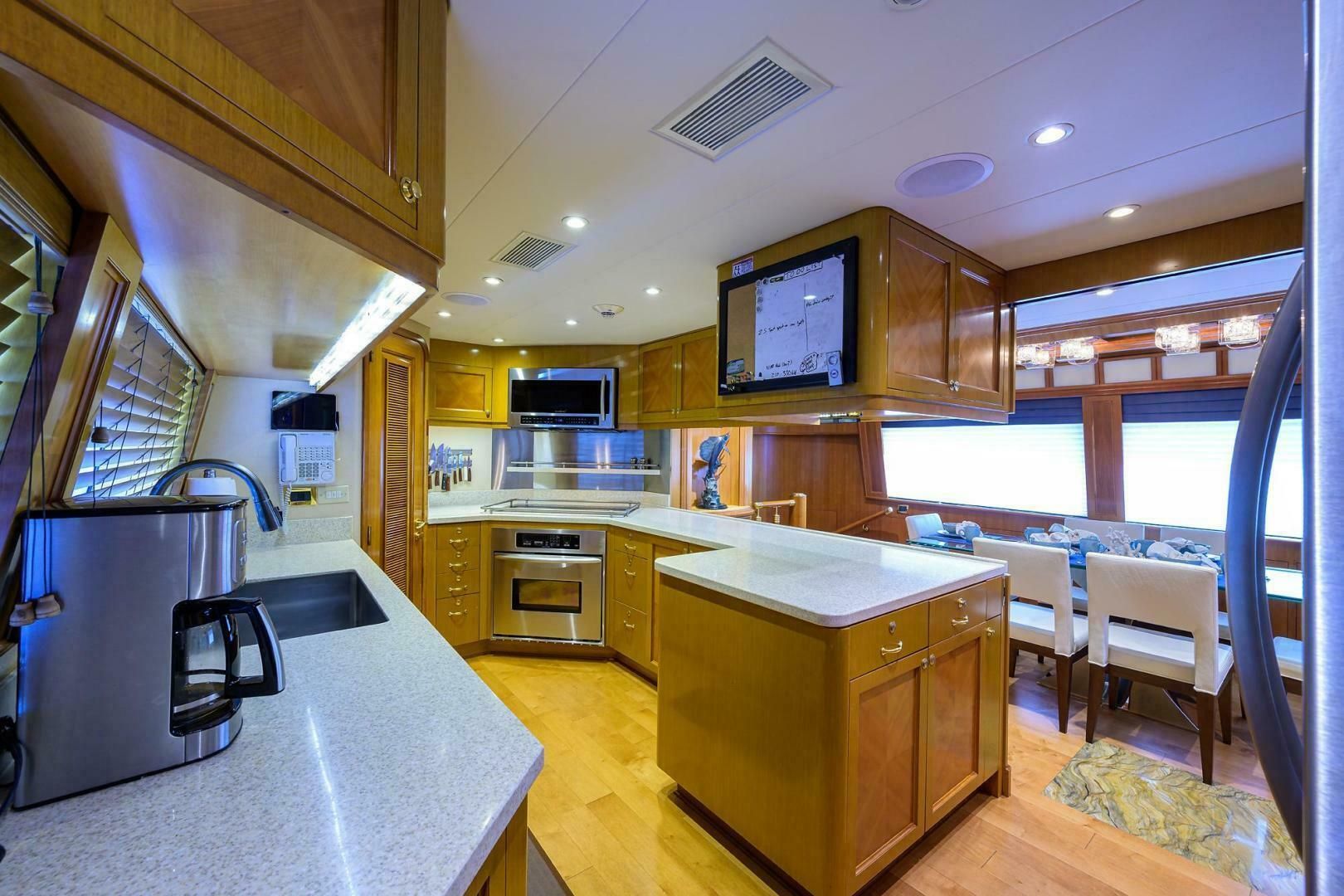 В салоне — большой полноразмерный бар с четырьмя барными стульями (в кормовой части по правому борту). По левому борту — большой Г-образный диван (с местами хранения под сиденьями), журнальный столик и кресло с индивидуальной обивкой. На передней переборке салона по левому борту — крупная картина в раме: по нажатию кнопки она поднимается, открывая 60" Samsung Smart TV. Управление A/V, аудиосистемой и освещением — через iPad. Полы в салоне и на флайбридже — деревянные с мраморными инкрустациями. Несколько уровней освещения и плиссированные жалюзи на окнах надстройки создают красивую атмосферу. Вперёд по правому борту — винтовая лестница на флайбридж, по левому борту — хорошо оборудованный дневной санузел. Далее по левому борту — огромный полностью оснащённый камбуз, по правому борту — обеденная зона со стеклянным столом и шестью кожаными стульями (места до восьми человек). Изогнутая лестница ведёт вниз в каютную зону и коридор.