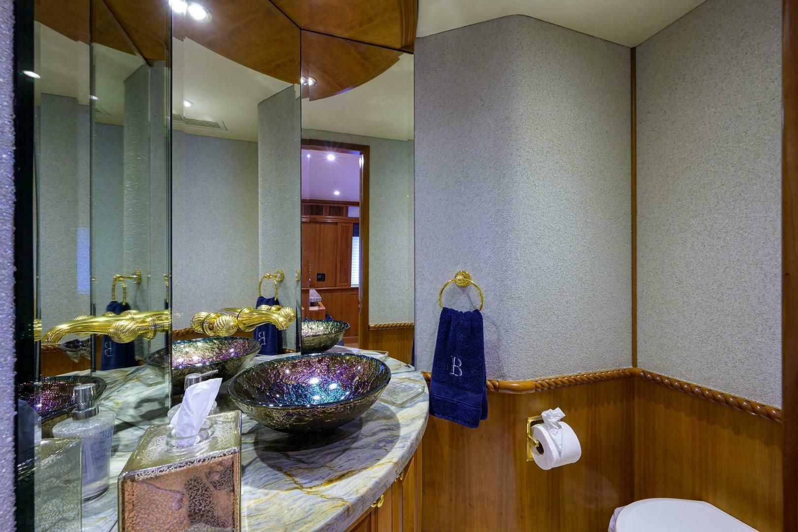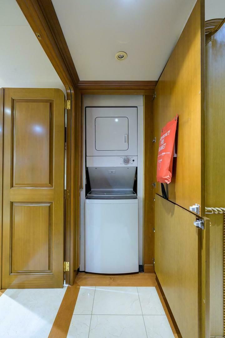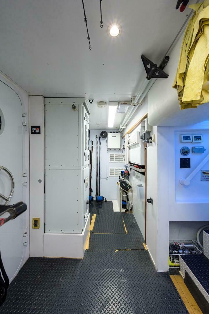 Каюты экипажа находятся ниже, перед машинным отделением. Доступ возможен по лестнице из камбуза либо через дверь из МО со стороны кокпита. Здесь две каюты и большой хорошо оборудованный санузел. В одной каюте — верхняя/нижняя полноразмерные койки, рабочая зона с библиотекой и руководствами по системам судна, шкаф, ящики и настенный Samsung TV. Во второй каюте — двуспальная кровать, TV, шкафы и ящики, а также откидная дополнительная койка Pullman (при необходимости). Между каютами — шкаф/тумба с дополнительной стирально-сушильной колонной Whirlpool и большим кладовым шкафом. Для приватности экипаж может выходить через кормовую дверь машинного отделения.
