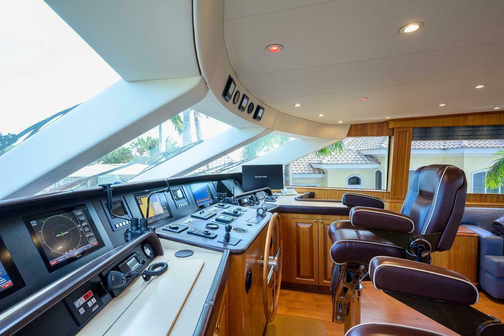 На закрытом флайбридже пост управления расположен в носовой части и оснащён обширным комплектом навигационной электроники. Два больших капитанских кресла Stidd на хромированных стойках — из коричневого кожзама с белой декоративной окантовкой. Деревянный пол, как в салоне, проходит по всей площади флайбриджа. В кормовой части по правому борту — большой Г-образный кожаный диван и оттоманка. По левому борту за креслами рулевого — деревянный шкаф с подъемным телевизором Samsung 50". Ещё дальше в корму — барная зона с мраморной столешницей и мойкой; ниже — холодильник из нержавеющей стали и стекла, льдогенератор и места хранения. В корме — дверь из нержавеющей стали и стекла на верхнюю кормовую палубу. По сути, флайбридж настолько большой и удобный, что это «второй салон».