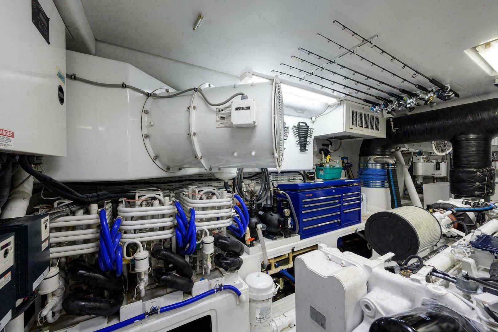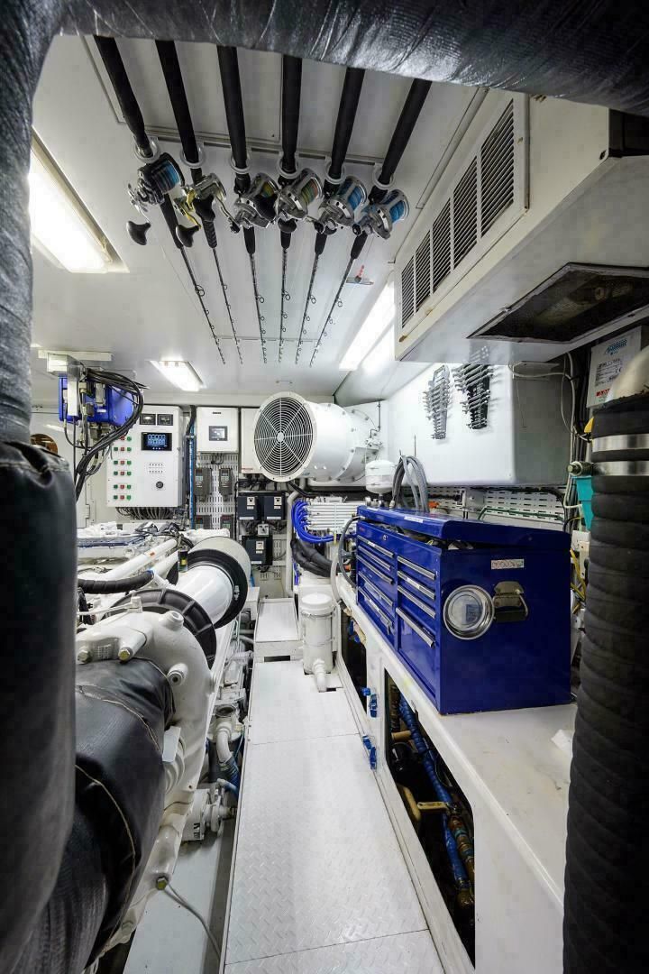 Кокпит и планширы — тик. В транце — подсвечиваемый лайвелл (живорыбный колодец) с фронтальным стеклянным окном. Также установлено боевое кресло Murray Brothers с ракетницей (rocket launcher), лотком для оснастки, ящиком и чехлом. На передней переборке кокпита по левому борту — электрический гриль Jenn-Air в стеклопластиковом шкафу с подъемной крышкой. По правому борту — аналогичный шкаф с большим «бэйт-фризером» (внутри нержавейка) и тремя съёмными нержавеющими лотками для наживки. Двухстворчатая дверь в МО расположена по центру: прямой доступ в электрическую/контрольную зону и далее через водонепроницаемую дверь — в машинное отделение. Вперёд в МО — ещё одна водонепроницаемая дверь в зону кают экипажа.
