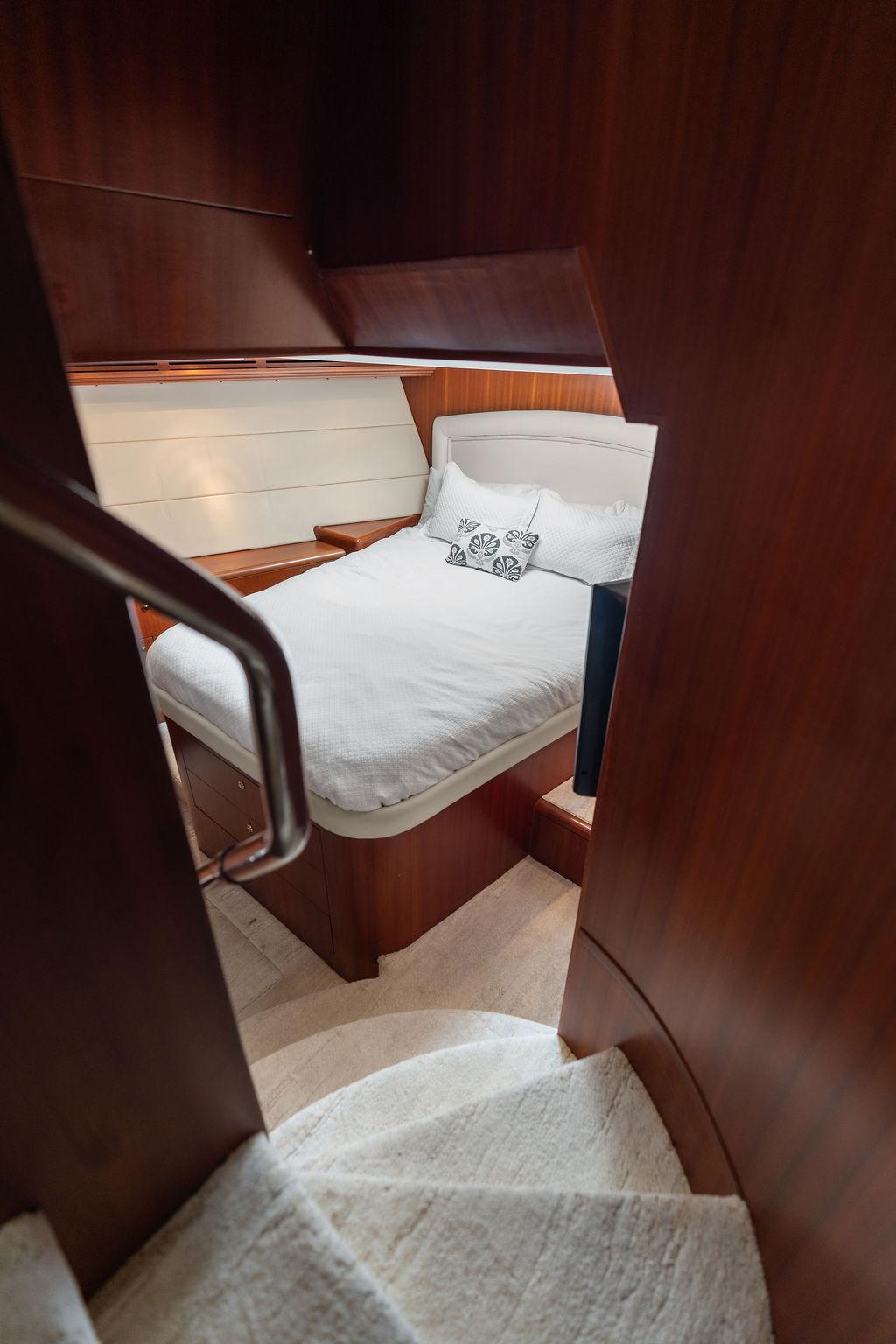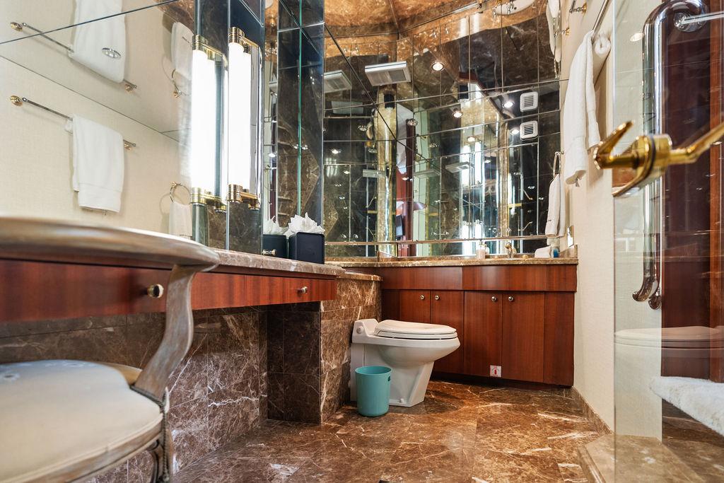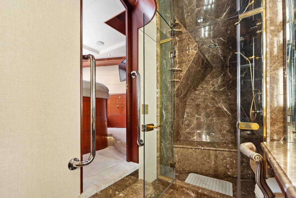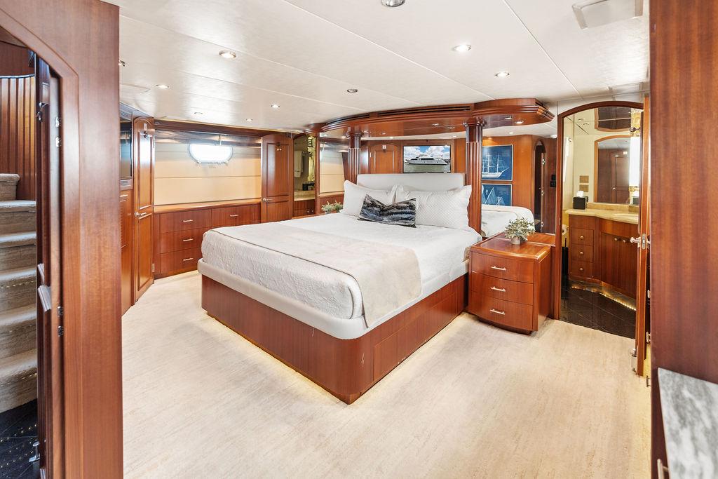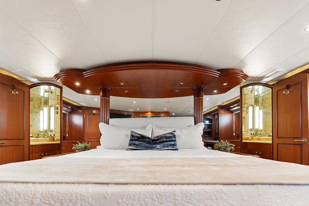 Роскошная мастер-каюта оснащена арочными двойными входными дверями, кроватью king-size, гардеробными по левому и правому борту, а также просторной ванной комнатой с джакузи. В нижнем фойе расположен кофейный бар с холодильником и большая прачечная с вертикальной стиральной и сушильной машинами, местами хранения и гладильной доской.