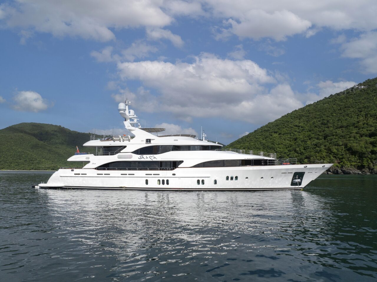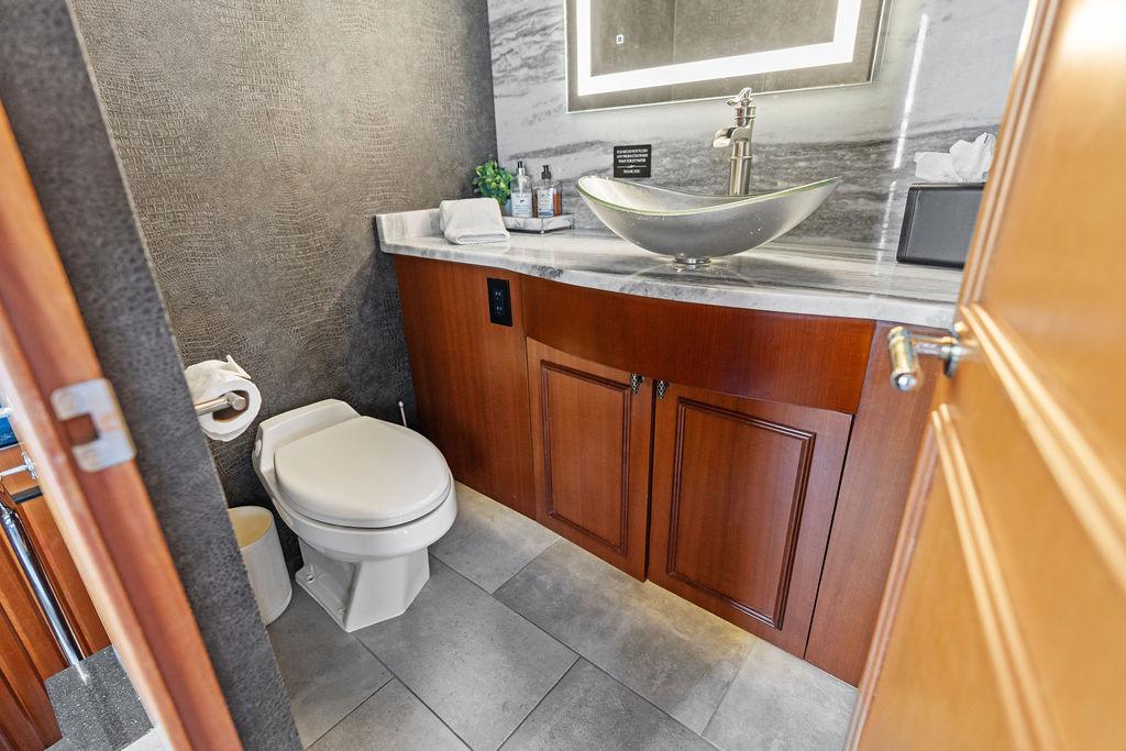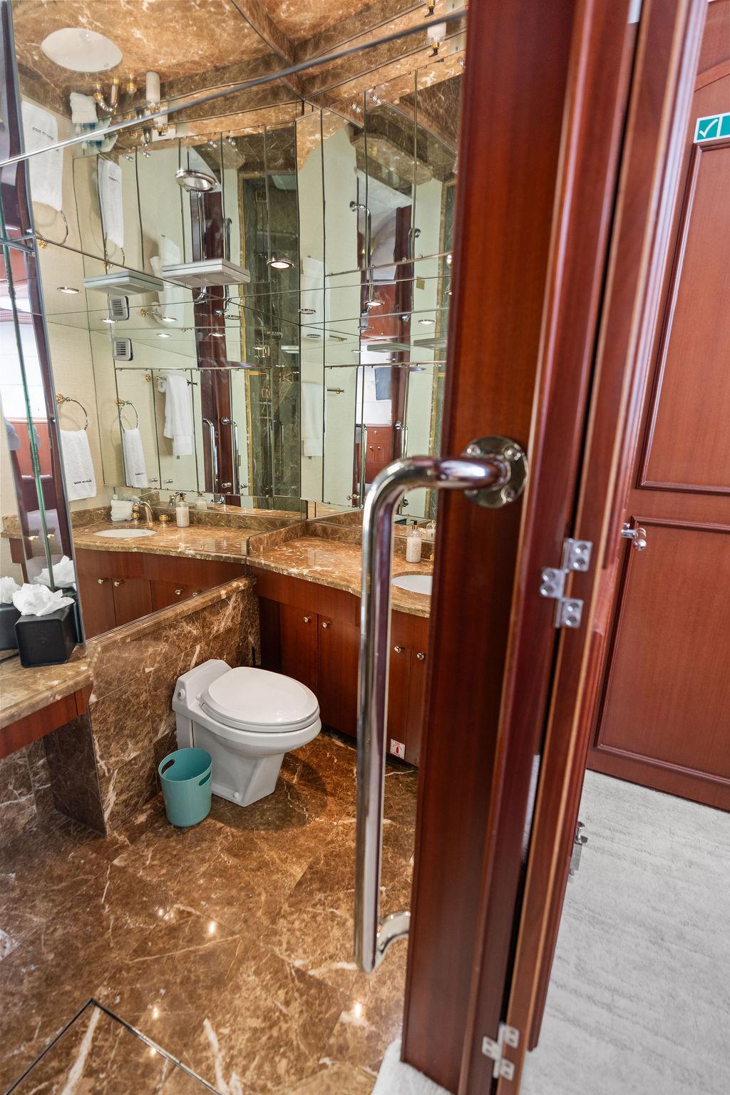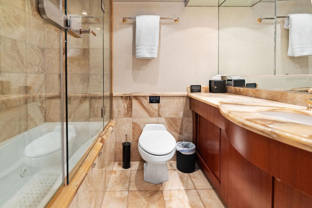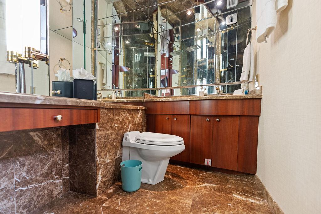 Роскошная мастер-каюта оснащена арочными двойными входными дверями, кроватью king-size, гардеробными по левому и правому борту, а также просторной ванной комнатой с джакузи. В нижнем фойе расположен кофейный бар с холодильником и большая прачечная с вертикальной стиральной и сушильной машинами, местами хранения и гладильной доской.