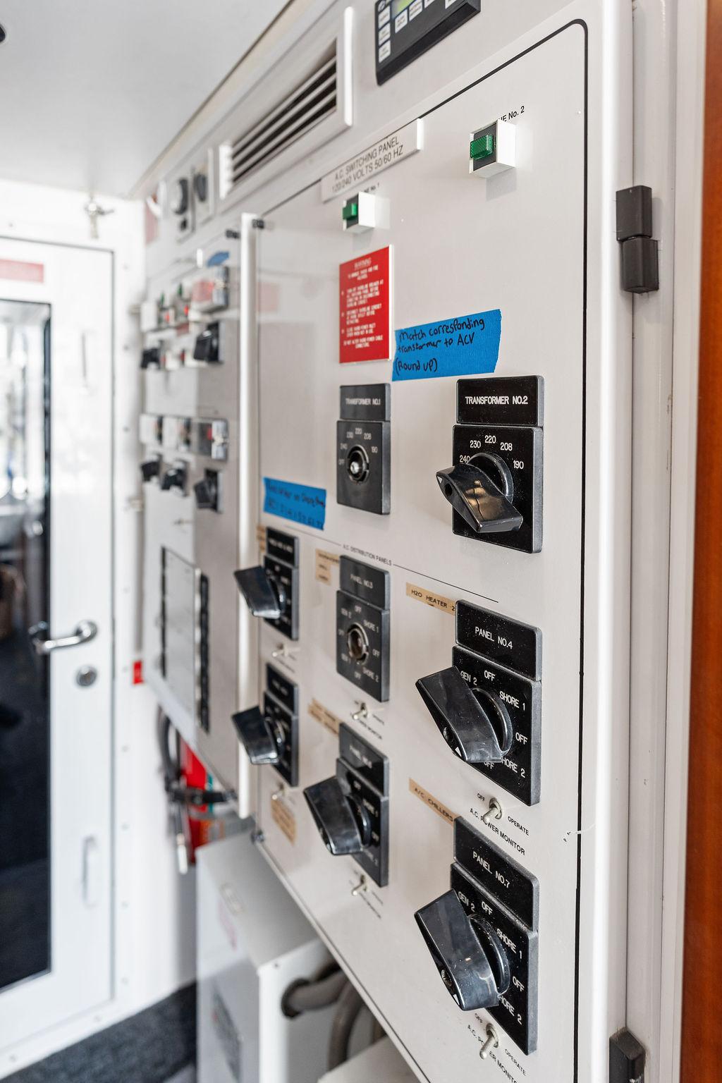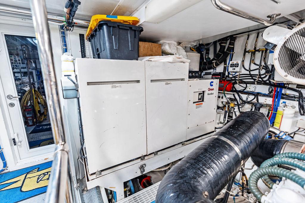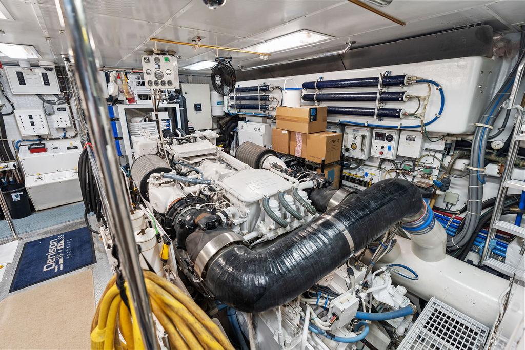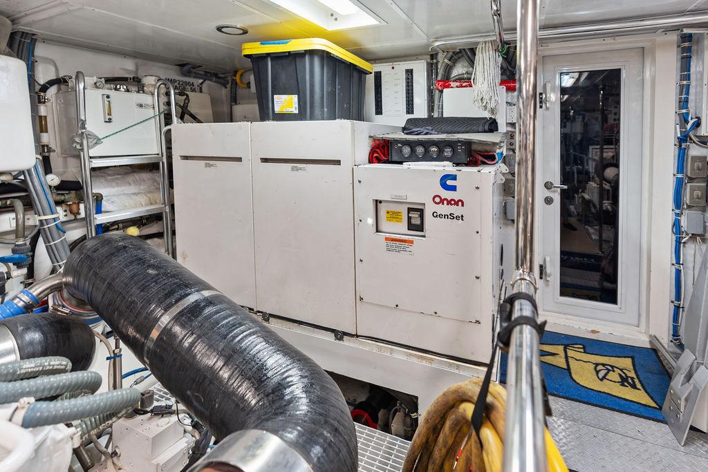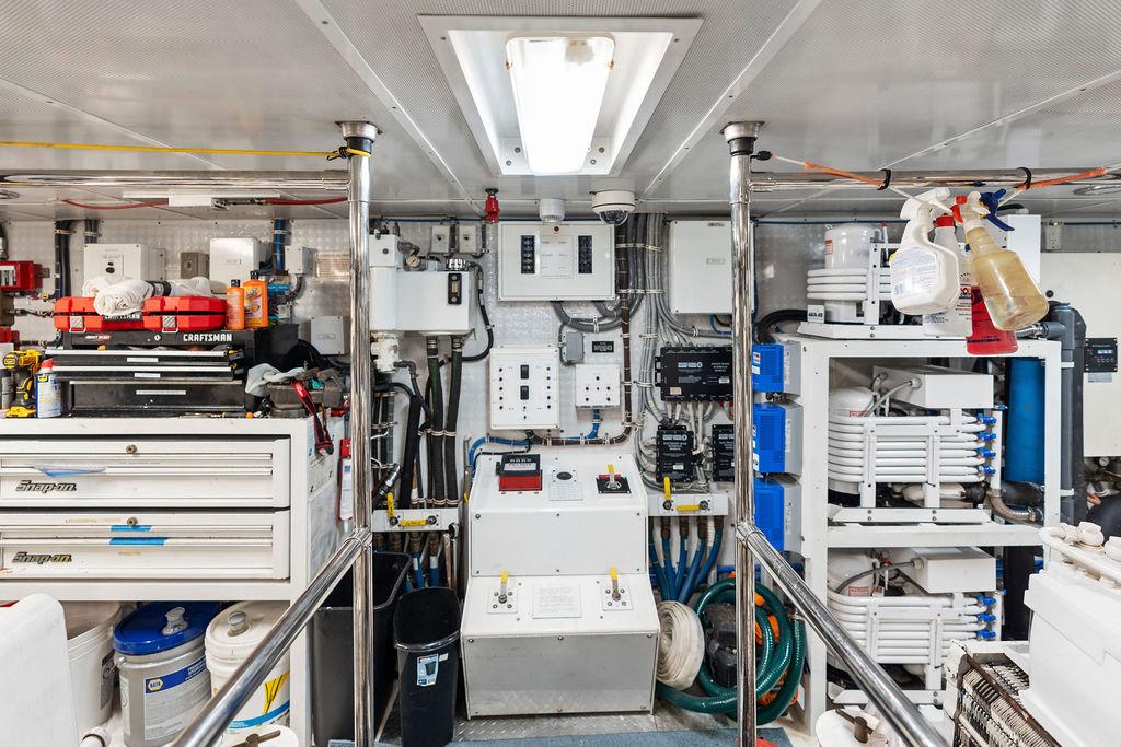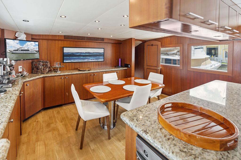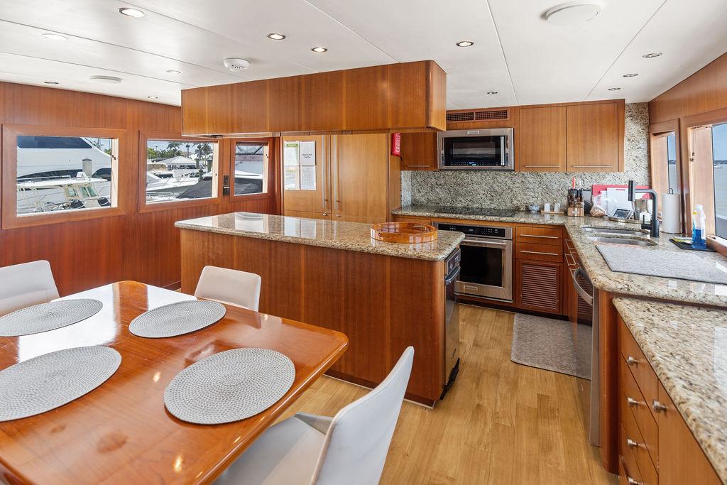 Камбуз полностью оборудован: два холодильника/морозильника Sub-Zero с льдогенераторами, варочная панель на четыре конфорки, конвекционная духовка, комбинированная микроволновая/конвекционная печь, измельчитель отходов, посудомоечная машина, пресс для мусора, винный холодильник, а также обширные рабочие поверхности и системы хранения.