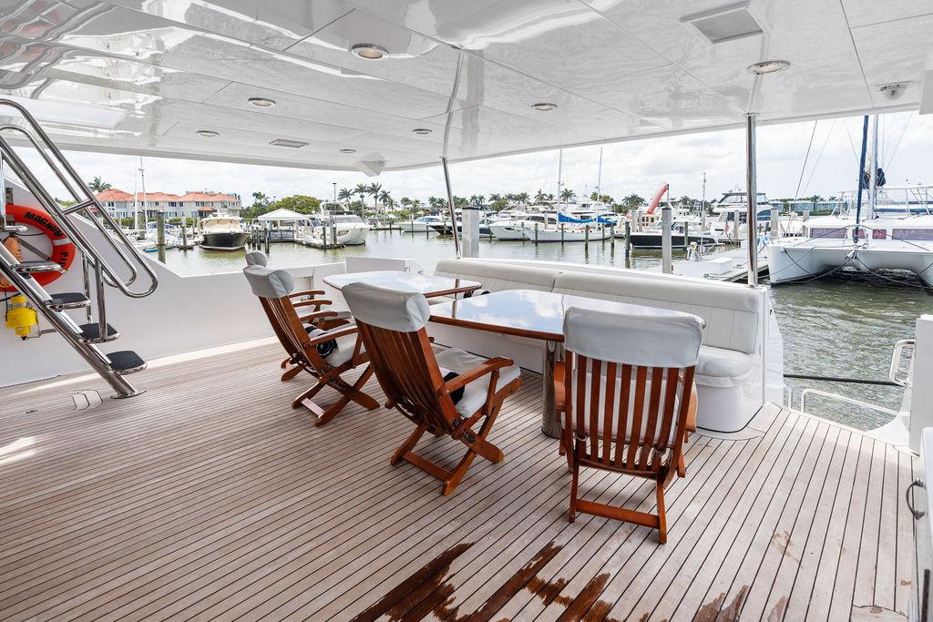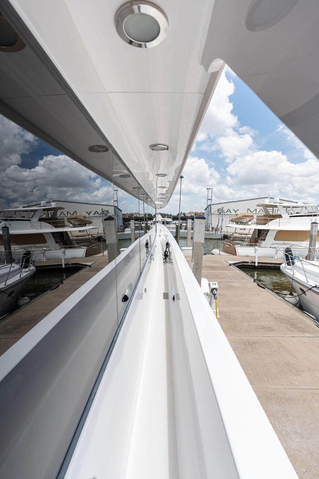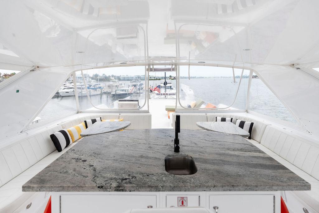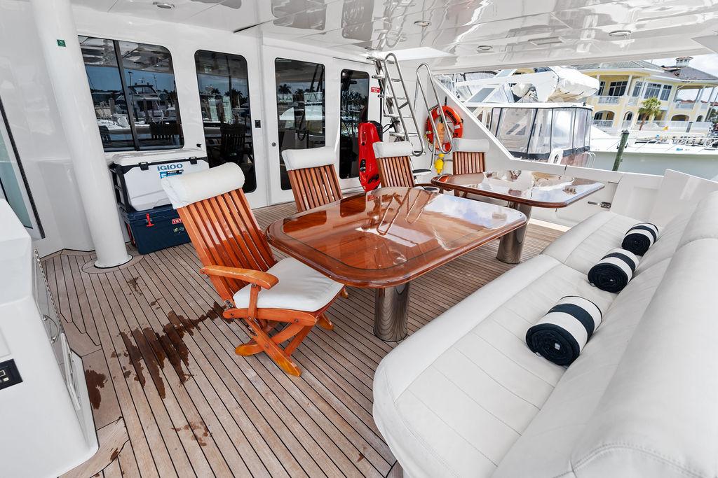 Для гостей и семьи предусмотрена П-образная зона отдыха на палубе с мокрым баром, холодильником и льдогенератором. В стандартную комплектацию входят полностью гидравлический кран-давит, тендер Novurania с кильблоками и спасательный плот с гидростатическим сбросом.
