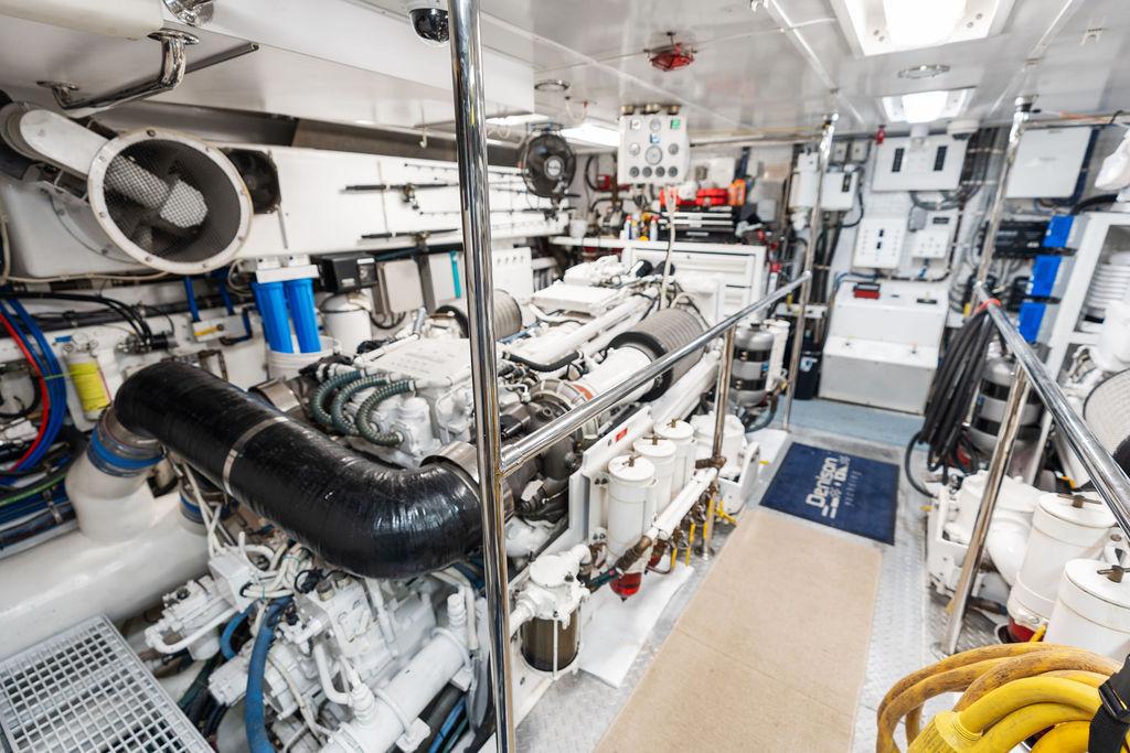 Салон оснащён гостевым санузлом, угловым диваном, журнальным столиком, приставным столиком и двумя креслами. Система кондиционирования воздуха проходит над деревянными карнизами, обеспечивая равномерный климат-контроль по левому и правому бортам. Развлекательное оборудование включает плазменный телевизор, аудиосистему с CD, DVD-плеер, а также утопленный бар с льдогенератором и холодильником.