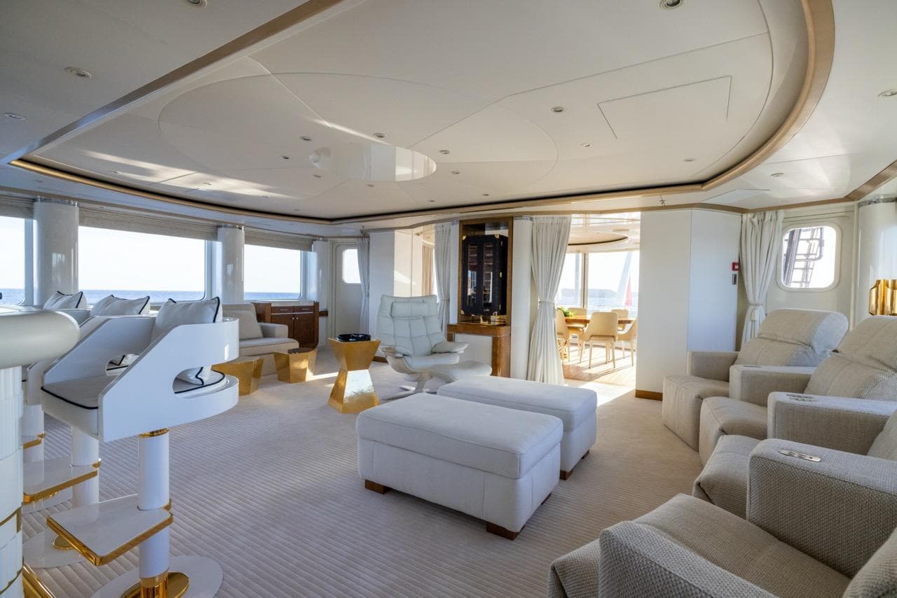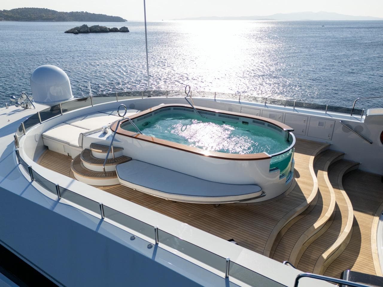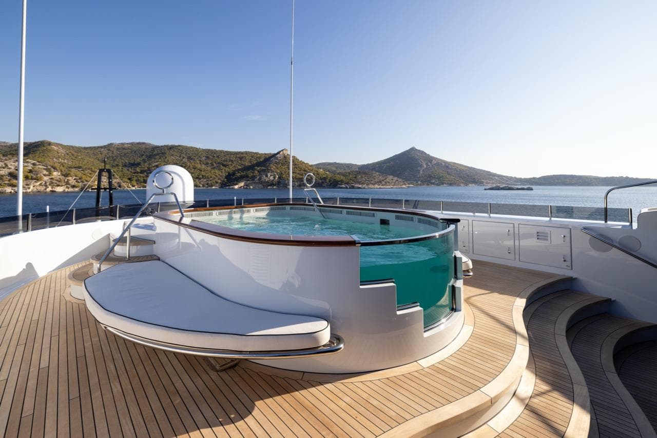 Одна из ключевых особенностей яхты — впечатляющий бассейн на сан-деке. Он оснащён современной системой противотока для тренировок и функцией джакузи. Вокруг бассейна — большая зона для загара, идеальная для отдыха или приёма гостей в атмосфере абсолютной роскоши.