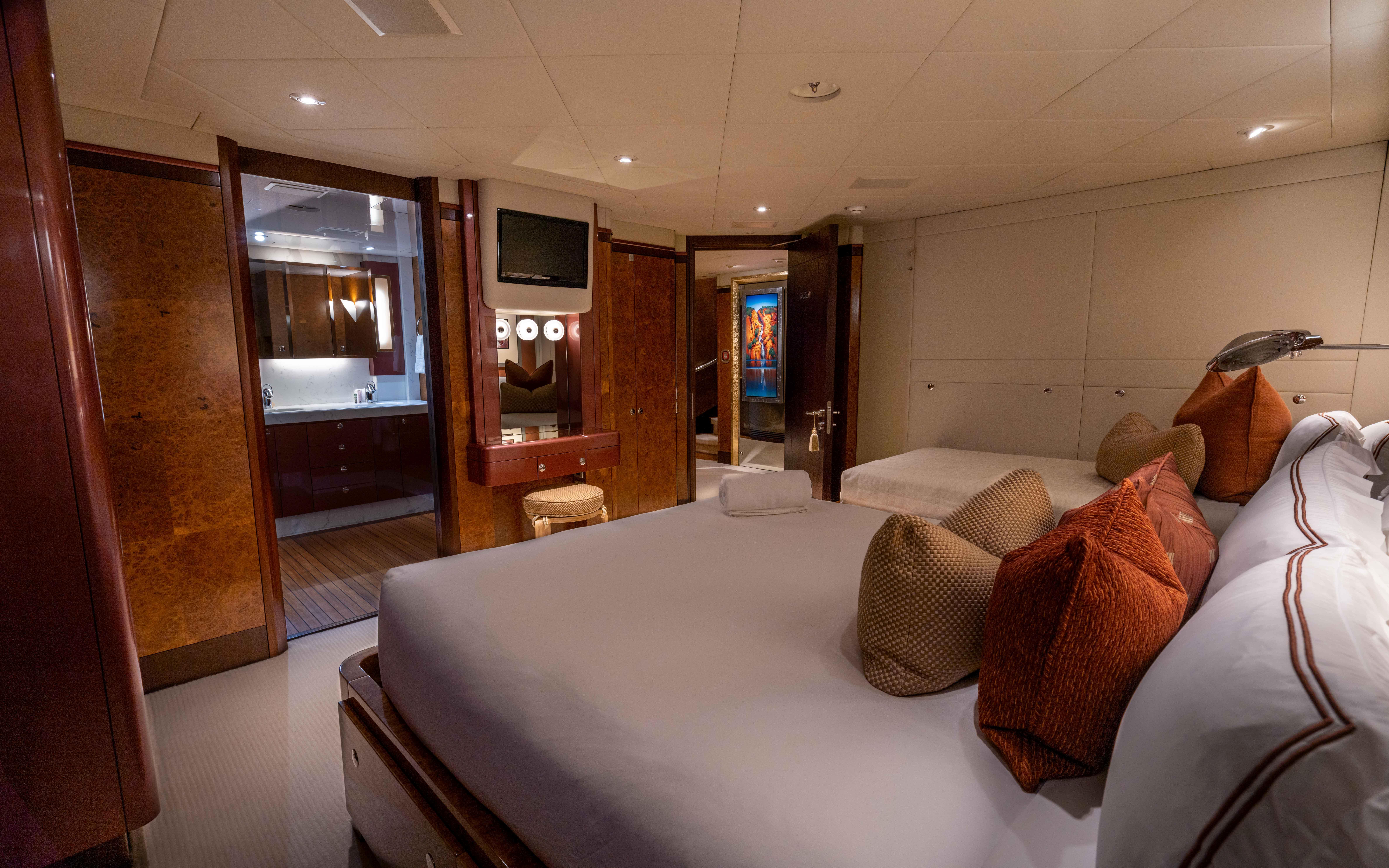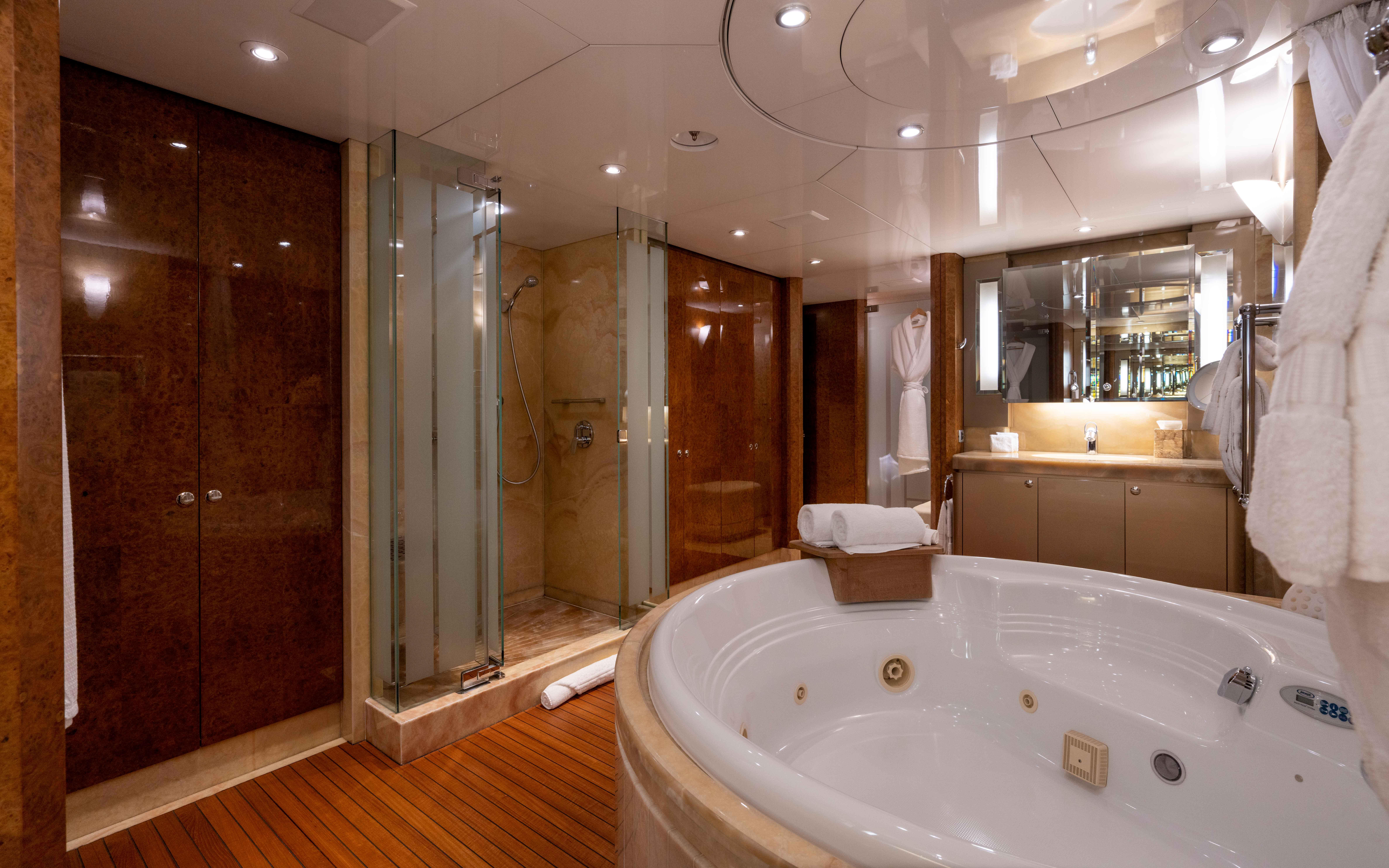 Каюта владельца расположена в кормовой части верхней палубы. Это по-настоящему особенная зона с панорамным обзором 180° благодаря окнам от пола до потолка, а также с приватной внешней палубой с удобными местами для отдыха и обеденной зоной. Каюта владельца очень просторная и с великолепными видами; ванная комната «en suite» впечатляет: большая круглая джакузи-ванна из медового оникса, приватный кабинет, душ, два санузла и две удобные кушетки — всё это формирует ярко выраженное и максимально приватное пространство владельца.