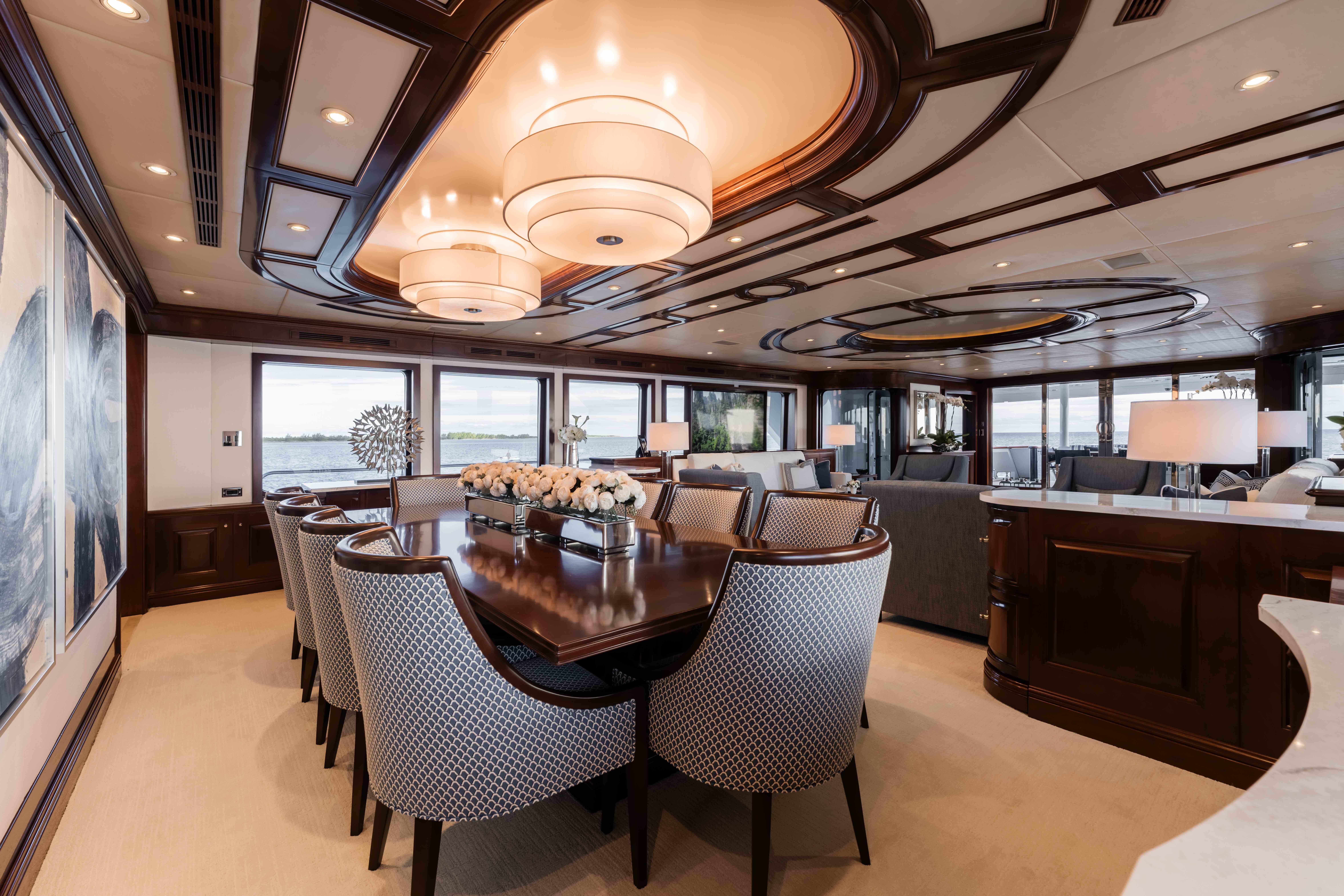 Вернувшись на корму главной палубы и двигаясь вперёд, вы входите на SUMMERDANCE через автоматические раздвижные двери в приветливый вестибюль. По обеим сторонам — встроенные шкафы с зеркальными фасадами. Далее открывается главный салон: симметричные зоны посадки по левому и правому борту (диваны, кресла и кофейные столики) располагают к комфортному общению. Интерьер светлый и элегантный — с каменными акцентами, богатой отделкой из красного дерева (mahogany) и ТВ, который поднимается из консоли по правому борту. В носовой части — формальная обеденная зона на десять персон под двумя современными светильниками, дополненная эффектными арт-объектами и встроенной мебелью/шкафами.