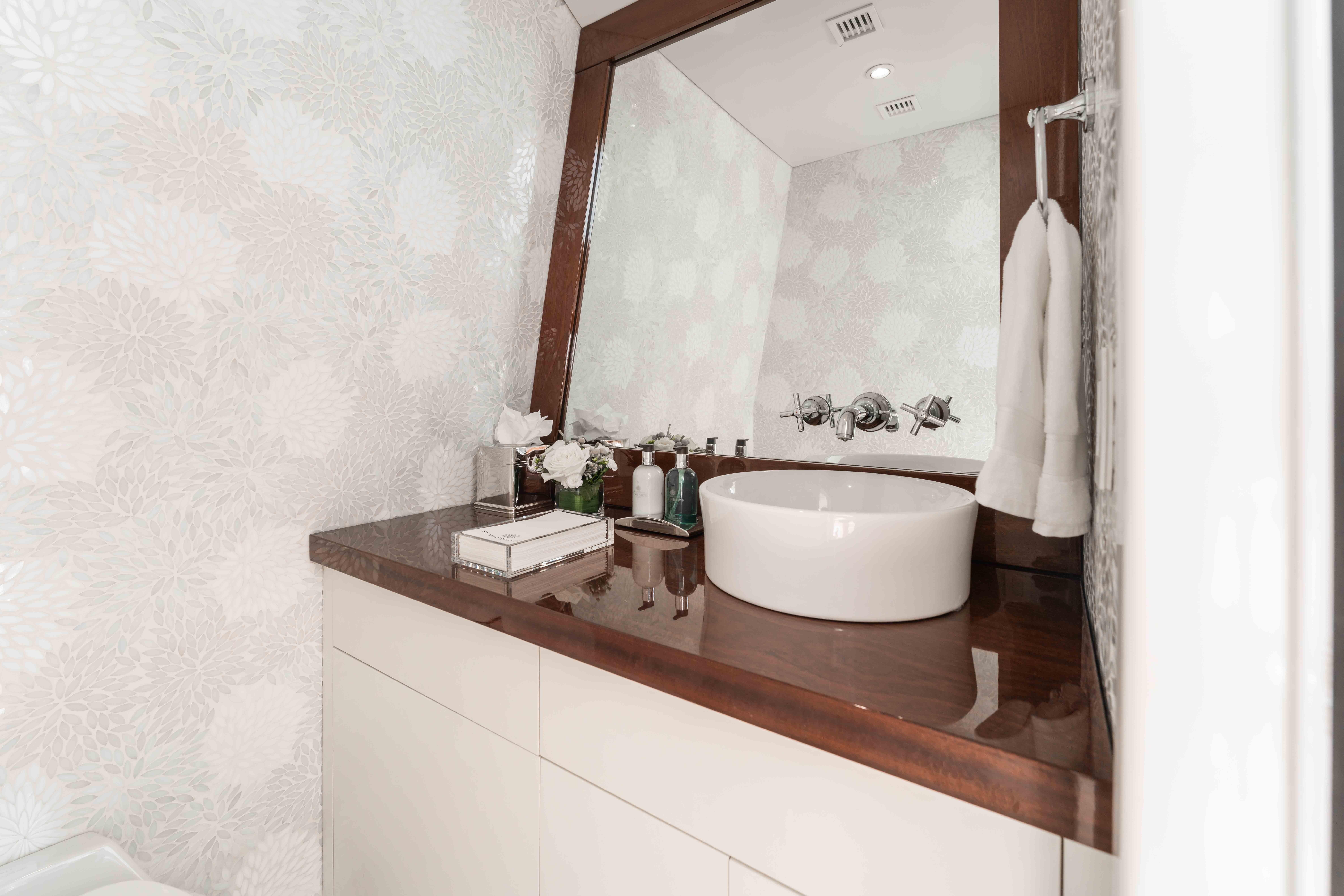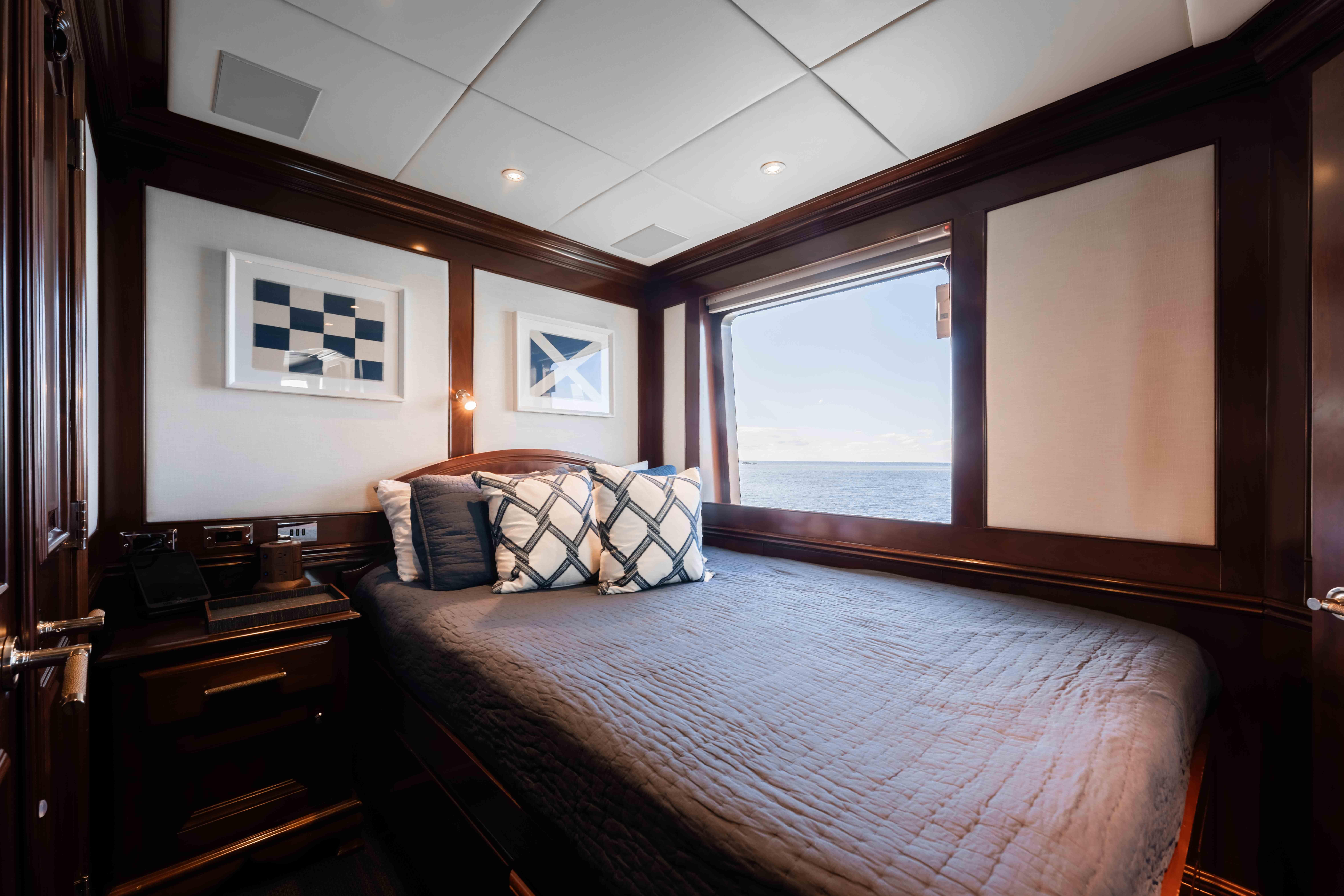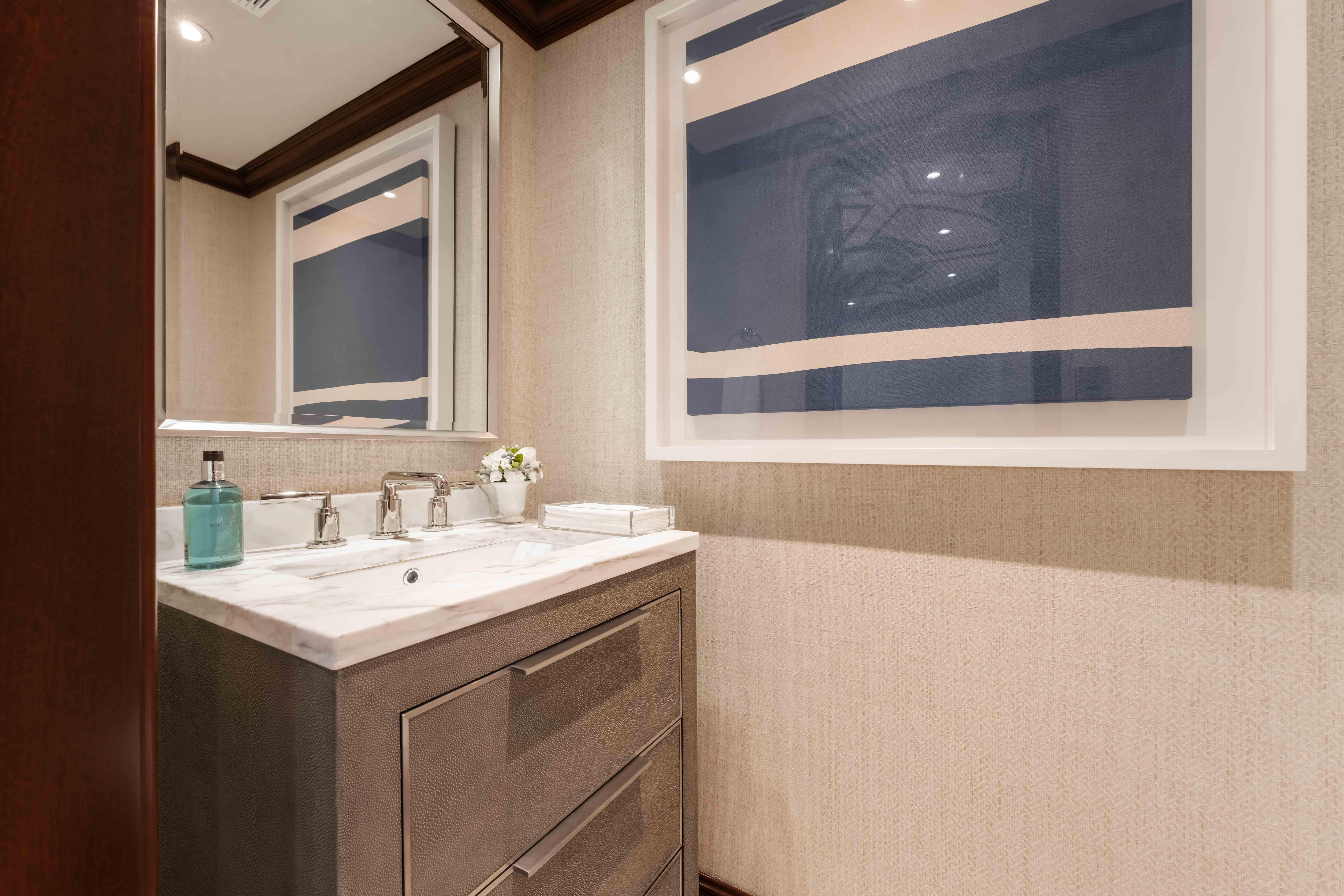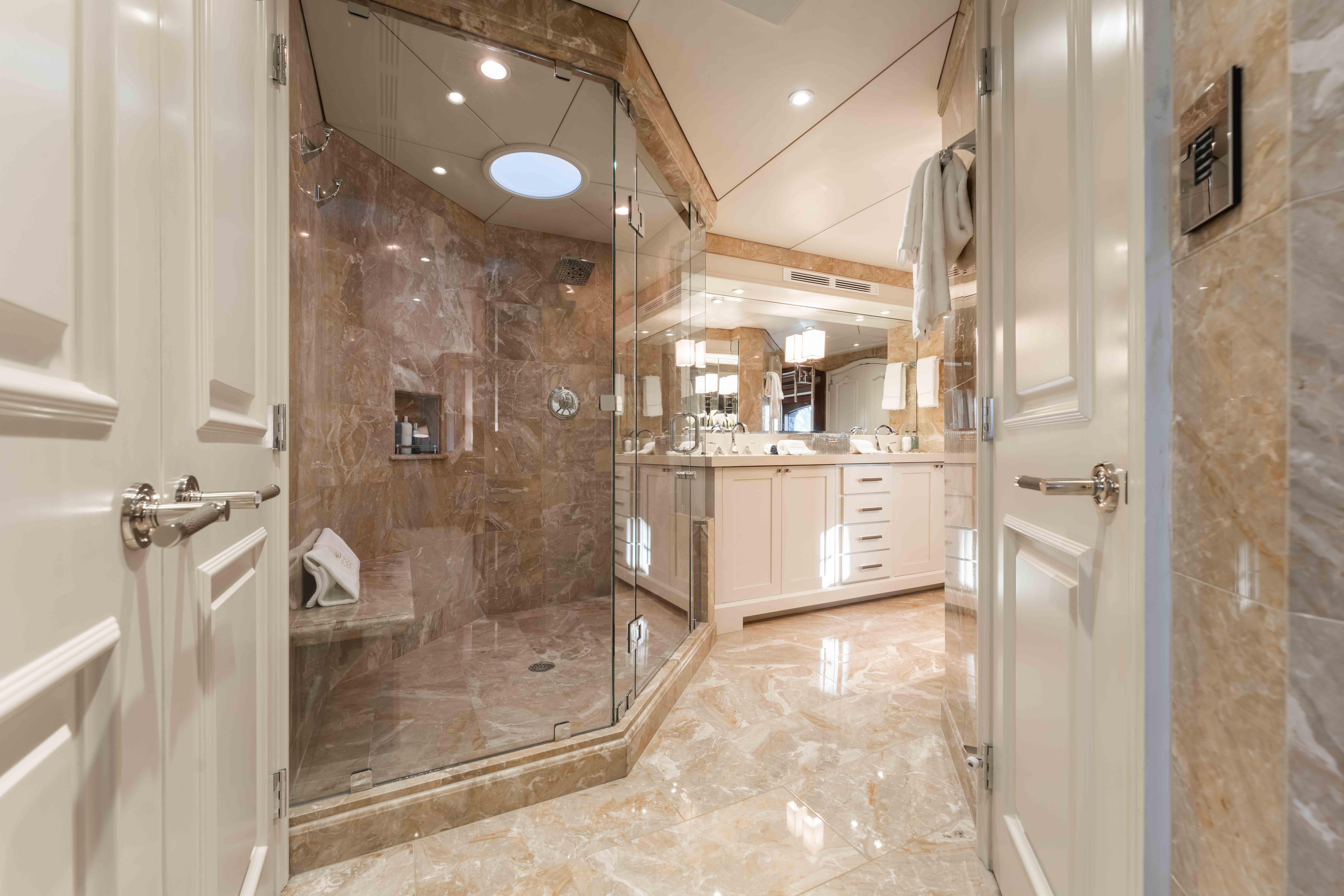В мастер-сьюте: кровать king-size с выполненным на заказ мягким изголовьем, диван по правому борту, встроенные системы хранения по обеим сторонам и рабочий стол по левому борту. Ванная комната занимает всю ширину корпуса и доступна с обеих сторон: две раковины, туалетный/макияжный столик, ванна под световым люком, отдельные туалет и биде, а также большая стеклянная душевая с отделкой камнем.