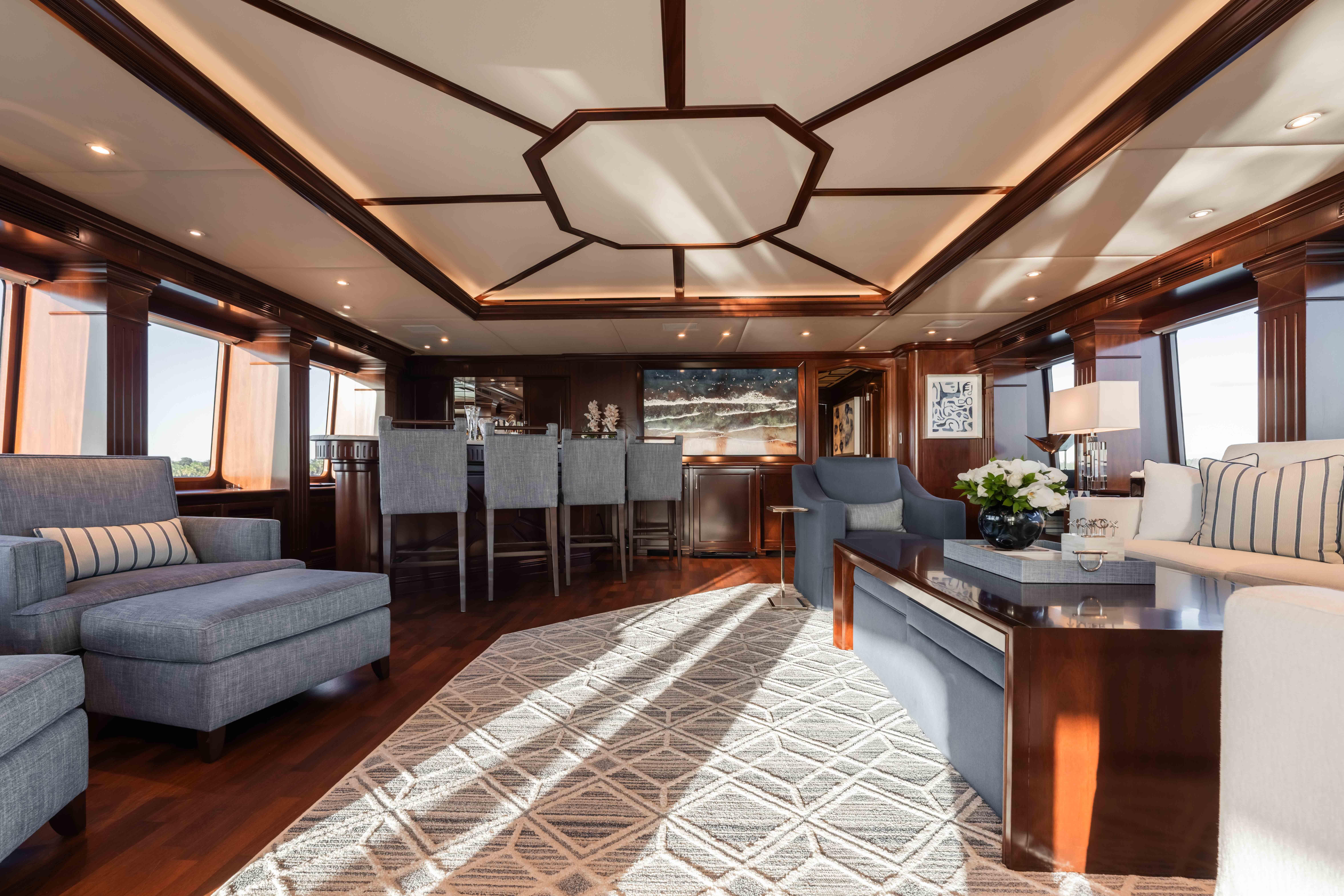 Поднявшись обратно в холл на bridge deck, справа расположен дневной санузел (day head), а в кормовой части открывается skylounge — комфортная лаунж-зона для отдыха и развлечений: большой L-образный диван, кресла и изогнутый бар по левому борту с четырьмя барными стульями. Бар включает мойку, льдогенератор, холодильник и места хранения бутылок. Пространство дополняют настенный ТВ и большие окна.