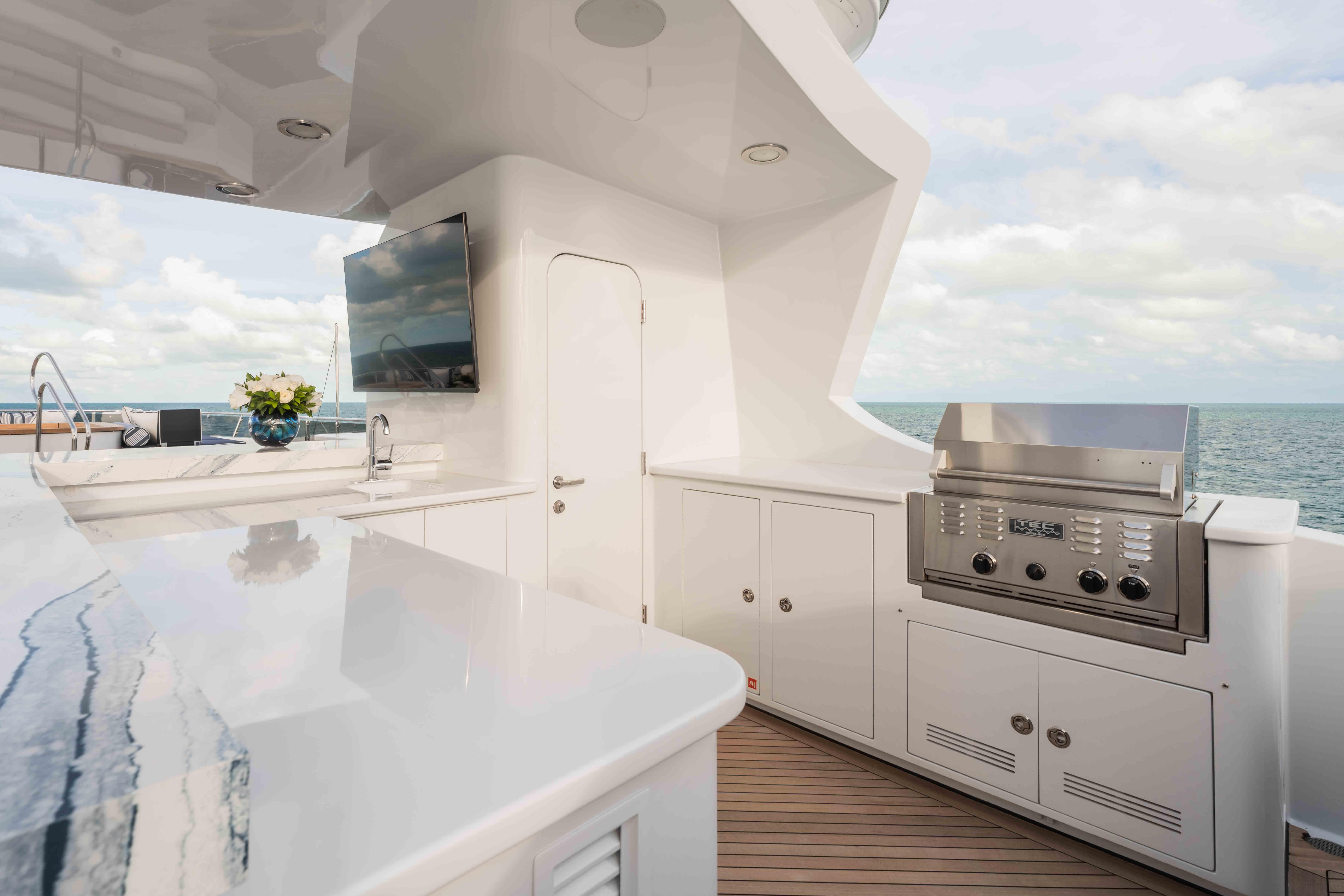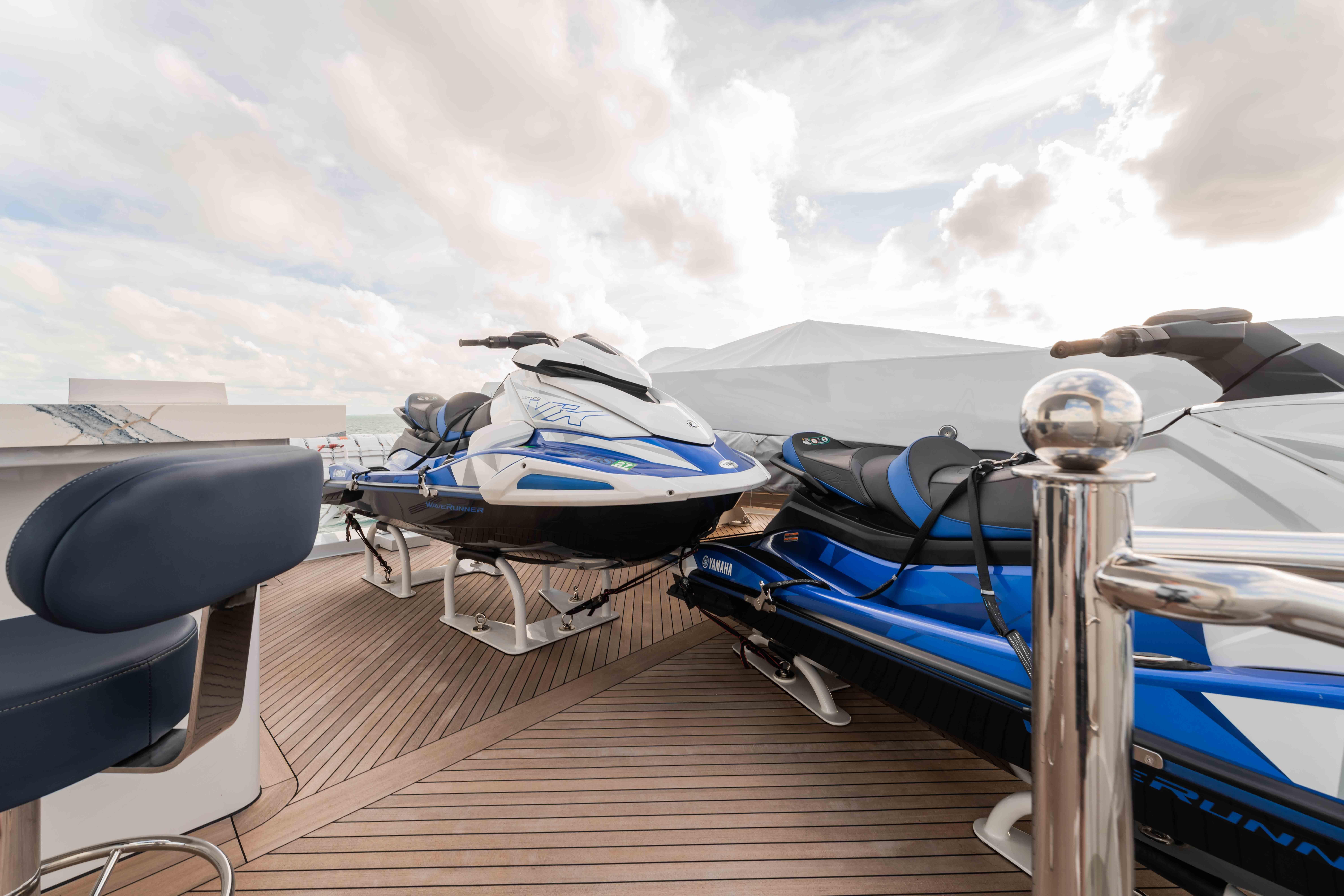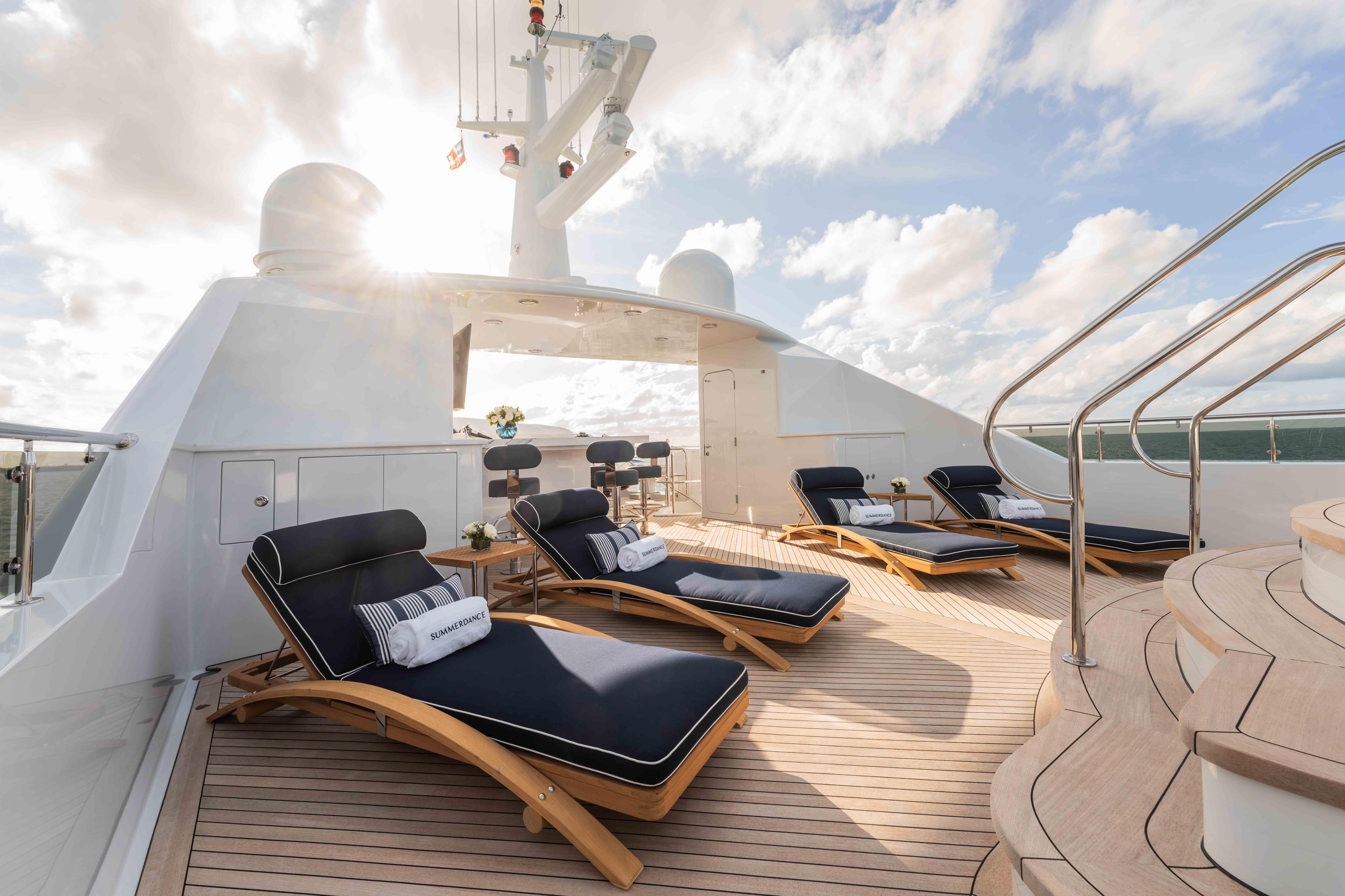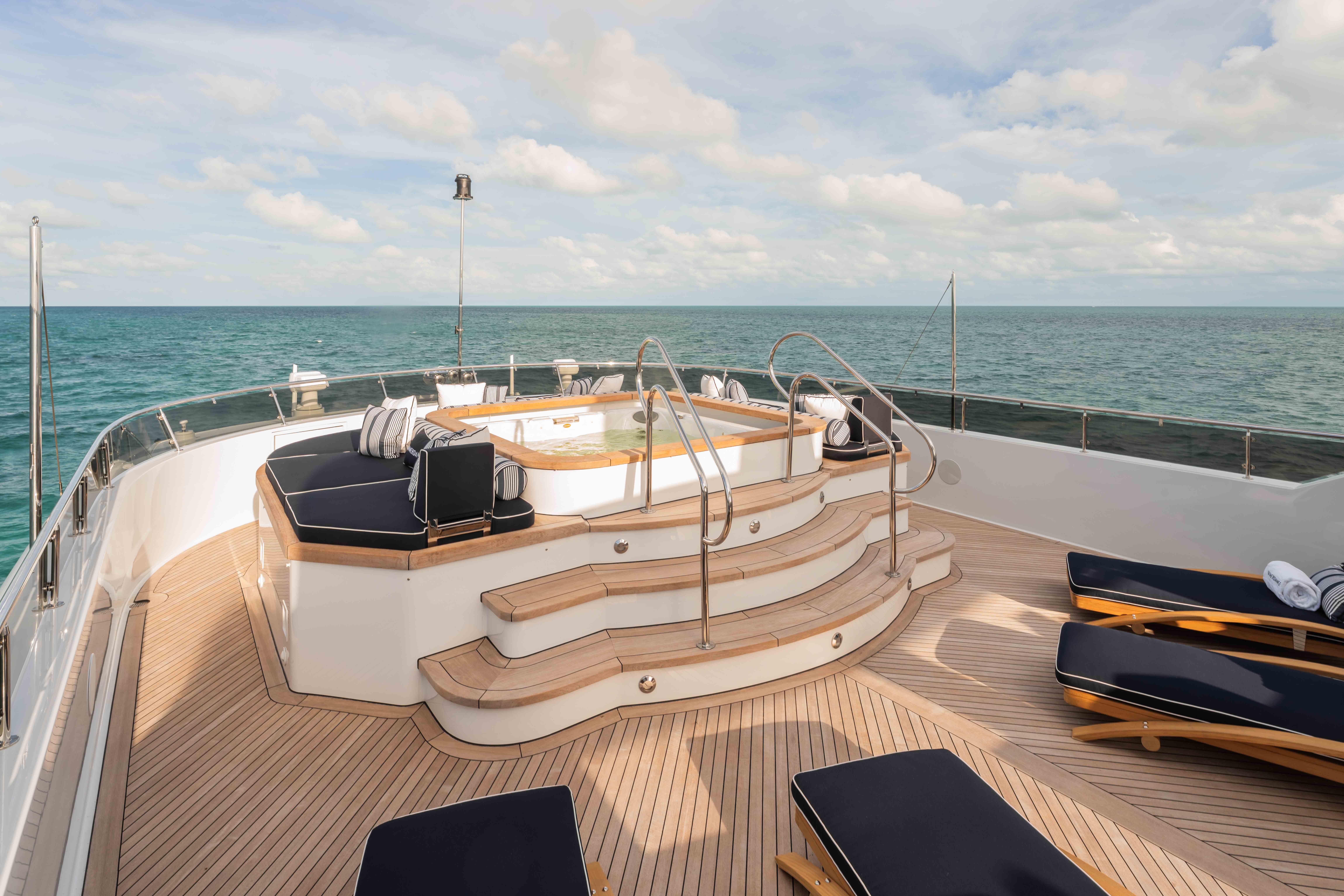 На sun deck впереди расположен большой L-образный бар с пятью стульями, грилем и мойкой. В кормовой части — хранение тендера и гидроцикла с краном-давитом. Перед баром — встроенное джакузи, окружённое санпэдами и четырьмя лежаками; по левому борту предусмотрен удобный дневной санузел.