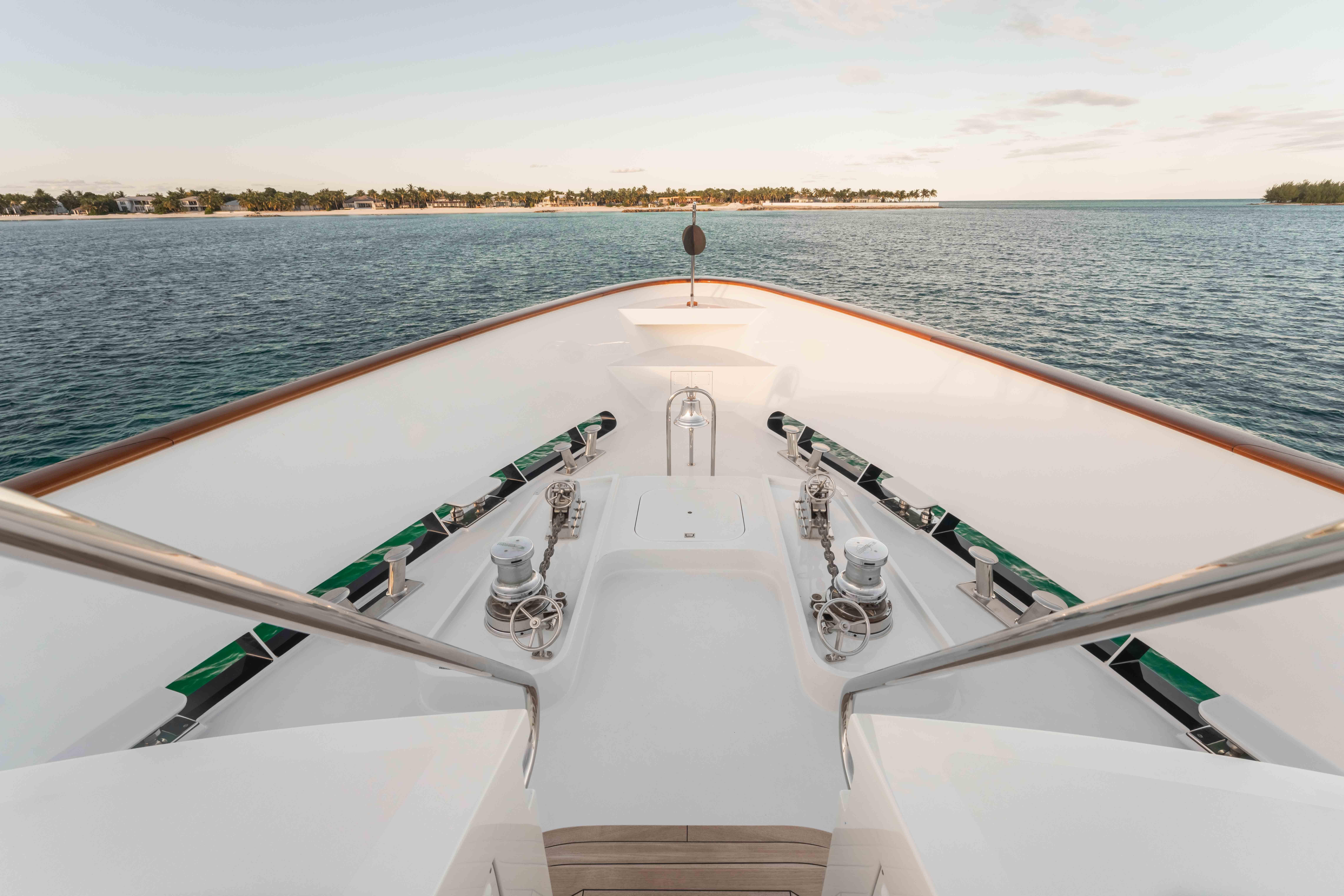 Через проход в носовой части находится ходовая рубка (pilothouse) с отличной обзорностью из кресла капитана, изогнутым гостевым диваном/сиденьями и навигационным столом. Каюта капитана расположена по левому борту: двуспальная кровать и собственный санузел. Крыльевые посты управления находятся снаружи у обеих дверей рубки.