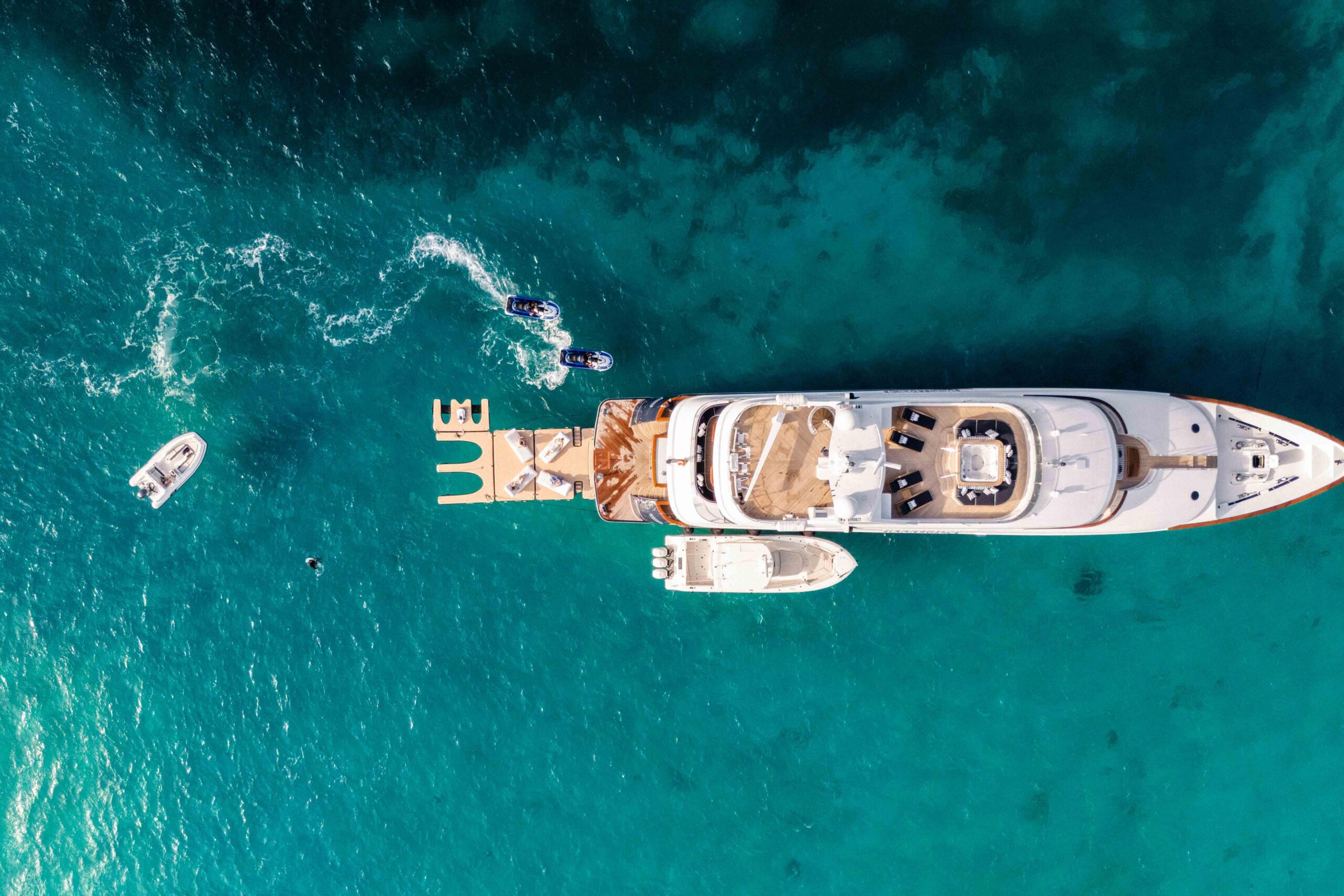 Плавные изогнутые лестницы по обеим сторонам ведут вниз на просторную купальную платформу. Здесь установлен съёмный наружный душ, а также предусмотрен доступ в машинное отделение. Пассерель для посадки с кормы аккуратно размещена внутри конструкции правого (starboard) трапа/лестницы.