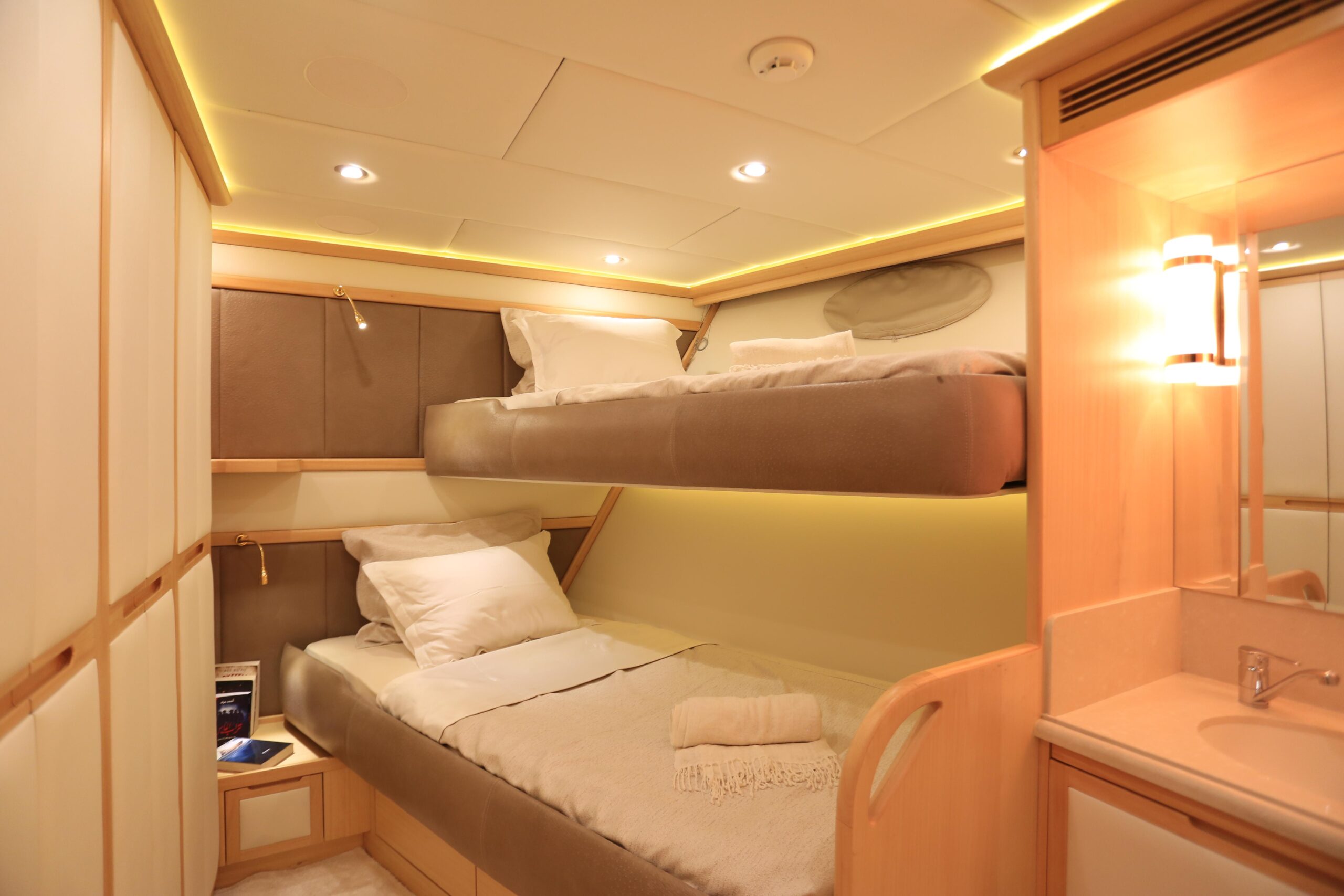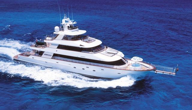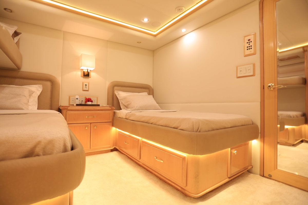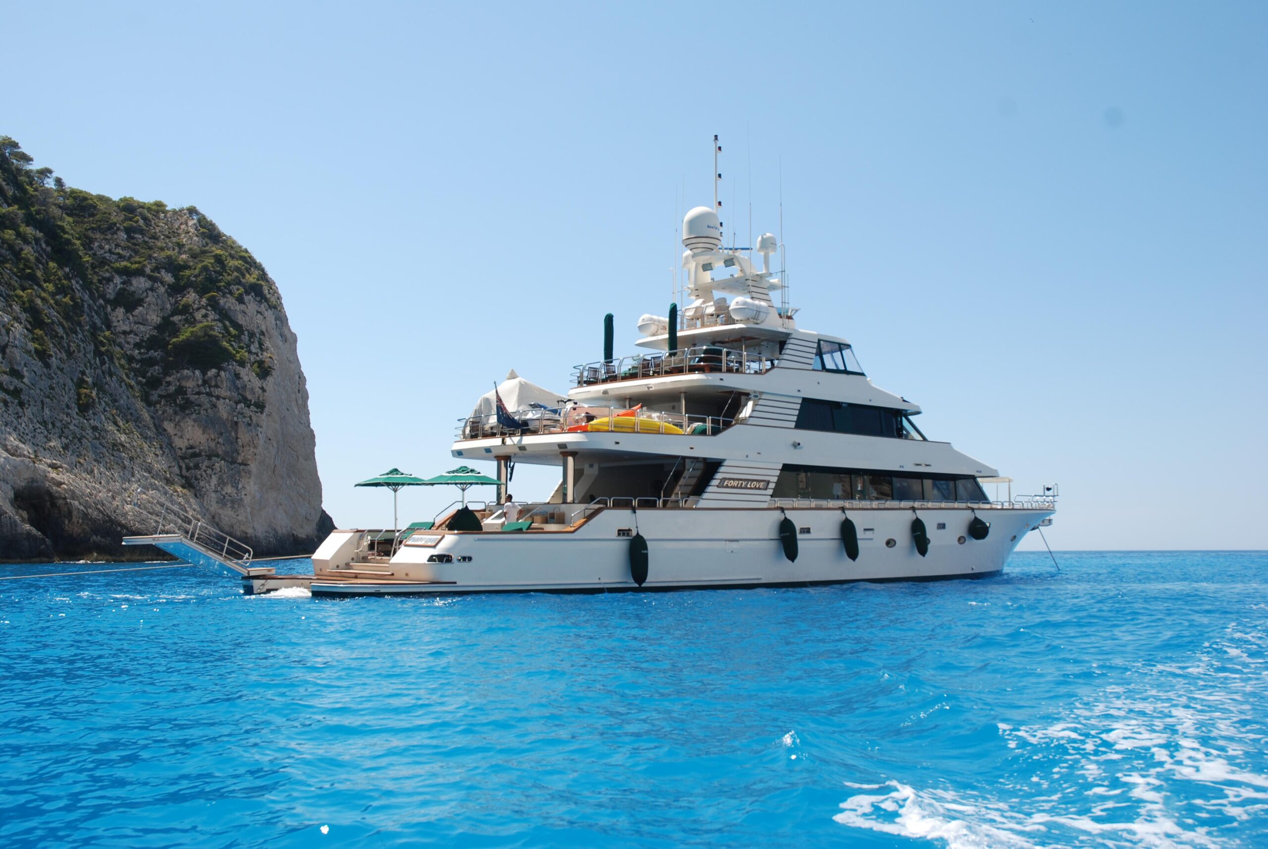 Built in the true spirit of customization, Forty Love was conceived as a 5-deck platform for the complete enjoyment of the outdoors with simplified accessibility. Her wide aft section offers a stunning beach club while the salon and dining area occupy the entire main deck. The vast party deck provides a further area for entertainment. A genuine and one-of-a-kind yacht, Forty Love is also equipped with a gym, sauna, shaded jacuzzi and a fantastic selection of water toys and tenders. She accommodates up to 12 guests in 5/6 luxurious cabins, all located on the lowerdeck.