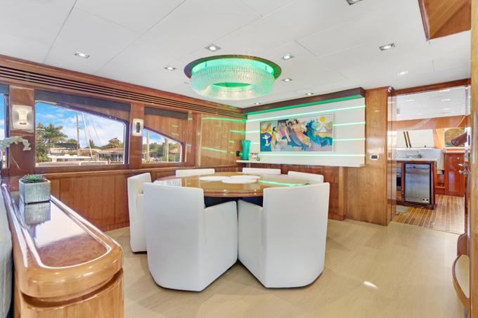 Обеденный салон открыт к основному салону в корме, но отделён как самостоятельная зона за счёт шкафов, расположенных впереди дивана. Детали потолка повторяют форму овального стола.