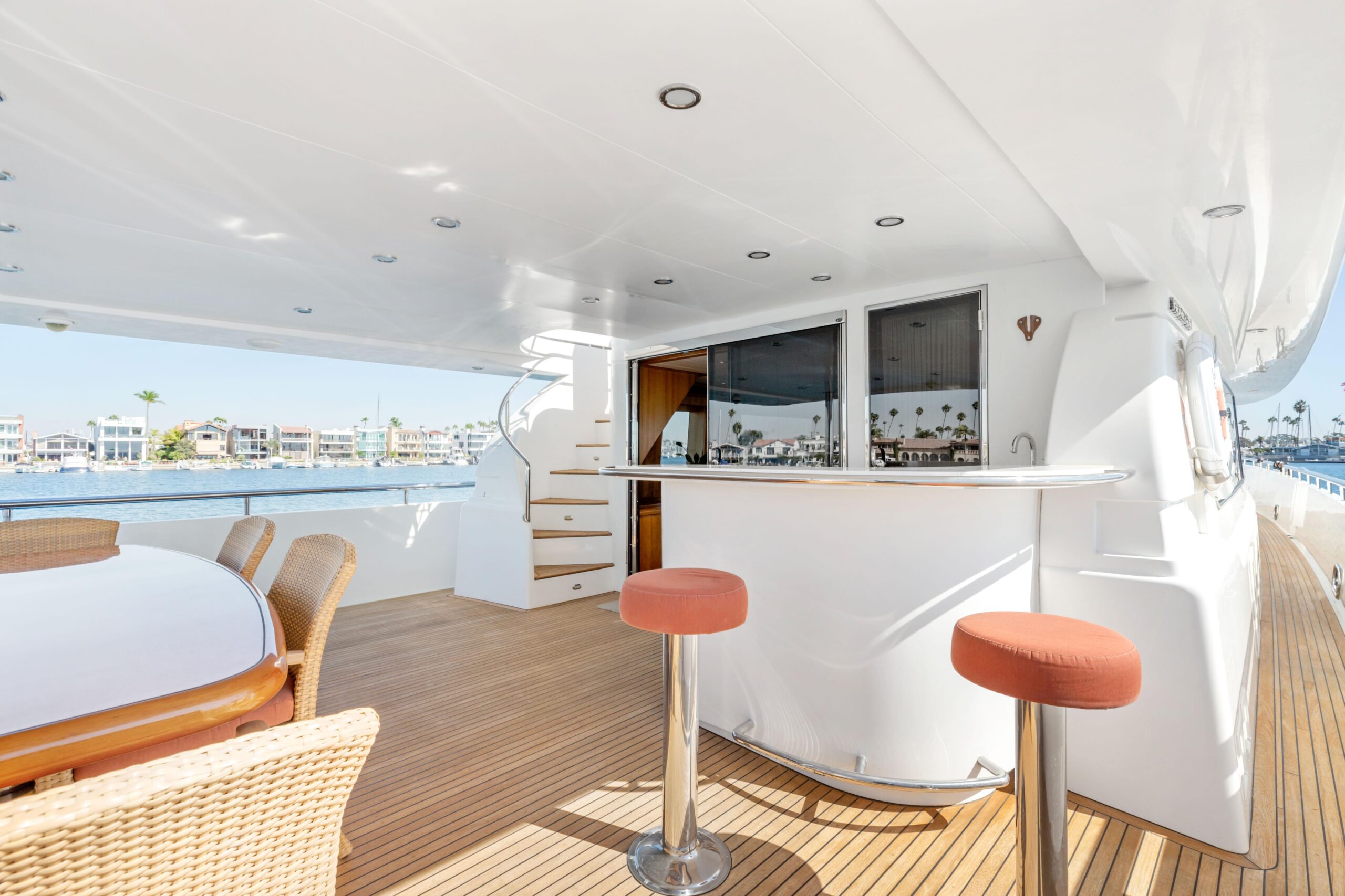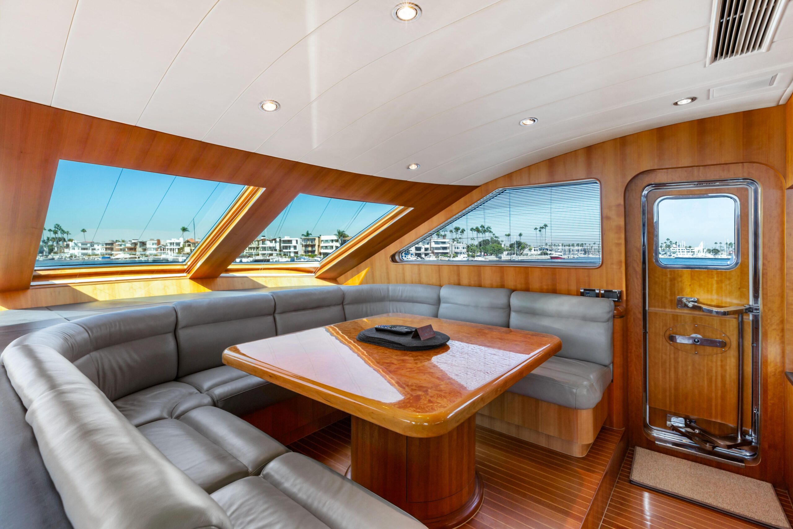 В главном салоне — индивидуальный развлекательный центр, L-образный диван с журнальным столиком и два кресла. В носовой части салона расположена формальная обеденная зона на 8 персон. По правому борту находится барная зона с винным холодильником, льдогенератором и выдвижными холодильными ящиками.