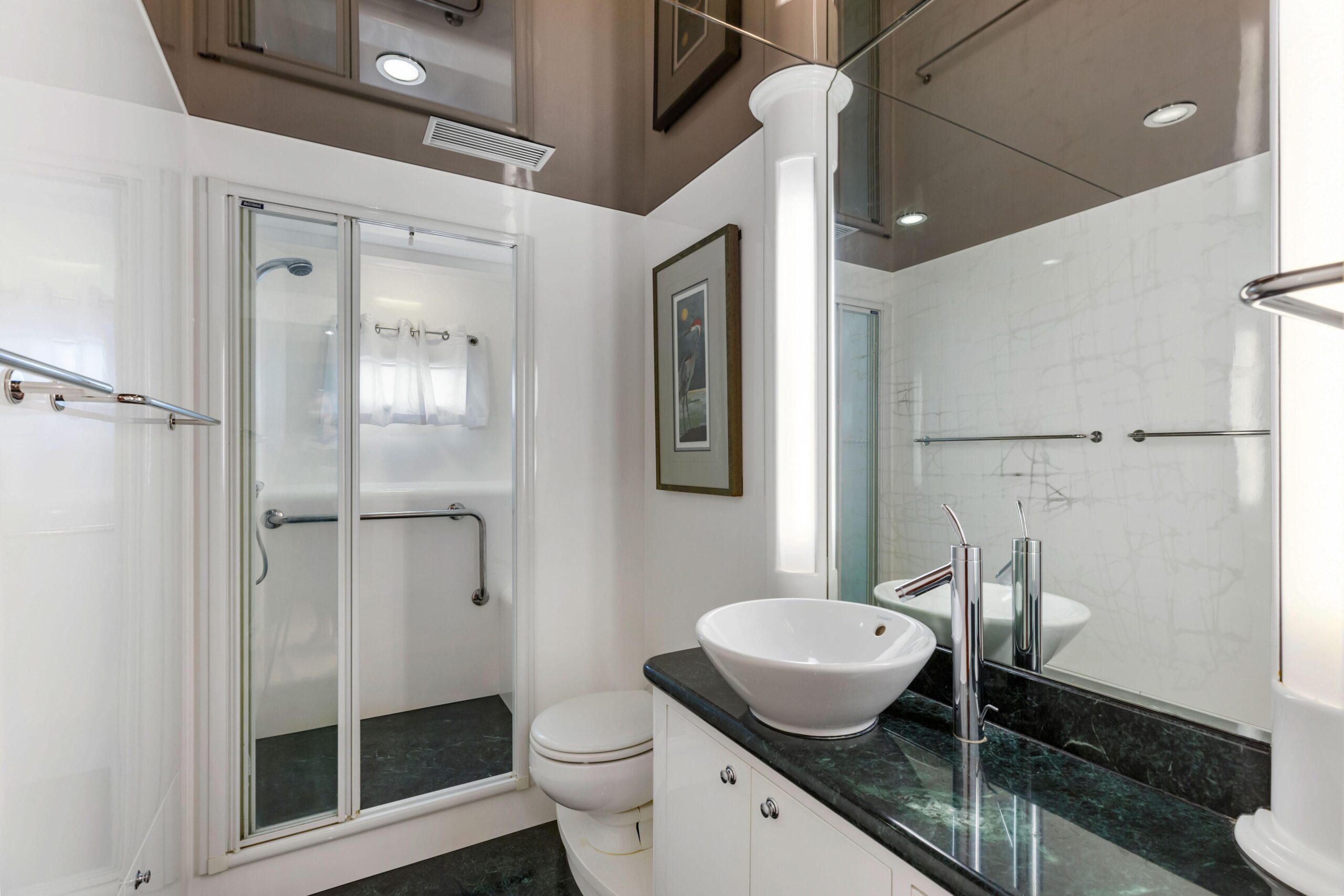 Гостевые каюты на нижней палубе включают три каюты: мастер-каюта во всю ширину корпуса — в самой кормовой части, VIP — в носу, и гостевая каюта по правому борту. Во всех каютах — собственные санузлы с душевыми.