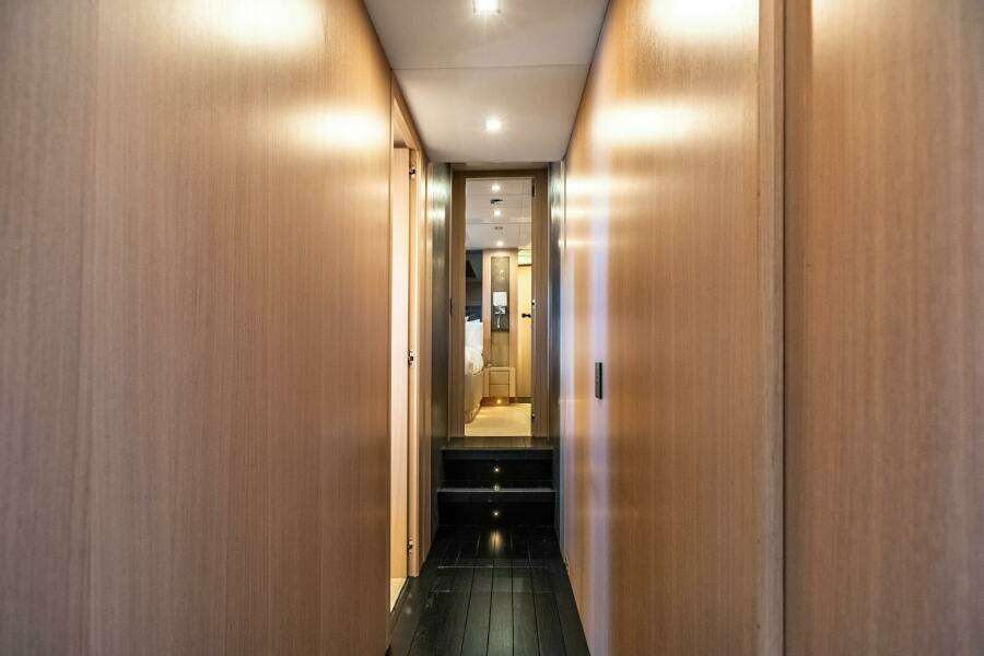 Раздвижная дверь отделяет мастер-лаунж/нижний салон. Здесь — большой L-образный диван, встроенный кофейный столик и телевизор 43". Пространство подчёркнуто деревянными инкрустациями на полу и мраморными вставками на стенах и потолке. Примечательно, что здесь два комплекта раздвижных дверей: один отделяет лаунж от каюты с двумя кроватями и мастер-каюты, создавая гибкое пространство, которое можно считать частью мастер-сьюта — идеально для семей или пар, которым нужны раздельные спальные зоны.