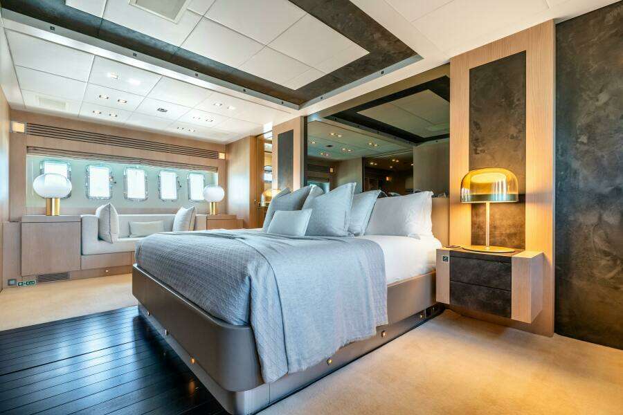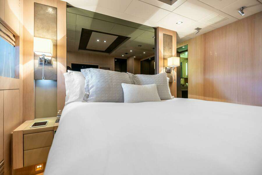 Затем, проходя к корме через большую раздвижную дверь, вы попадаете в мастер-каюту. Встроенный телевизор 50" установлен на носовой переборке, а 10 иллюминаторов из нержавеющей стали наполняют помещение естественным светом. Отделка выполнена элегантно: деревянные инкрустации на полу и мраморные вставки на стенах. Центрально расположенная кровать king обеспечивает удобные проходы. Слева в кормовой части — гардеробная с выдвижными ящиками со стеклянными фасадами для удобной организации. Справа — небольшой диванчик, где приятно расслабиться перед началом дня. Ванная в мастер-каюте включает тумбу, просторный тропический душ со скамьёй и мраморную раковину с фурнитурой из нержавеющей стали. Кроме того, из мастер-каюты предусмотрен аварийный люк в главный салон для дополнительной безопасности.