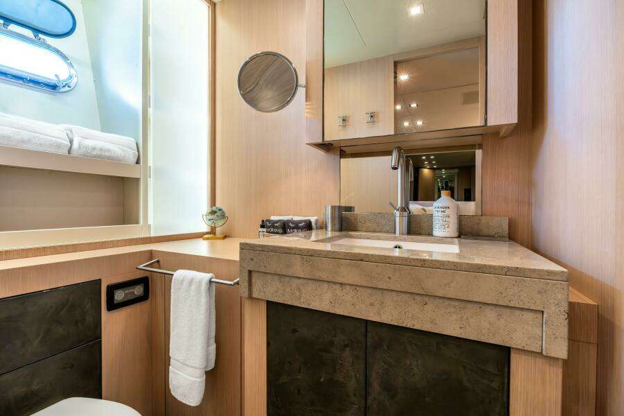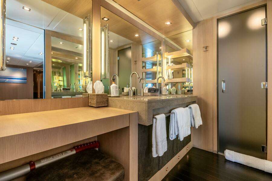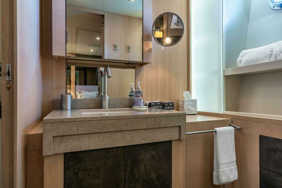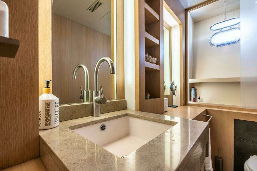 Двигаясь к корме, небольшая ступень ведёт вниз к дневному санузлу по правому борту, с мраморной раковиной и двумя зеркалами.