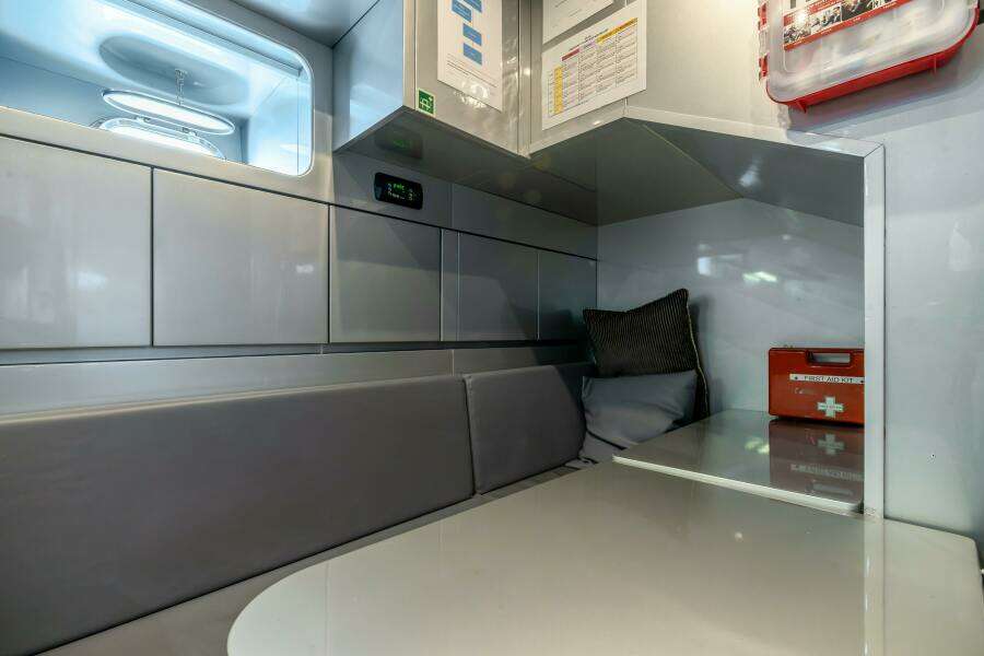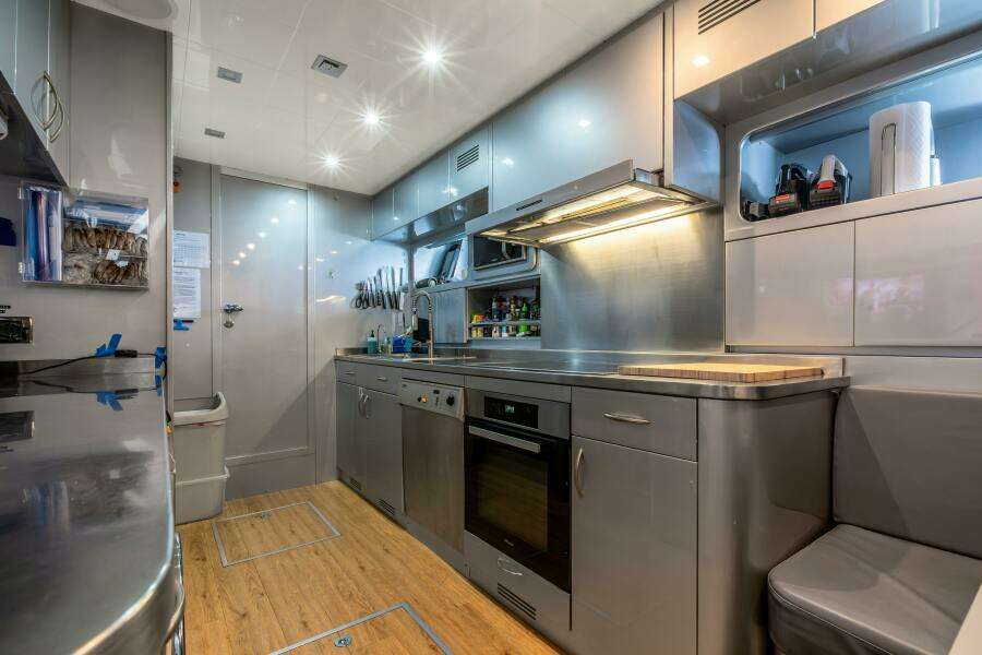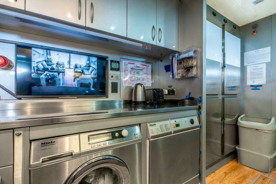 Спускаясь по лестнице с поста управления главной палубы, вы попадаете в камбуз, оснащённый совершенно новой техникой Miele, включая стиральную и сушильную машины. Эта хорошо продуманная зона также включает два холодильника, две морозильные камеры и уютную обеденную зону для экипажа.