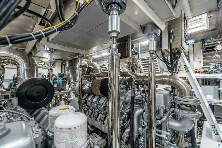 Доступ в машинное отделение осуществляется через два палубных люка на кормовой палубе — один по левому борту и один по правому. Спускаясь по трапам, вы попадаете в переднюю часть машинного отделения, где предусмотрено рабочее место и хранение инструмента. Новый гиростабилизатор расположен по центру ближе к корме. Машинное отделение хорошо организовано и обеспечивает удобный доступ ко всему оборудованию.