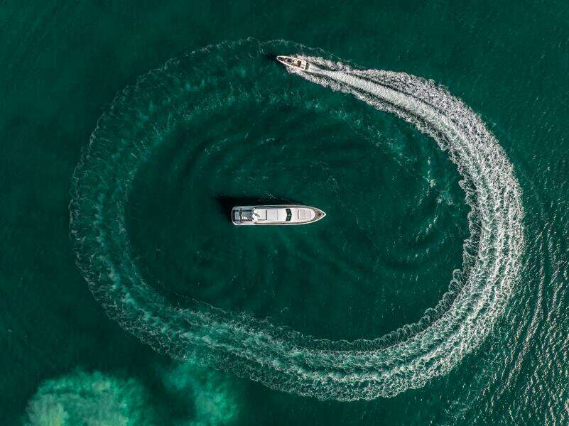 КОРМОВАЯ ВНЕШНЯЯ ЗОНАНа кормовой палубе — тиковое покрытие с серой конопаткой, создающее современный и аккуратный вид. Две большие раздвижные двери ведут в главный салон, где вас встречают удобные зоны отдыха: по одному L-образному дивану по левому и правому бортам с пуфами. На палубе также есть два регулируемых кофейных столика и скамья на примерно трёх человек. Стильный обеденный стол на шесть персон аккуратно хранится за скамьёй и готов к использованию при необходимости. Ярко-белые подушки по всей зоне задают чистую «майамскую» атмосферу.
