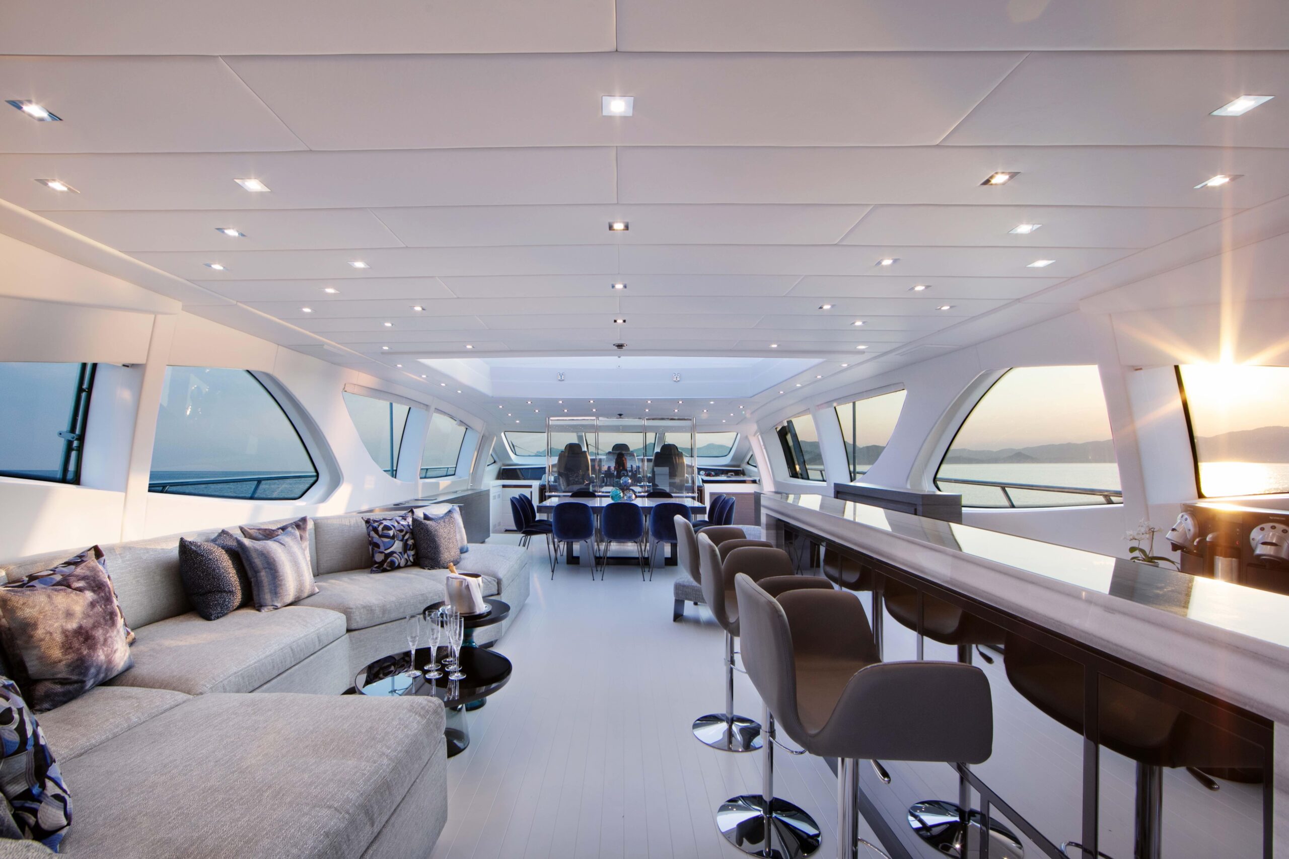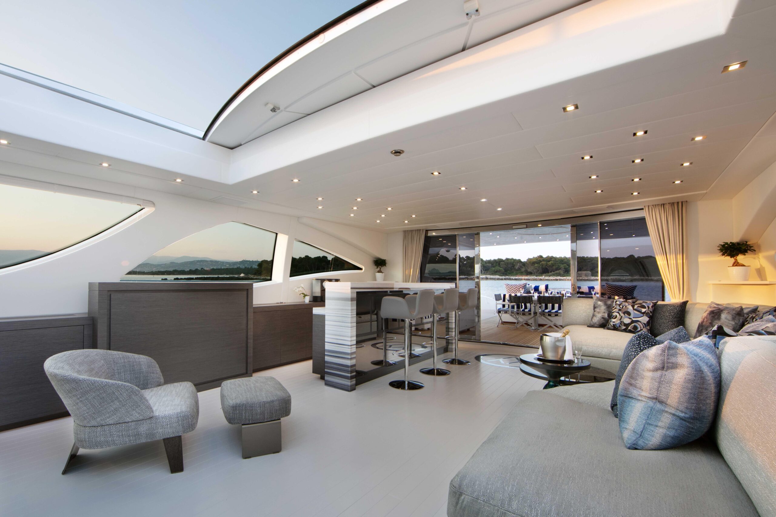 Интерьеры VENI VIDI VICI оформлены в светлом стиле beach club с роскошной мягкой мебелью, создающей уютную и элегантную атмосферу. Просторный салон оснащён раздвижной крышей, подчёркивающей внушительный внутренний объём яхты и обеспечивающей обилие естественного света.
