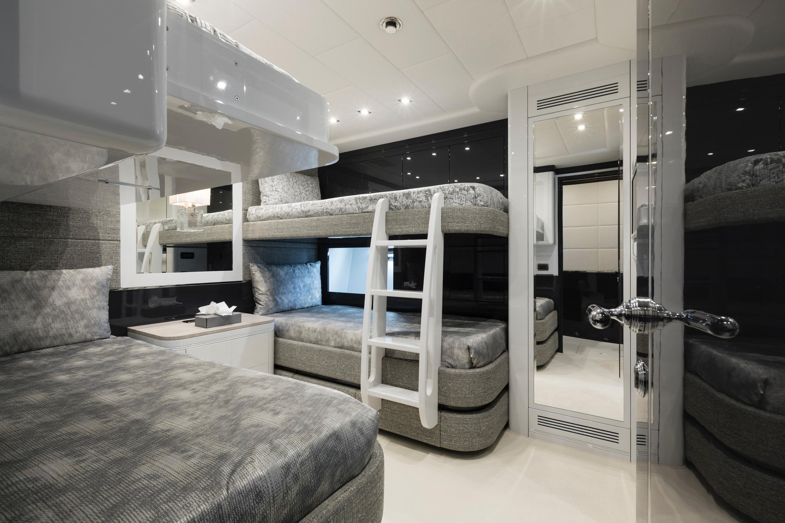 Гостевое размещение включает мастер-каюту на всю ширину корпуса, VIP-каюту с двуспальной кроватью, 2 двухместные каюты и каюту с раздельными кроватями, оборудованную двухъярусной кроватью и дополнительным спальным местом Pullman.