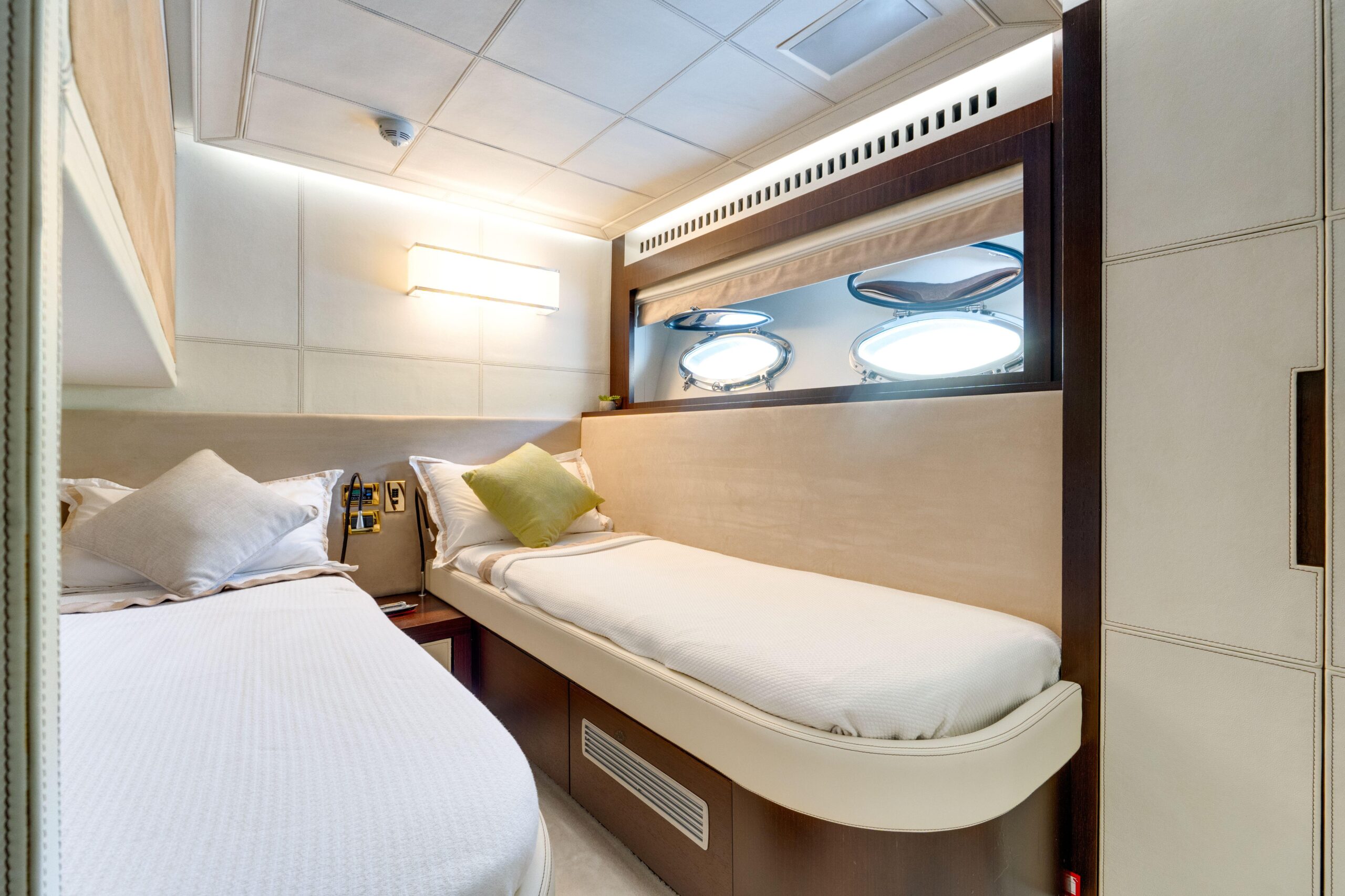 Расположенная в центральной части корпуса, мастер-каюта во всю ширину яхты оснащена отдельными ванными комнатами для него и для неё, зонами отдыха и высококлассной развлекательной системой. Вертикальные иллюминаторы в бортах обеспечивают естественное освещение и прямой вид на море даже на высокой скорости. VIP-каюта находится в носовой части и оснащена двуспальной кроватью, установленной под углом, гардеробной, изогнутым диваном и собственной ванной комнатой. Вторая гостевая каюта также имеет отдельный санузел и оборудована стандартным спальным местом и откидной койкой Pullman.