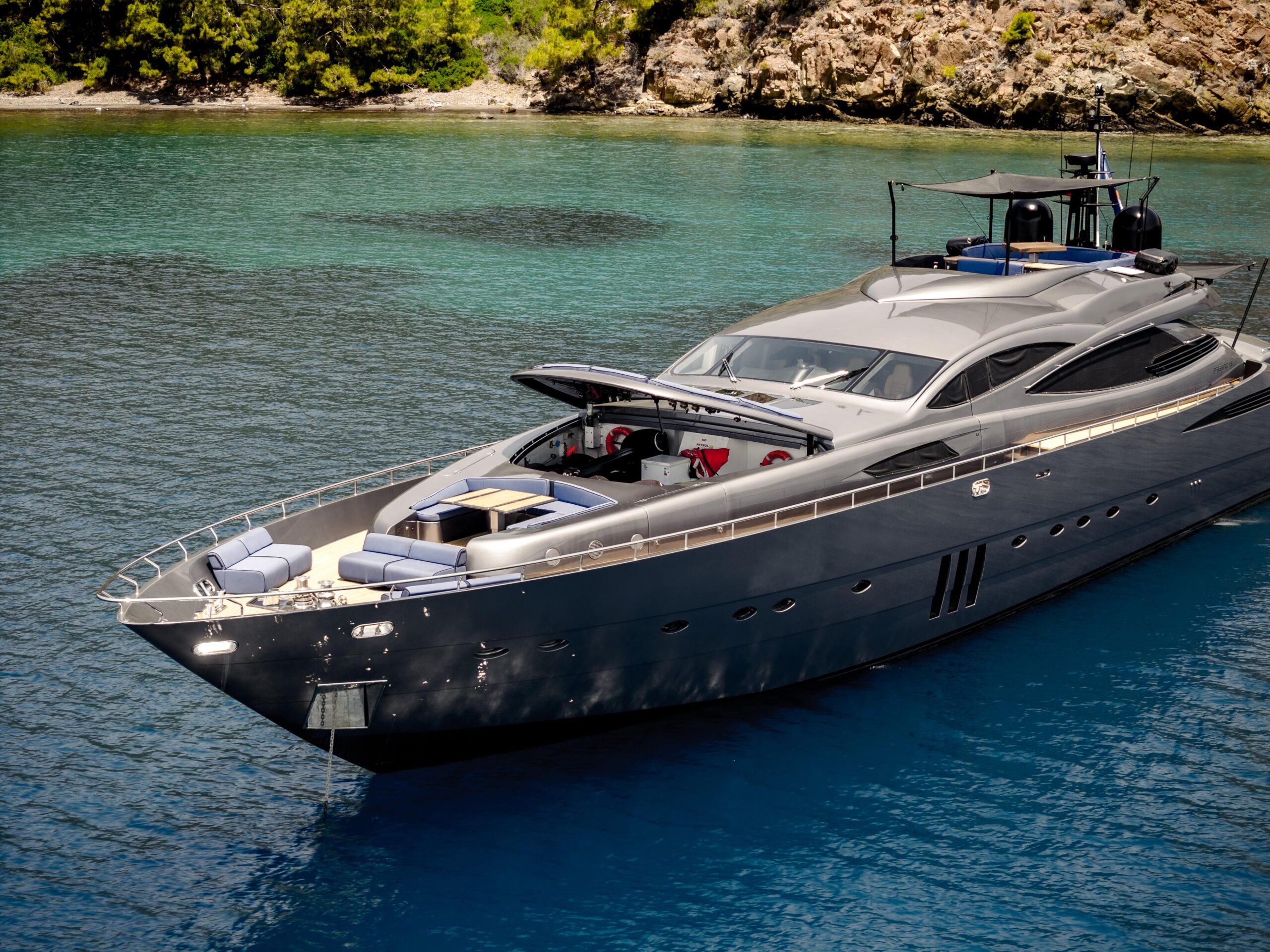 Яхта сохранила оригинальные дизайнерские черты — стремительные линии экстерьера, несколько зон палубного пространства и современный интерьер — при этом получила обновлённую электронику и максимальную скорость до 38 узлов.