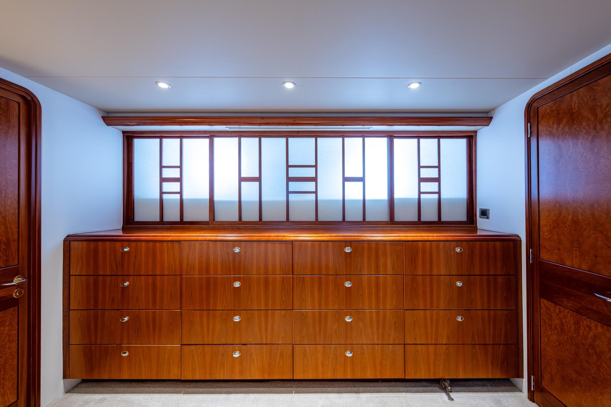 Мастер-каюта имеет двойные входные двери, кровать king по диаметральной плоскости и две тумбы по бокам. По левому борту — диван и места хранения, по правому — комод с пятнадцатью выдвижными ящиками. В каюте — две гардеробные с кедровой отделкой, ТВ с плоским экраном и встроенный сейф. Ванная комната владельца включает отдельную душевую с сиденьем, системой душевых форсунок/распылителей и отдельный закрытый туалетный отсек (water closet).