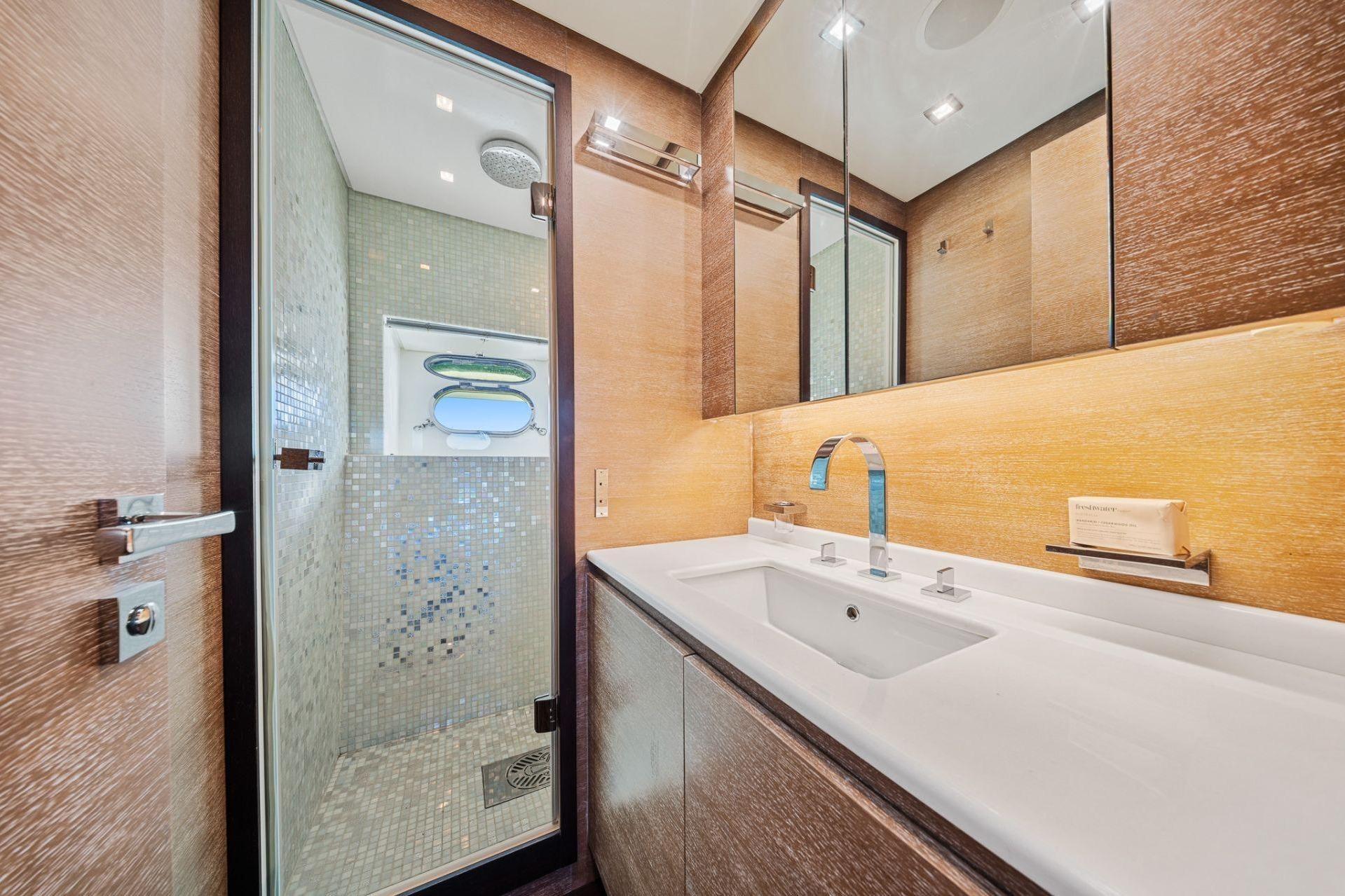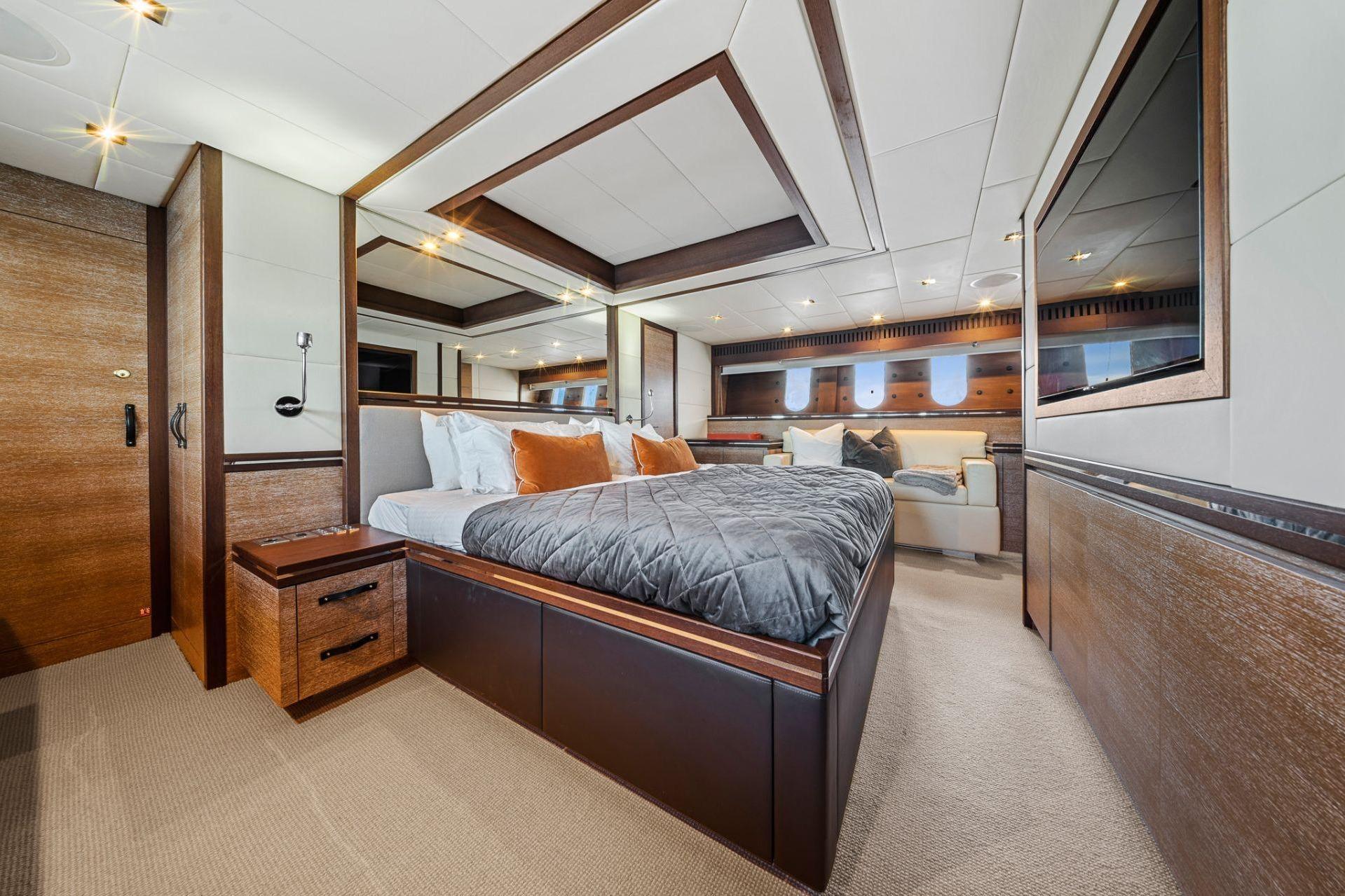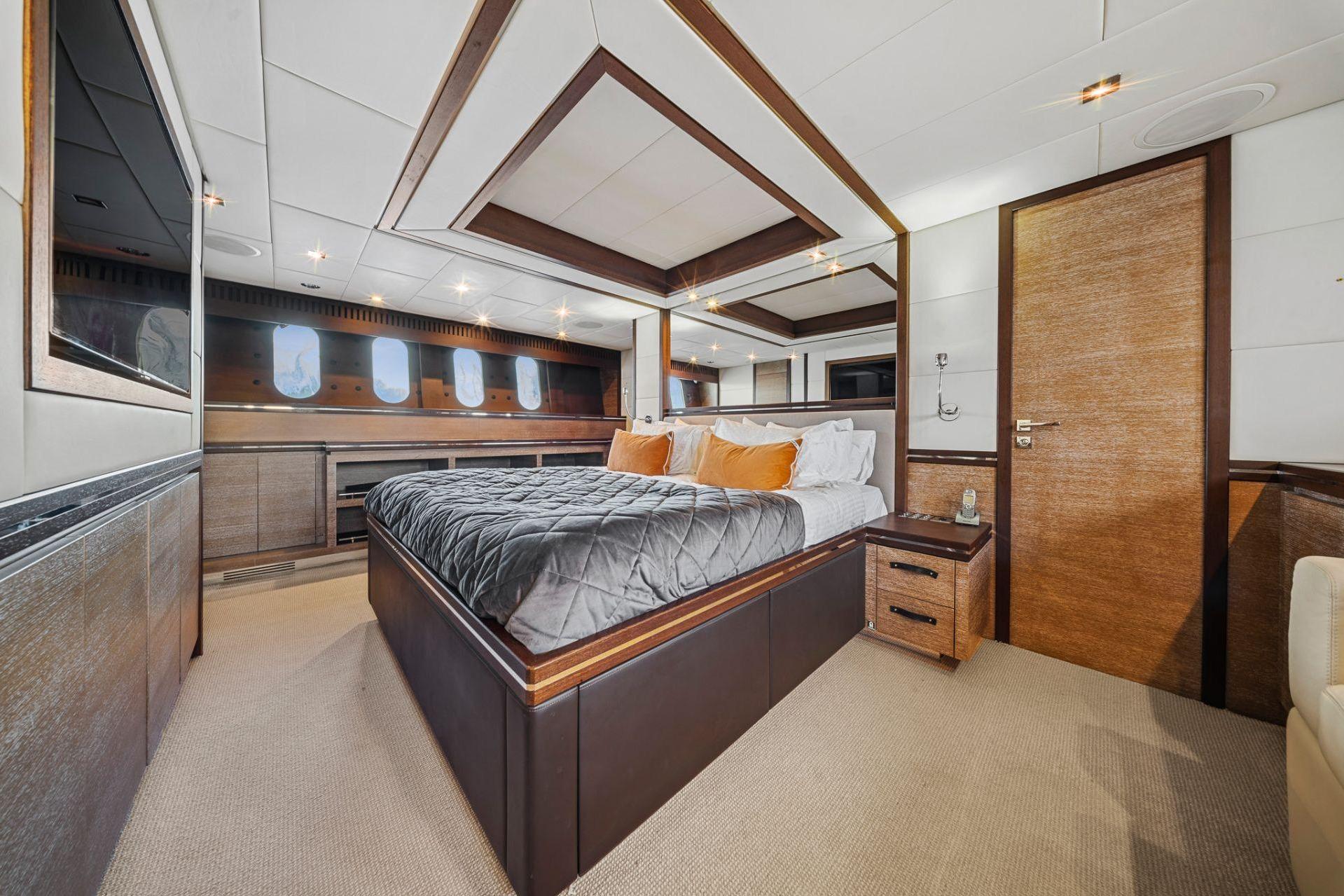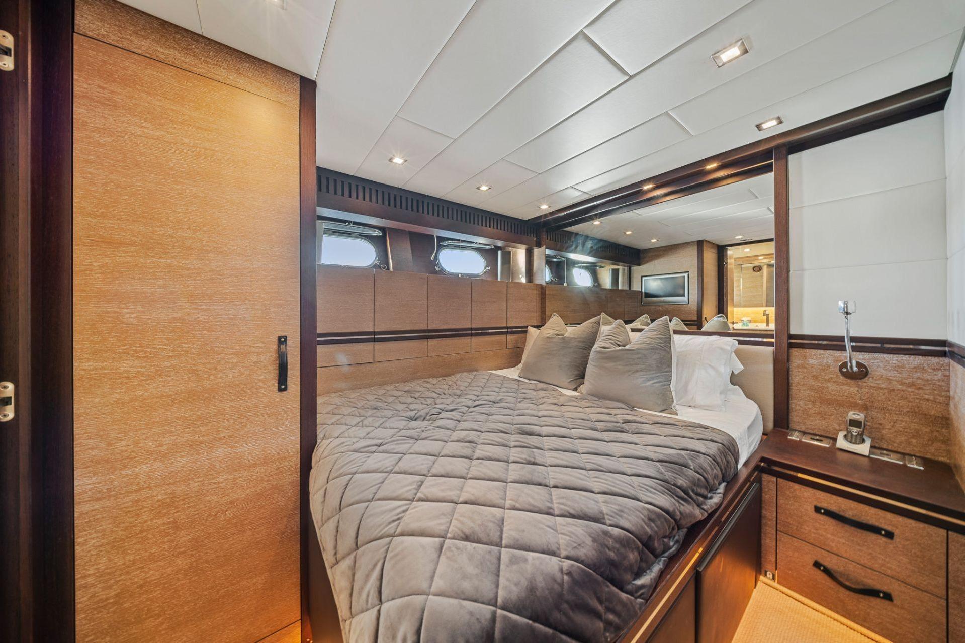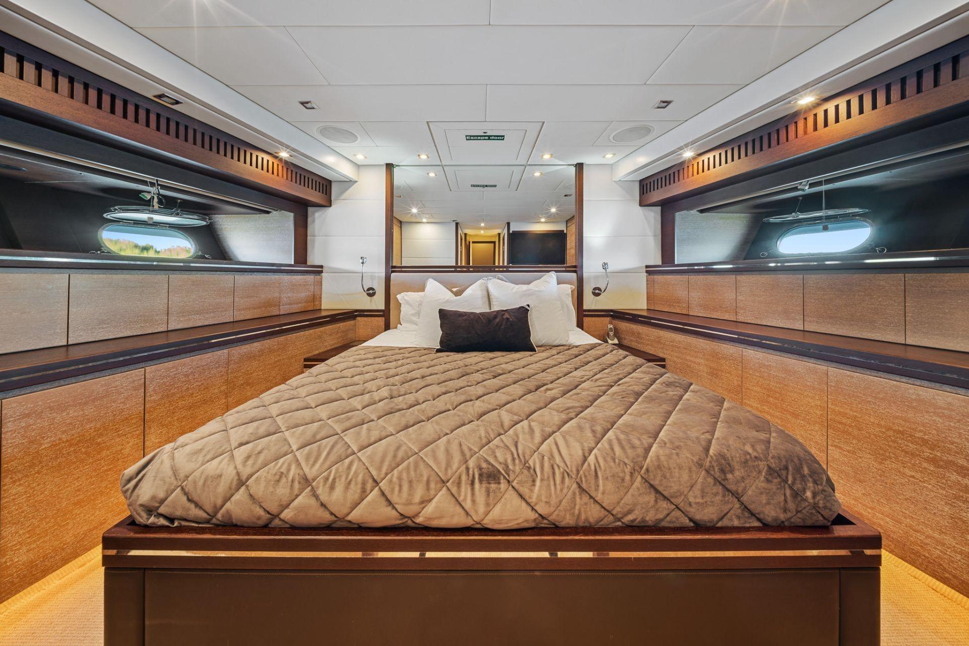 YOLO располагает четырьмя каютами, включая большую светлую мастер-каюту во всю ширину корпуса, а также VIP-каюту, которую можно использовать как мастер, с ванными комнатами «его и её». Экипажу обеспечены отличные условия — просторный коммерческий камбуз в кормовой части и комфортабельные каюты.