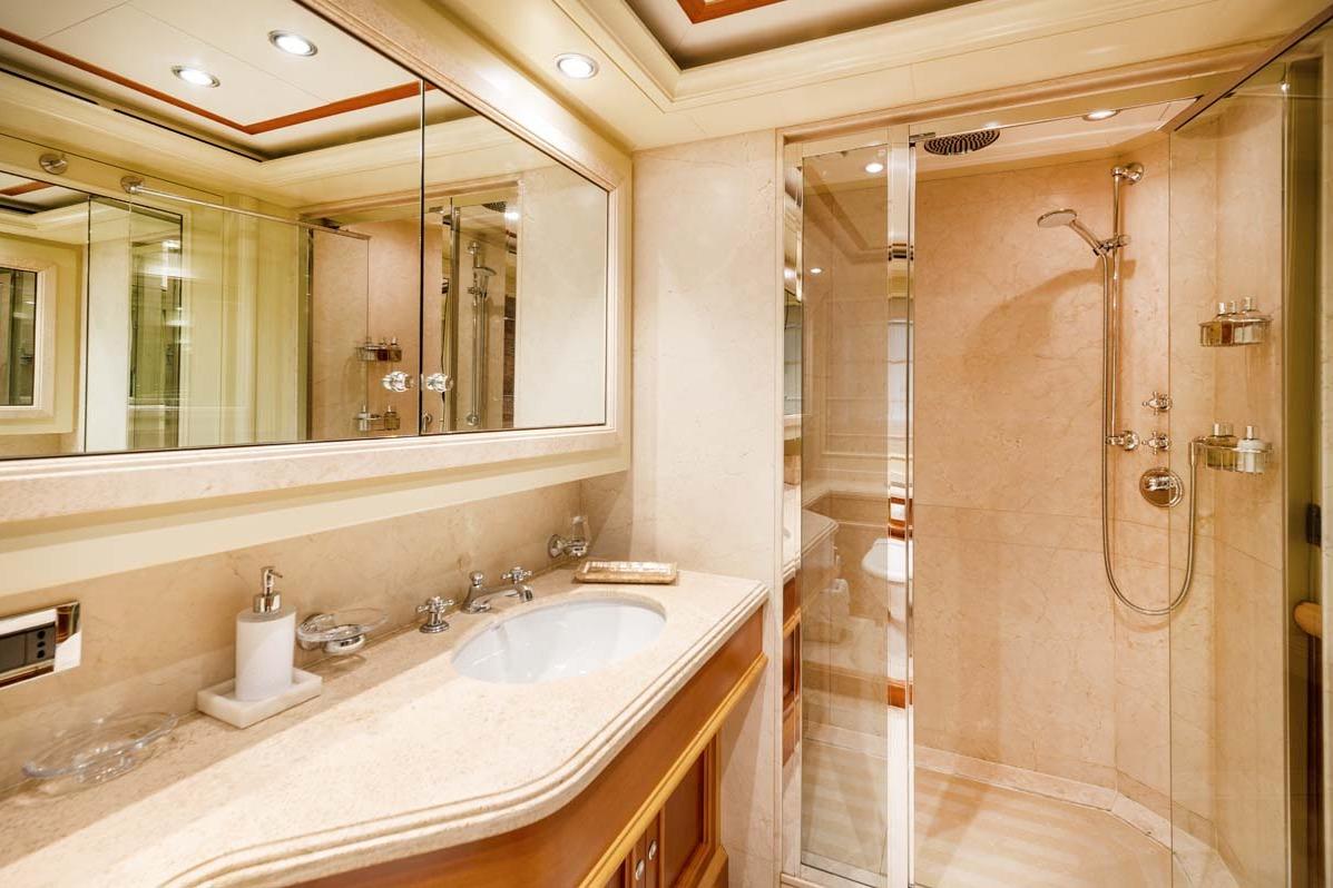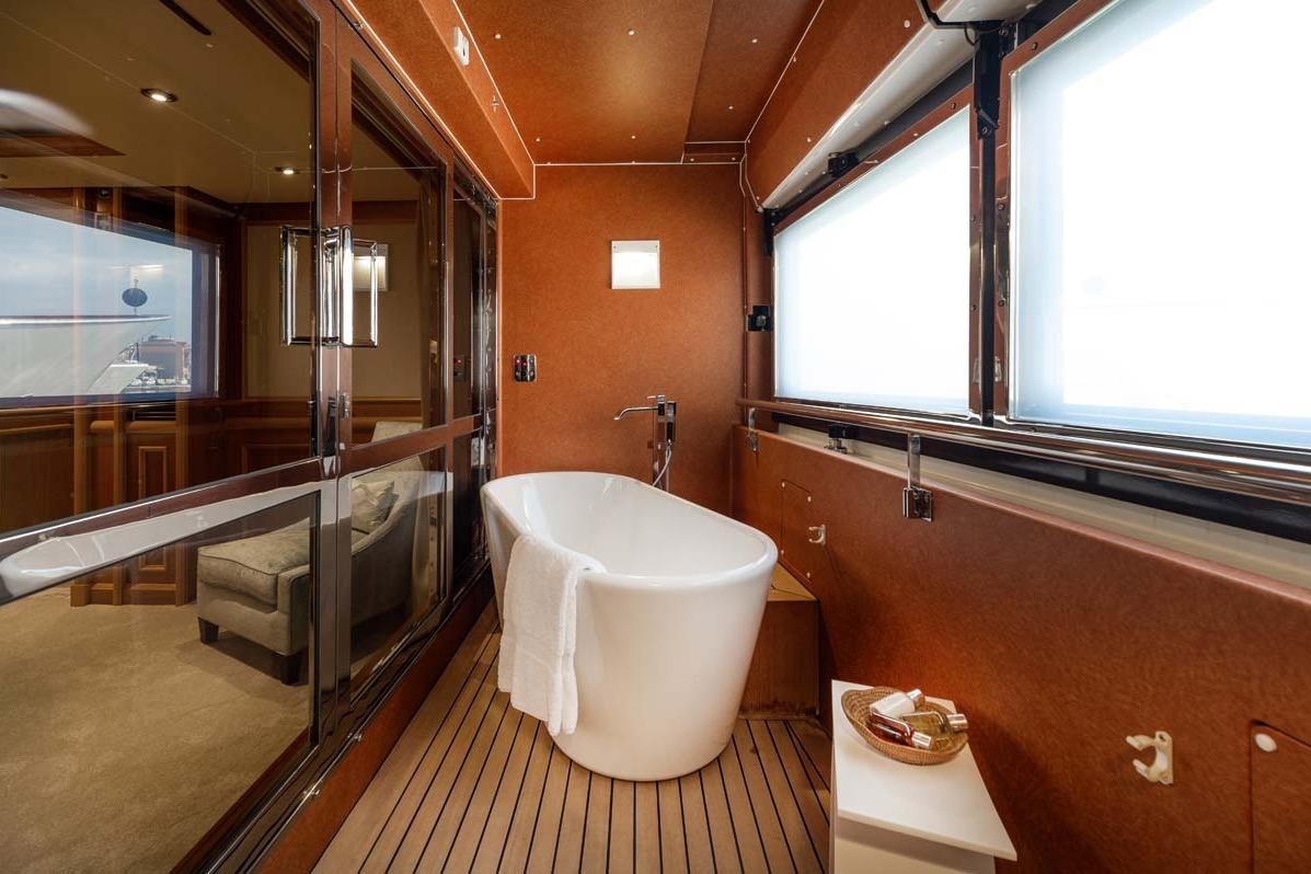 Полноширинная каюта владельца расположена в носовой части главной палубы и включает кровать king-size, кабинет, просторную гардеробную и две мраморные ванные комнаты «his & hers» с общим душем по центру. Имеется частный балкон по правому борту с ванной и «умным» стеклом.