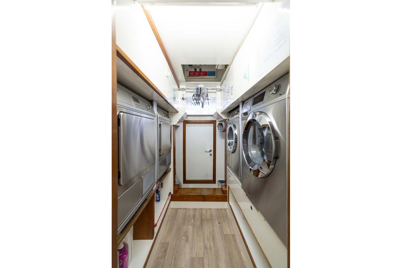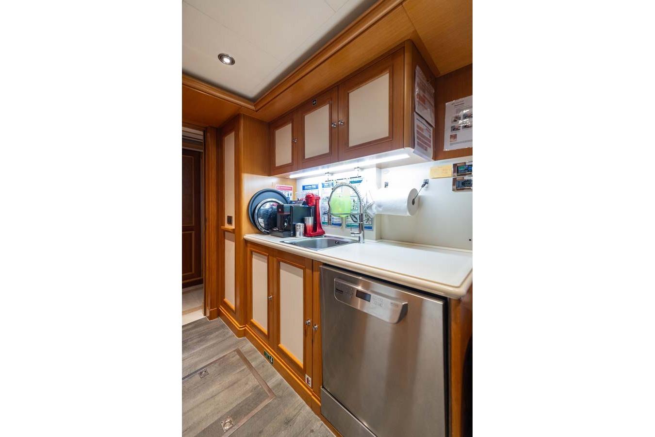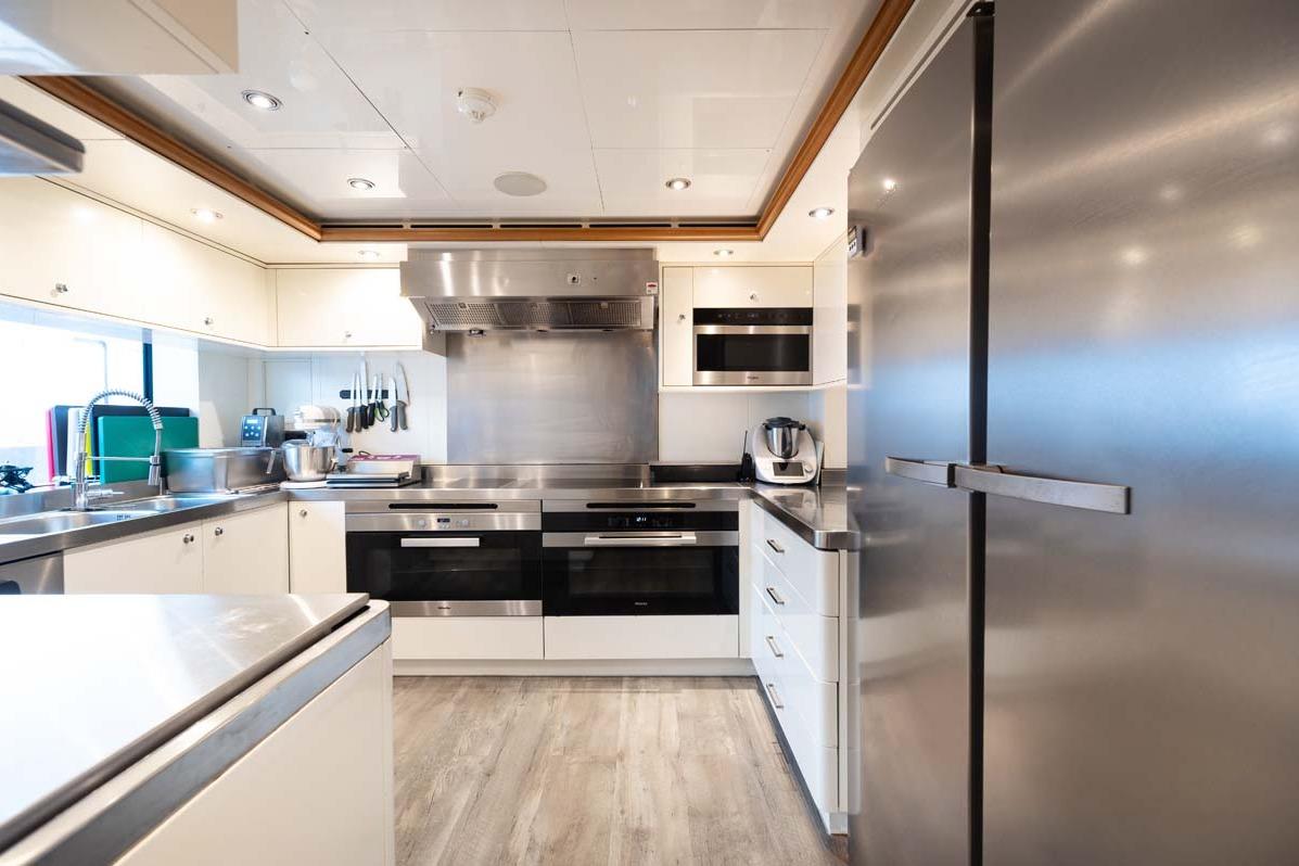 Доступ в камбуз возможен из обеденной зоны, с палубы экипажа или через холл владельца. Просторный камбуз оснащён рабочими поверхностями из нержавеющей стали и мощной вытяжкой с системой пожаротушения. Большое окно над мойкой обеспечивает отличное естественное освещение.
