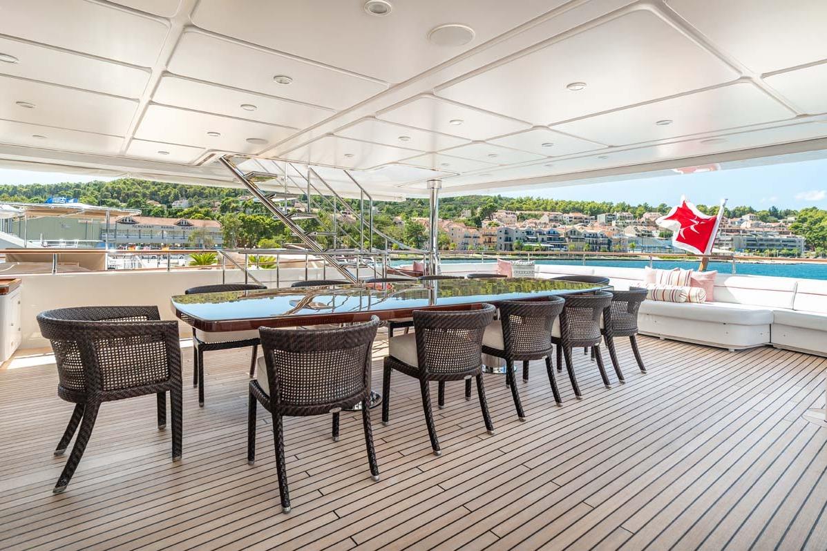В носовой части, между двумя витринами для посуды, расположен формальный обеденный салон с эффектной подсвеченной стеной из оникса. Большой стеклянный стол рассчитан на 12 персон. По обоим бортам — вместительные шкафы и большие окна. Слева по курсу — выход в сервисную зону и камбуз, справа — вход в частный холл владельца с дневным санузлом.