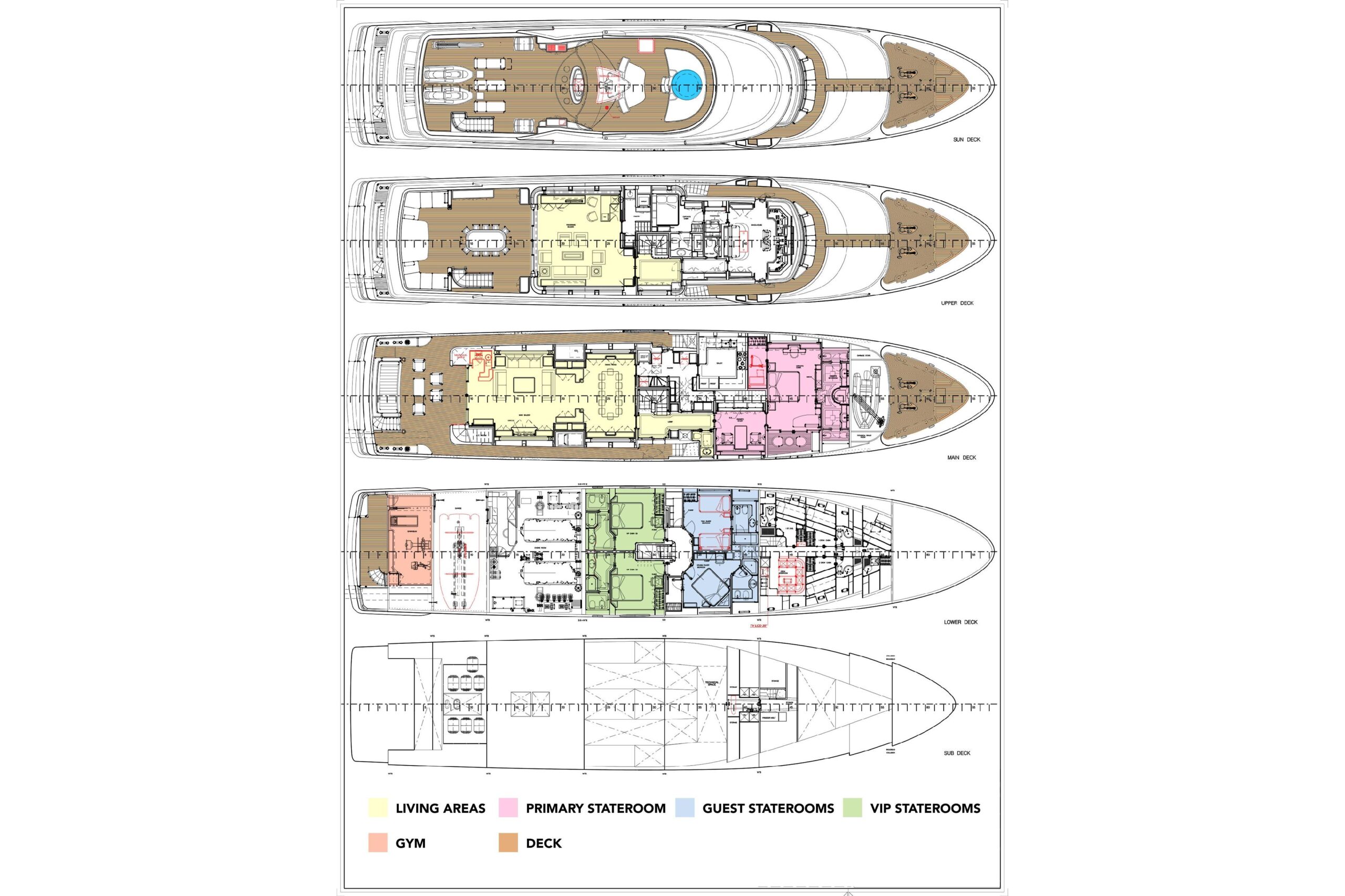 Вход в главный салон осуществляется через электрические раздвижные стеклянные двери во всю высоту. В салоне находится полностью оборудованный бар, секционный диван и отдельные кресла. В носовой части расположен формальный обеденный салон с эффектной подсвеченной стеной из оникса. По правому борту — главная лестница, ведущая на верхнюю палубу и вниз, к четырём гостевым каютам. На главной, бридж-деке и сан-деке предусмотрены дневные санузлы.