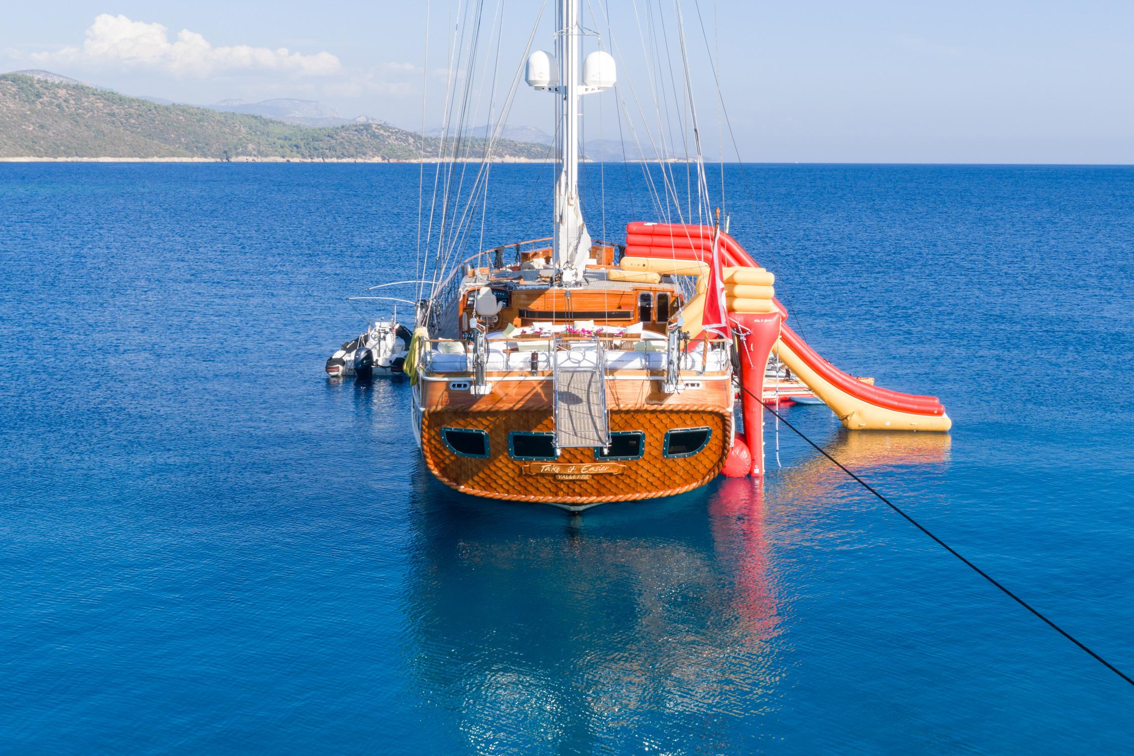 TAKE IT EASIER — гулет длиной 38,6 м, построенный в Бодруме и переданный владельцу в 2007 году, с масштабным рефитом в 2017 году, включая капитальную замену обшивки корпуса и полное обновление всех систем.