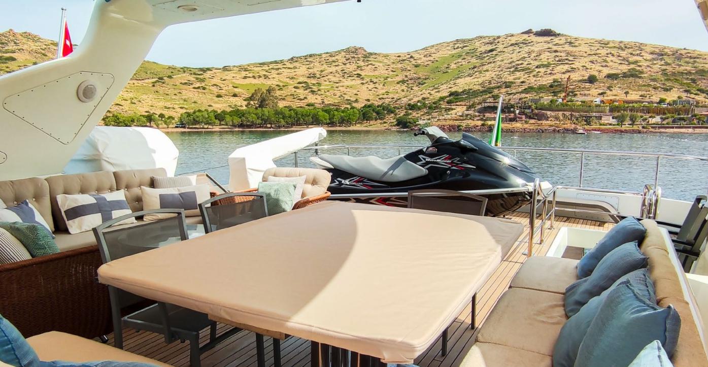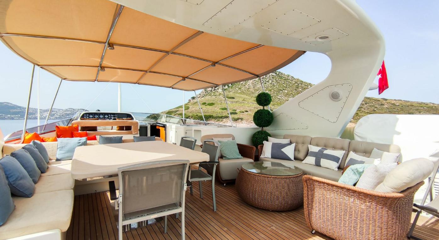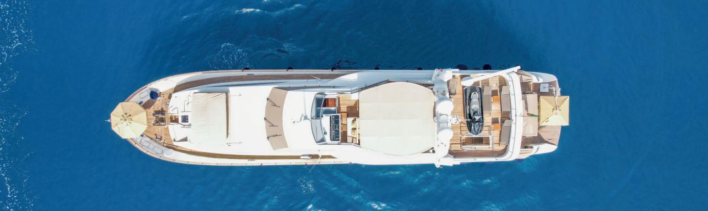 Внешние палубы спроектированы с акцентом на максимальное наслаждение отдыхом на открытом воздухе. Кормовая палуба располагает к обедам на свежем воздухе, а удобные проходы по левому и правому борту ведут к просторной купальной платформе, обеспечивая легкий доступ к воде. Проходные палубы позволяют свободно перемещаться к носовой части, а лестница с кормовой палубы ведет на просторный флайбридж. Здесь гостей ждут дополнительные зоны для обедов под открытым небом, полностью оборудованный бар и зона для принятия солнечных ванн — идеальное место для отдыха под солнцем.