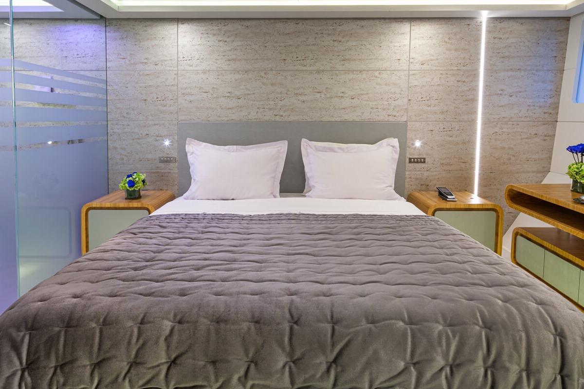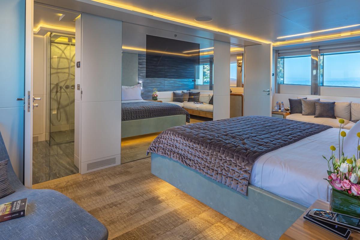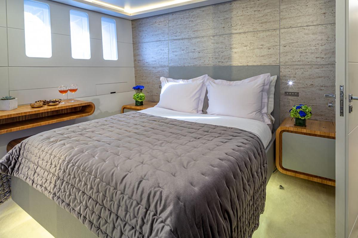 Будучи одной из немногих яхт в своём классе с планировкой из шести кают, она размещает до 12 гостей в 6 каютах с ванными комнатами en-suite, включая полноширинную мастер-каюту на главной палубе. Последние обновления включают полностью переосмысленные зоны сандека и носовой палубы, которые были преобразованы в элегантные пространства для отдыха на свежем воздухе с карбоновыми опорами тента и высокопрочными навесами.